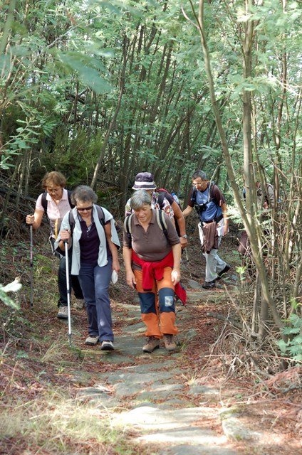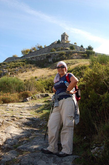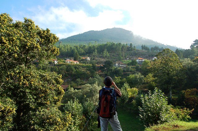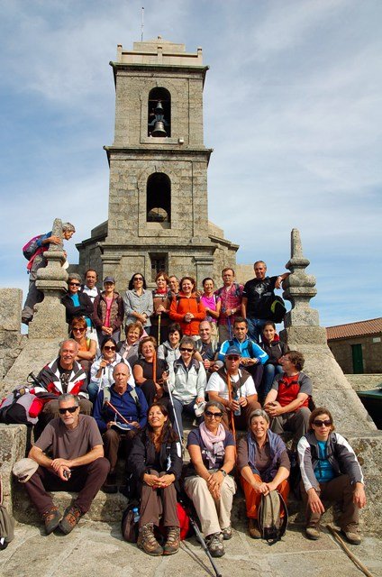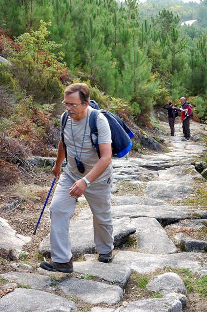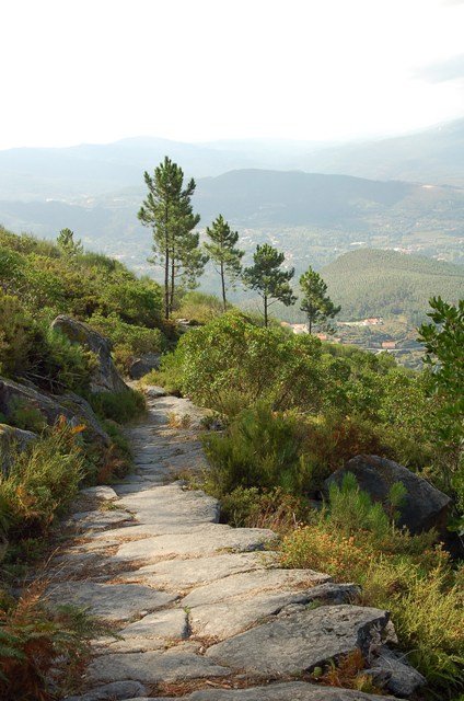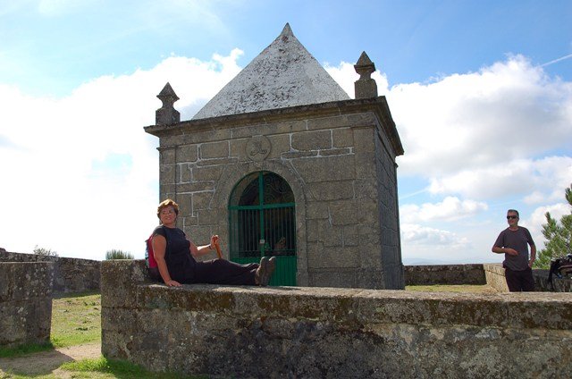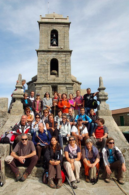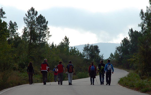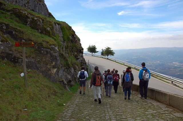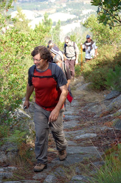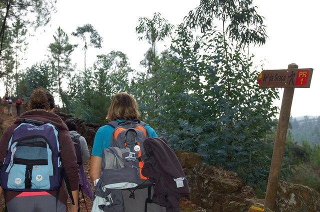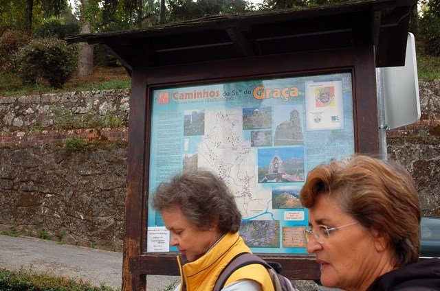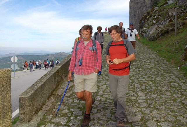 Retomando o percurso, agora já de forma mais acentuada e em típica calçada de peregrinos os primeiros sintomas de esforço iam-se já fazendo sentir, mas nada que fizesse perder a vontade de atingir o alto. Ao longo da calçada ziguezagueante, de quando em quando todo o grupo parava para estender a vista para baixo, pois entre a bruma da manhã que se ia dissipando e nos permitia uma maravilhosa vista sobre terras de Mondim. Também de quando em vez por entre a floresta conseguia-mos já divisar sobre as nossas cabeças bem lá para cima no topo do afunilado monte o templo da Sra. Da Graça.