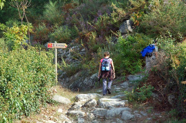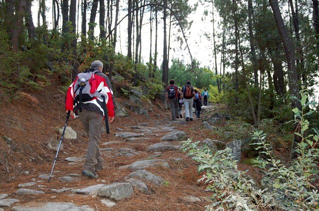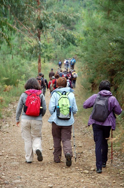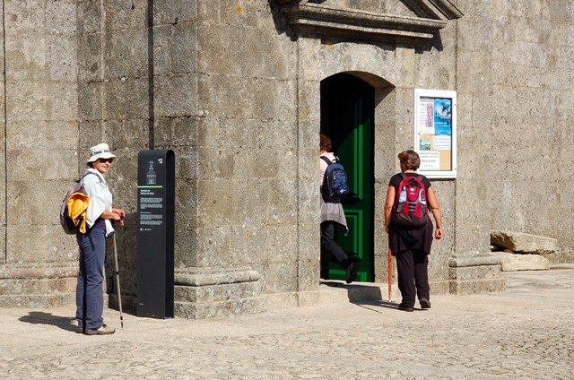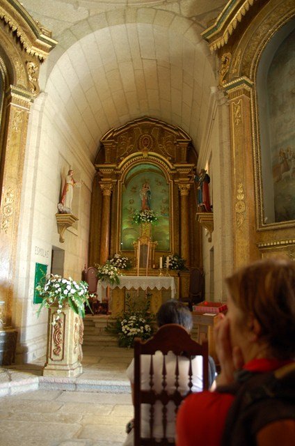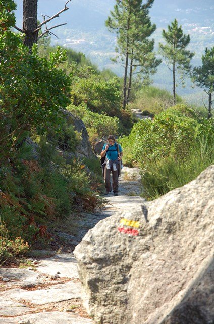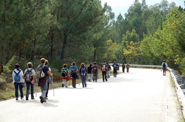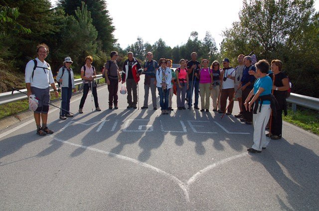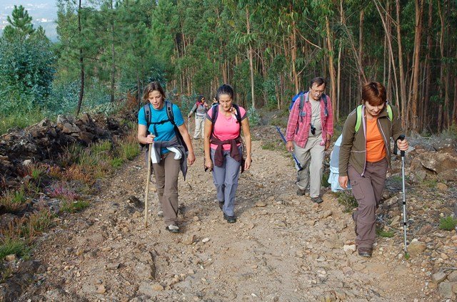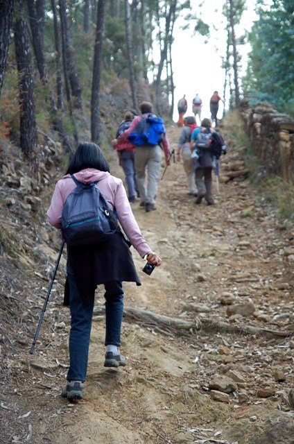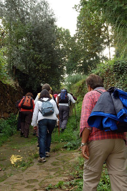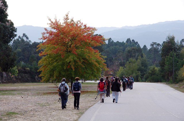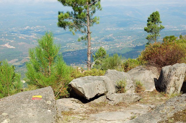 Retomando o percurso, agora já de forma mais acentuada e em típica calçada de peregrinos os primeiros sintomas de esforço iam-se já fazendo sentir, mas nada que fizesse perder a vontade de atingir o alto. Ao longo da calçada ziguezagueante, de quando em quando todo o grupo parava para estender a vista para baixo, pois entre a bruma da manhã que se ia dissipando e nos permitia uma maravilhosa vista sobre terras de Mondim. Também de quando em vez por entre a floresta conseguia-mos já divisar sobre as nossas cabeças bem lá para cima no topo do afunilado monte o templo da Sra. Da Graça.