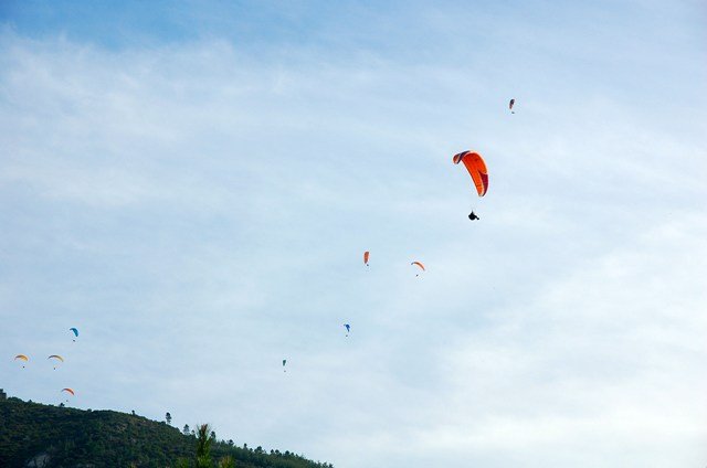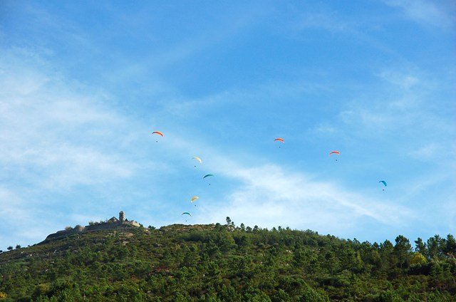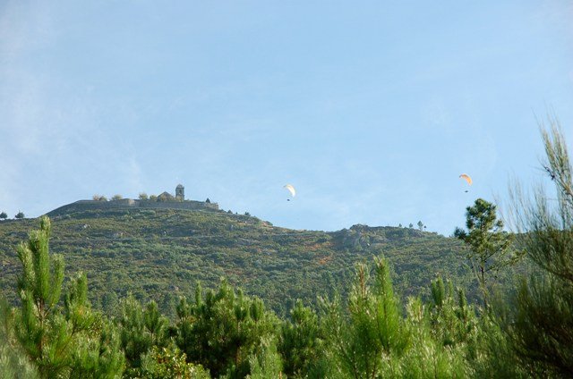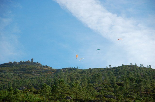 Continuamos a descer até se atingir parte da estrada em alcatrão por onde seguimos, passando junto ao Clube de parapente cujos muitos praticantes lançados de junto do Alto da Sra. Da Graça e sob um dia talvez propicio a este tipo de actividade enchiam o céu esvoaçando bem lá pelo alto sobre as nossas cabeças.
