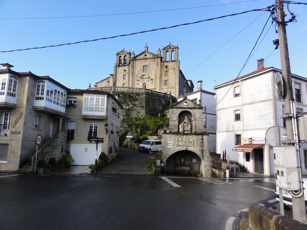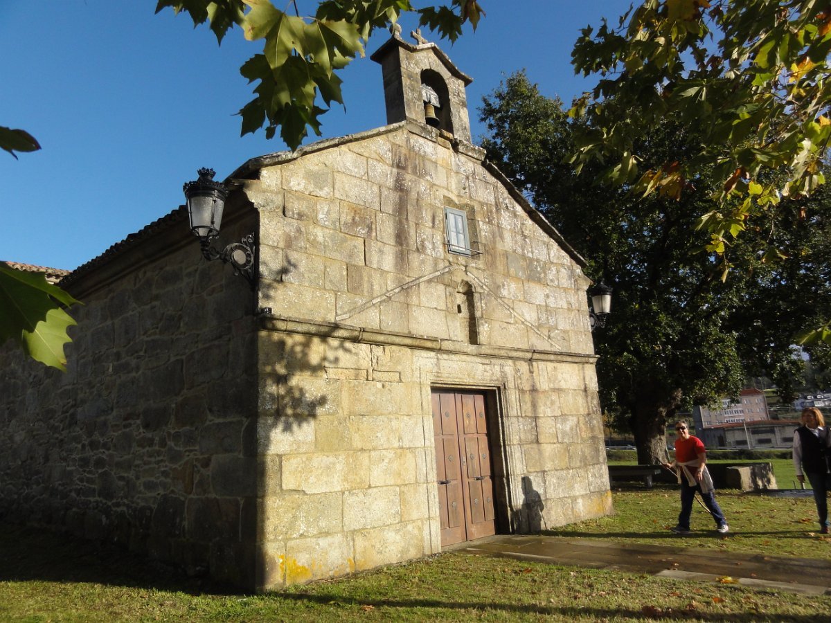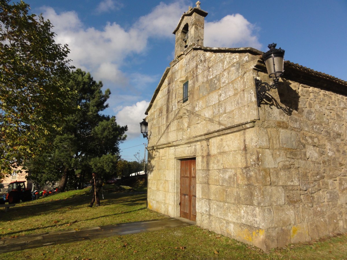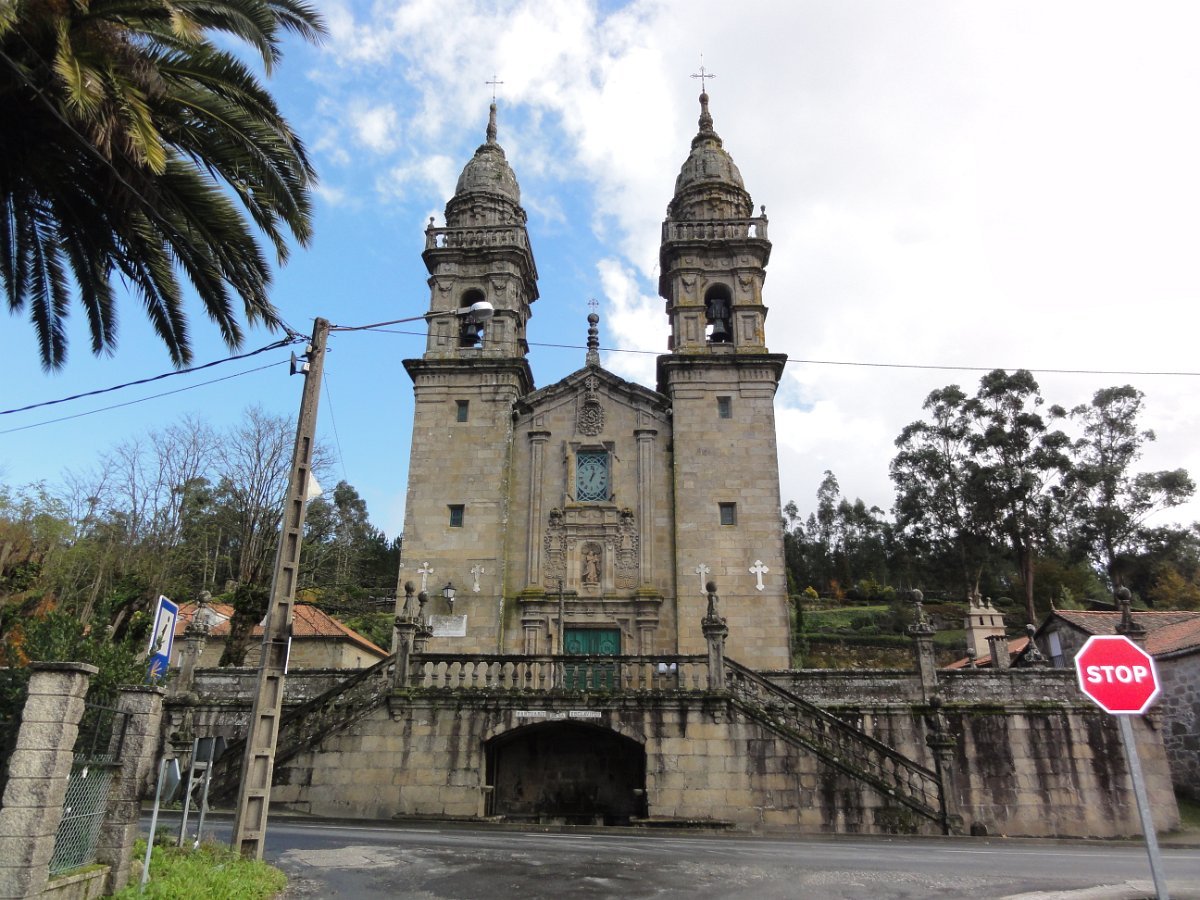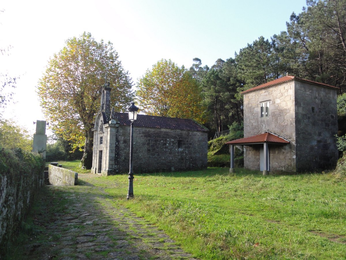 Passada Iria Flavia seguimos mais uma vez a N550, ao longo de um quilómetro saindo depois para poente para percorrer o curioso enfiamento de aldeias - Romaris, Rueiro, Cambelas, Anteportas, Tarrío e Vilar - até chegar, de novo, junto à N550, ao magnífico Santuário da Nosa Señora da Escravitute.
