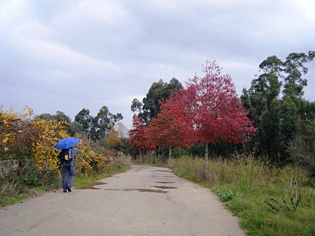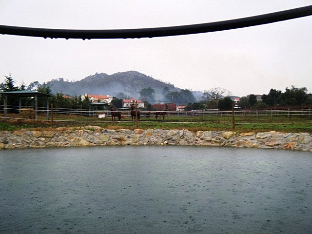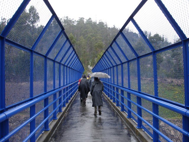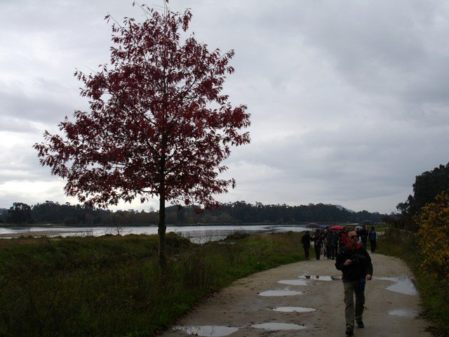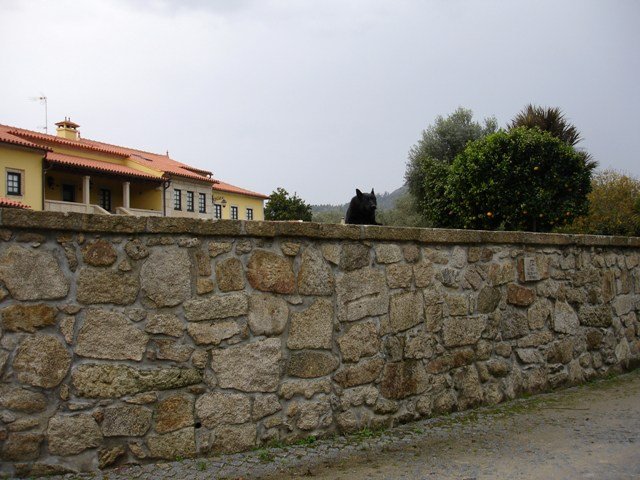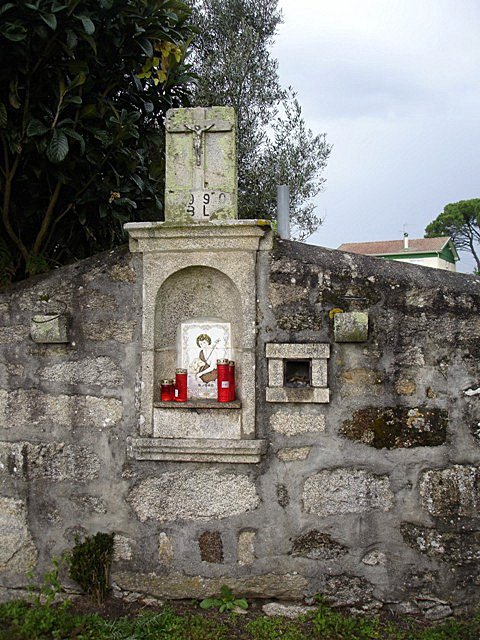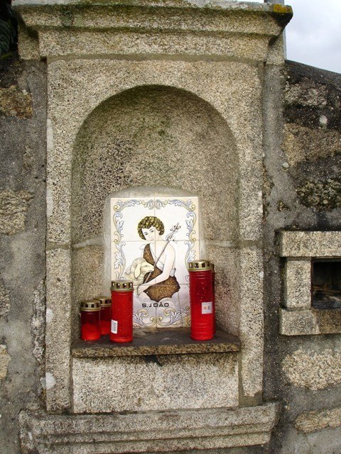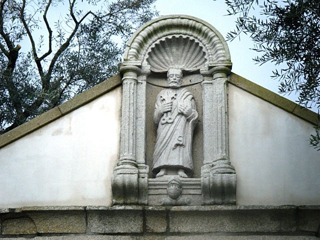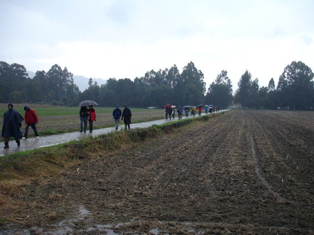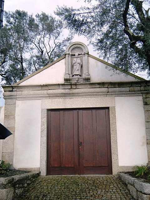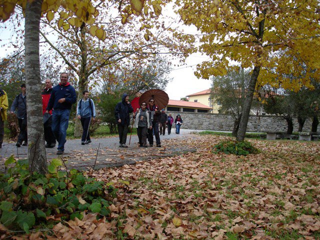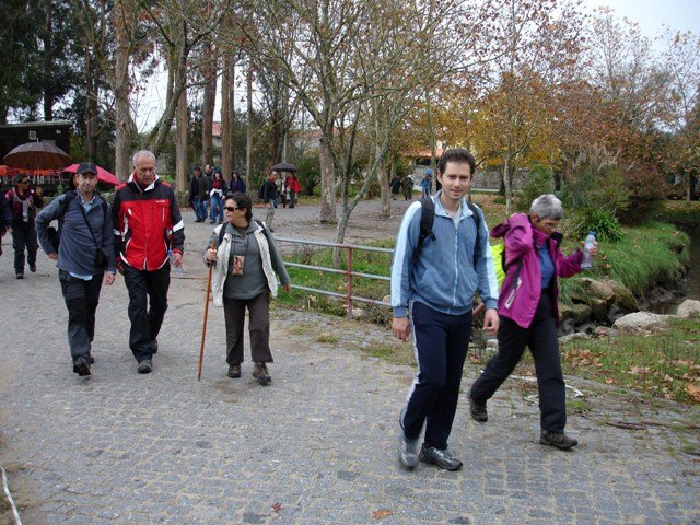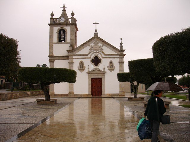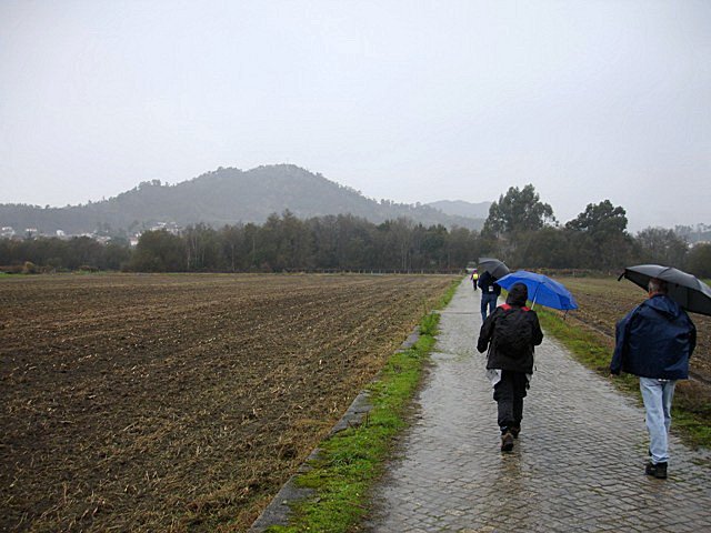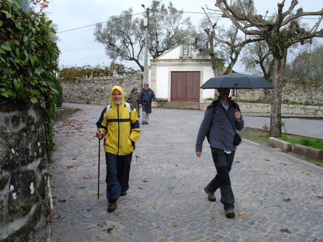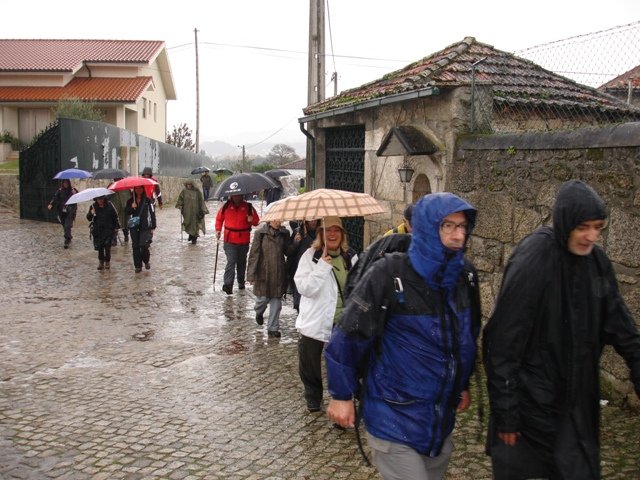 A marcha ia continuando agora (11H00) sobre uma chuva forte que ia já incomodando, principalmente aos menos cautelosos. A certa altura deixamos a beira-rio e caminhamos para o interior da freguesia, já com o Monte de S. Silvestre na nossa frente, bem lá no alto com a sua pequena capela. Passamos junto à Quinta de D. Sapo (passe a publicidade) e cruzando a estrada Nacional passamos junto à capela do Senhor dos Passos e logo acima pela igreja Paroquial de S. João mas cujo patrono é S. Tiago, que assim assinala a antiga via de peregrinação ao apóstolo.