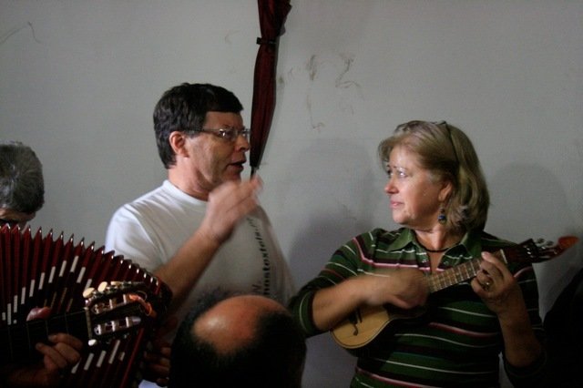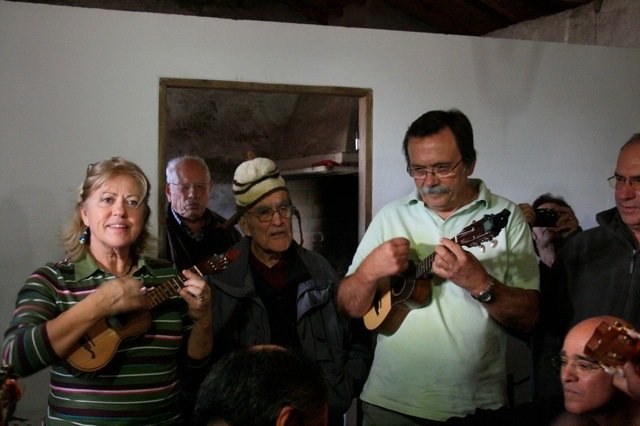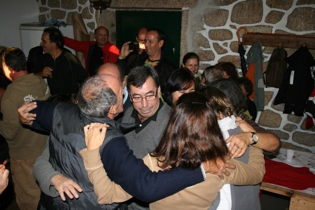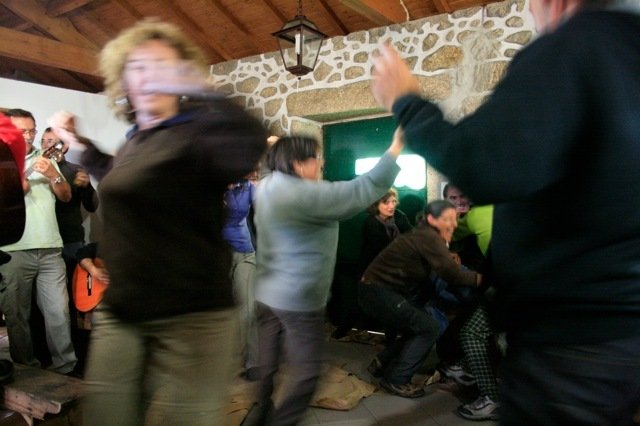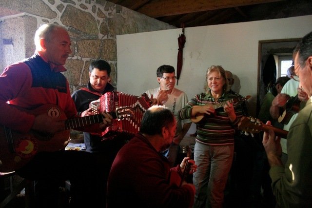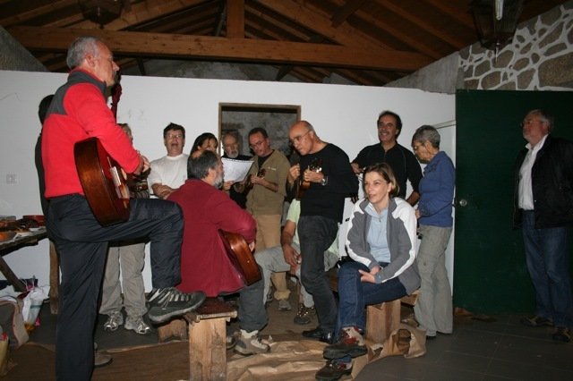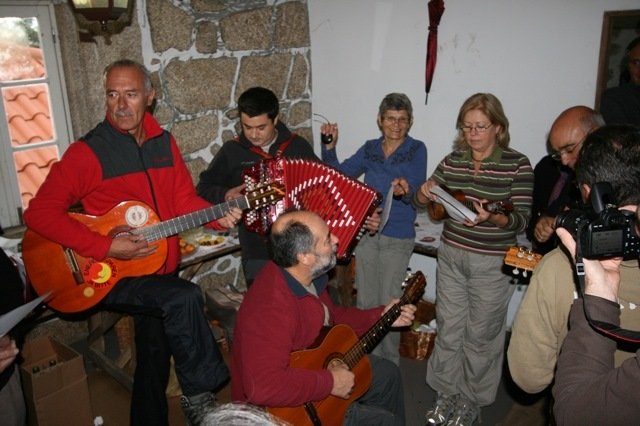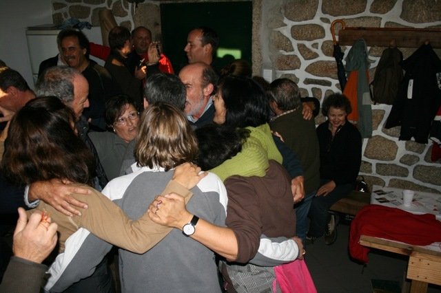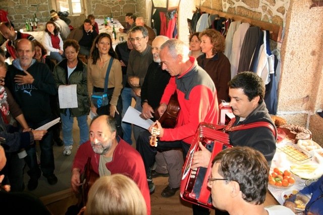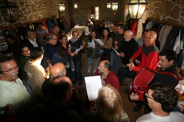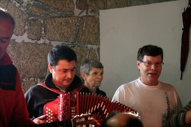 Entre a cozinha e a sala, a tocata improvisada do Vianatrilhos bota música popular e folclórica, com toda a maestria, desde o cavaquinho, acordeão, viola e concertina, e logo saltitam bailadores e bailarinas, numa nesga de soalho, mais parecendo um baile de paróquia, exibindo seus dotes dançarinos. A Augusta e a Glória acabaram por se destacar pela graça e destreza e até o Fernando Vilaça me convidou para um pé de dança, mas estava dia não, ah! ah! No cômputo geral, imperou a boa disposição e camaradagem e depois do bagaço com mel…(o nosso conhecido Brandy mel dos convívios no fim das caminhadas, em S. Lourenço da Montaria).