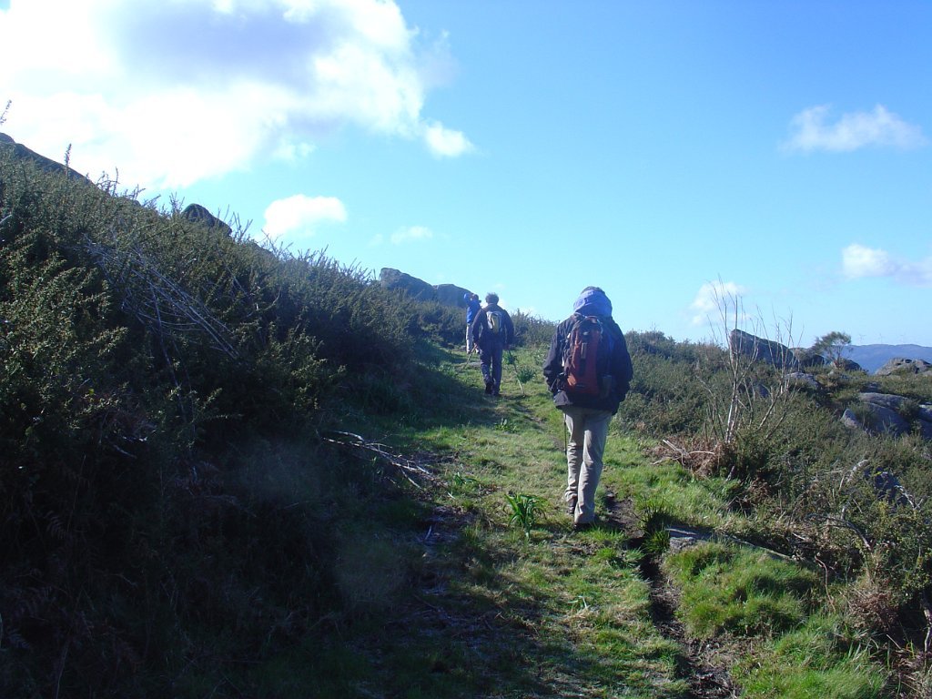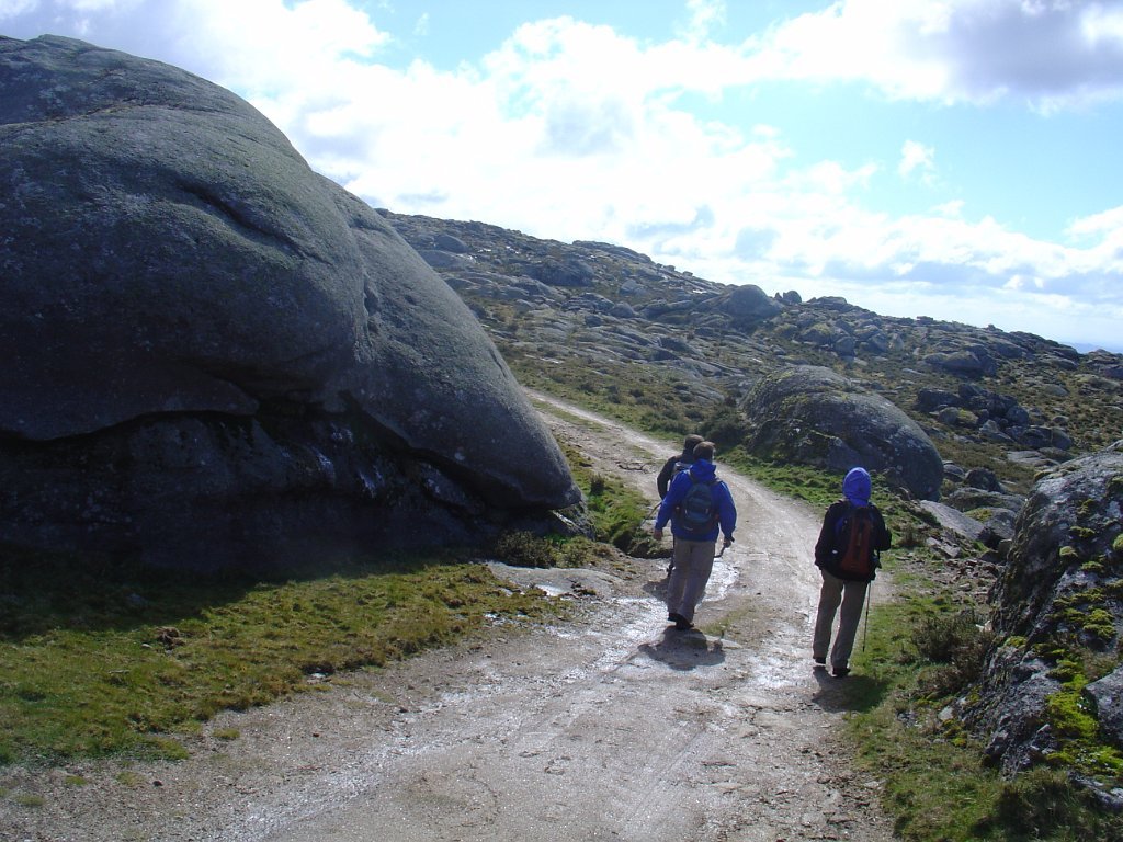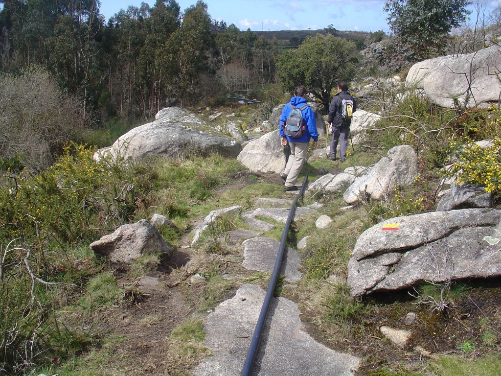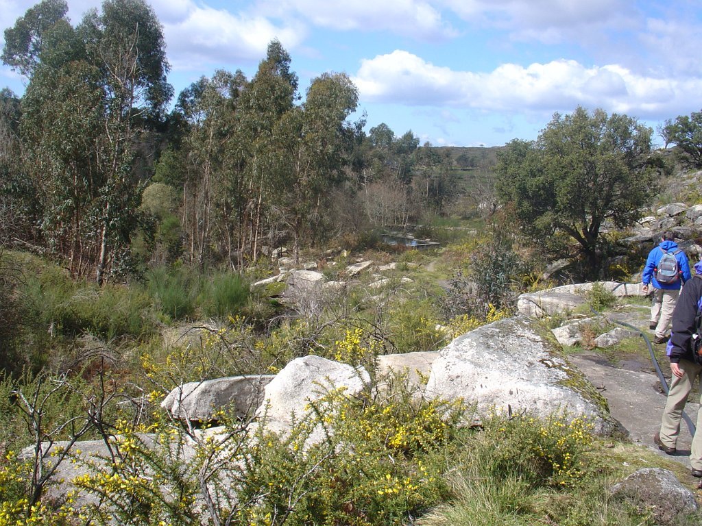 Seguimos para o marco geodésico da Pedra Alçada e tirada a foto de grupo, descemos até ao cruzamento da Chã do Guindeiro, caminho de peregrinos que vem de S. Lourenço da Montaria.