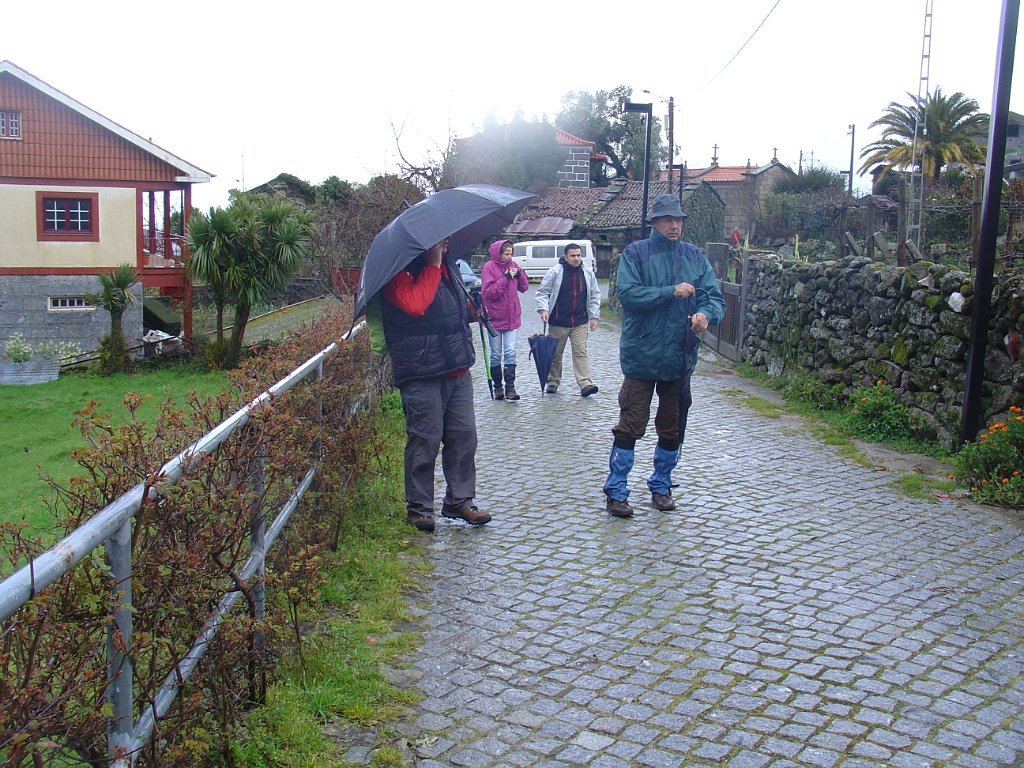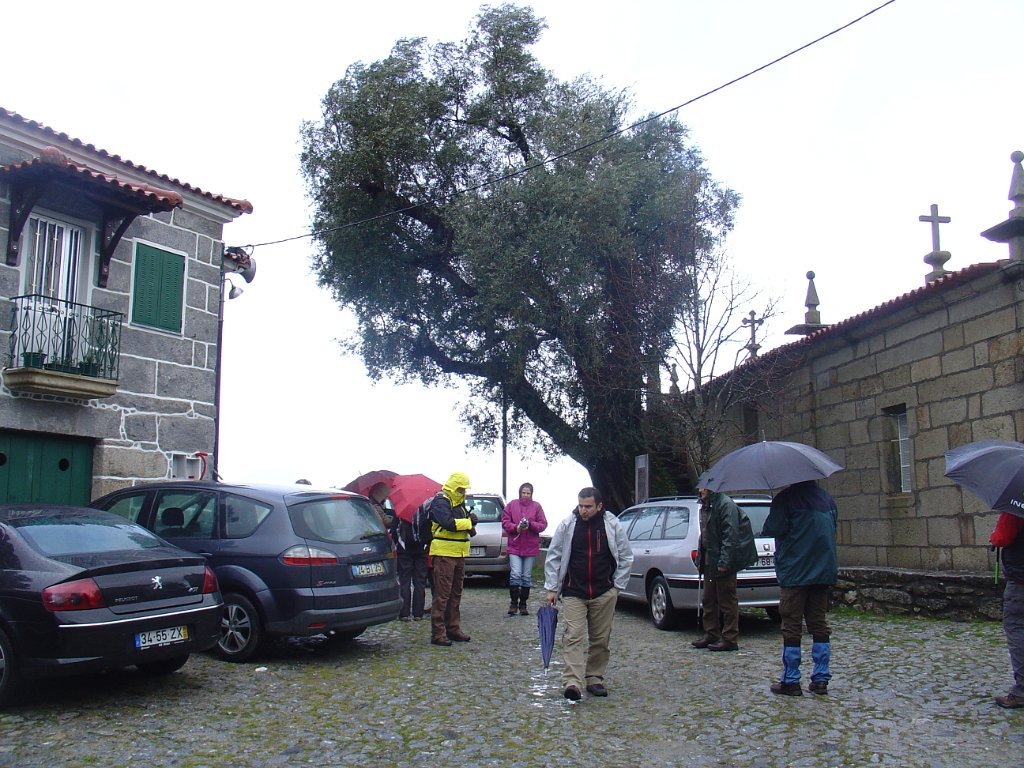 Chegados a Germil, o lugar da concentração foi no adro da capela da aldeia, onde estacionamos as viaturas. Trocadas as saudações com os companheiros que entretanto tinham já chegado, a chuva fez nova aparição, comprometendo desde o início a intenção de fazer o percurso inicialmente previsto.