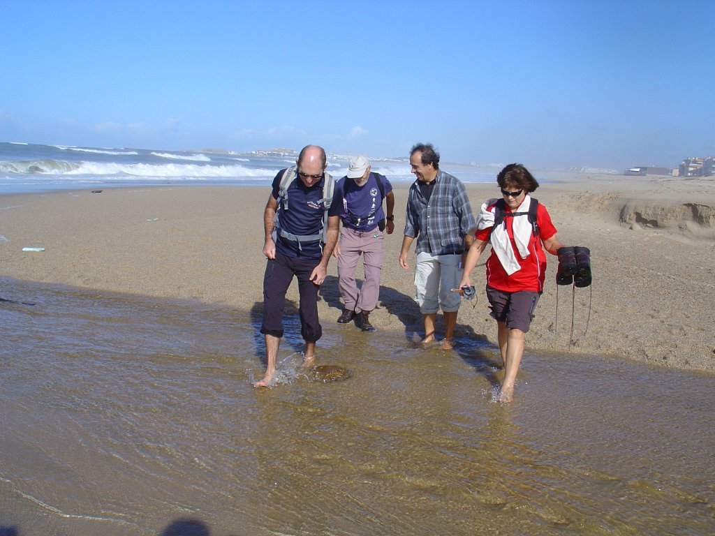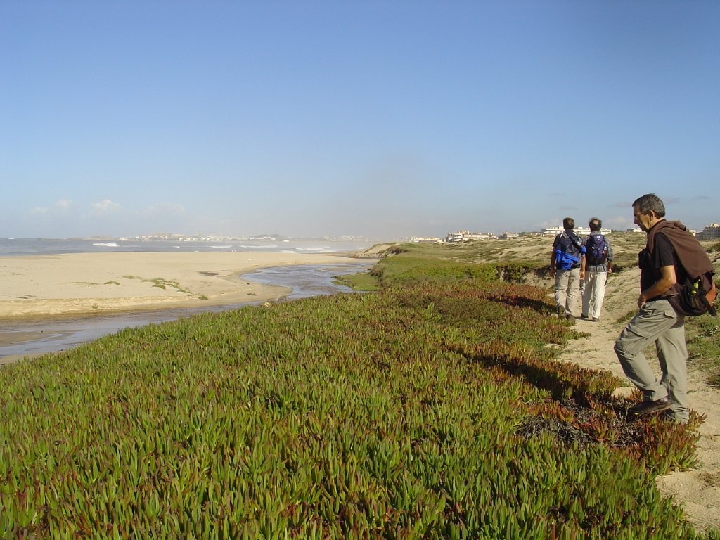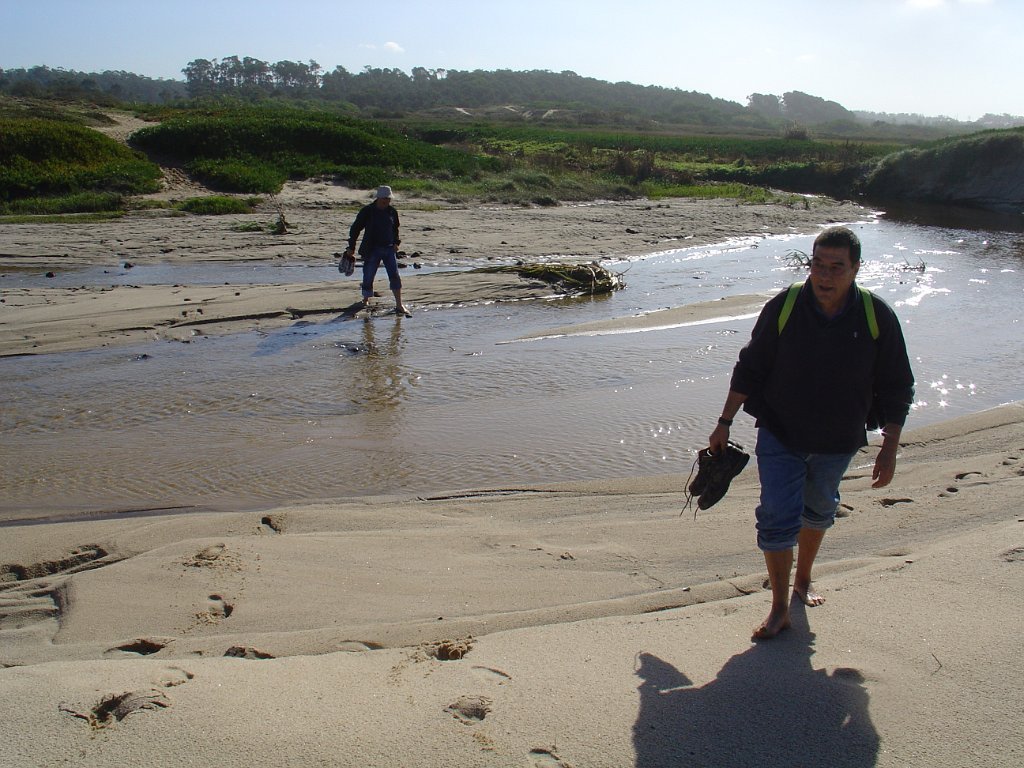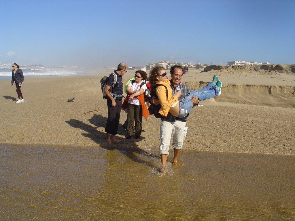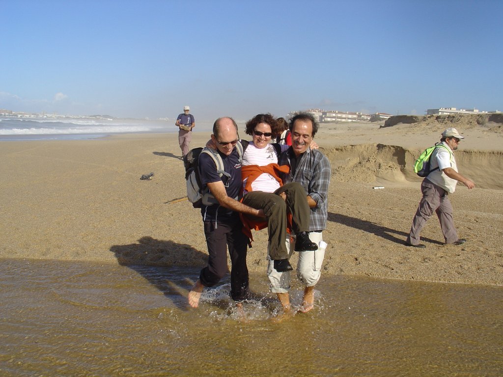 É pena que não haja uma continuidade desses passadiços ao longo das dunas, pois seria bem mais agradável fazer o percurso, com o mar sempre à vista, sem ter que sistematicamente procurar alternativas à falha de passagem pelo litoral. E foi um desses troços que motivou algumas belas fotos e muita risada. De repente, a meio de um areal, ficamos com a progressão cortada por um regato! Voltar atrás, nem pensar!