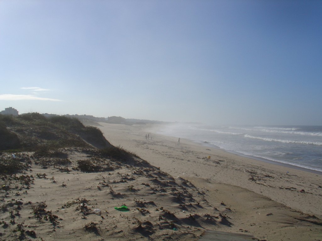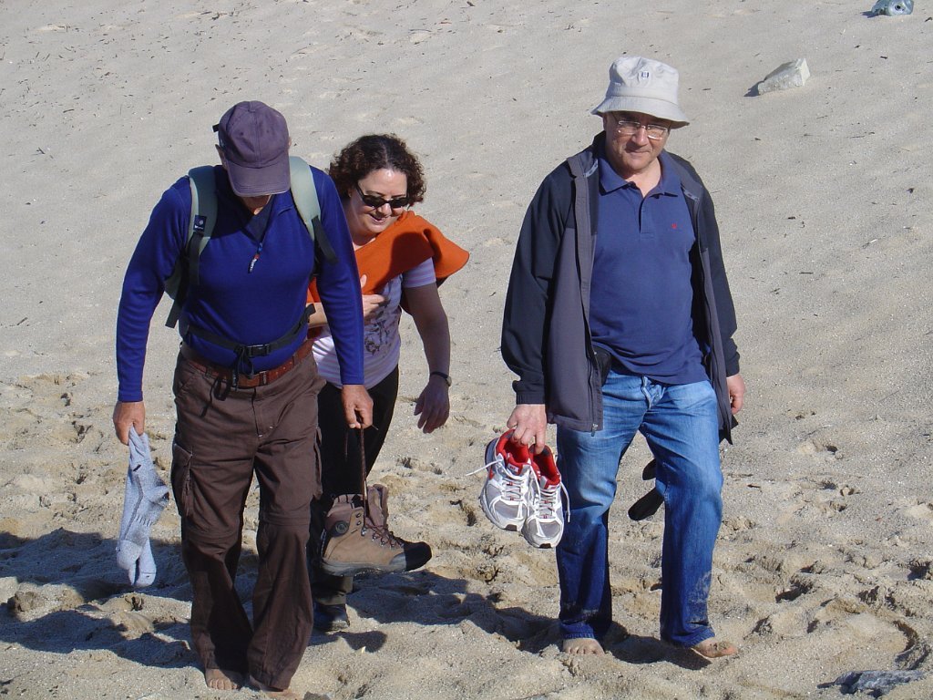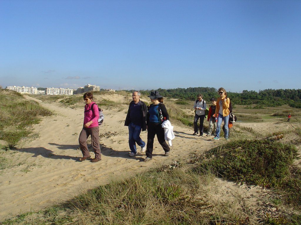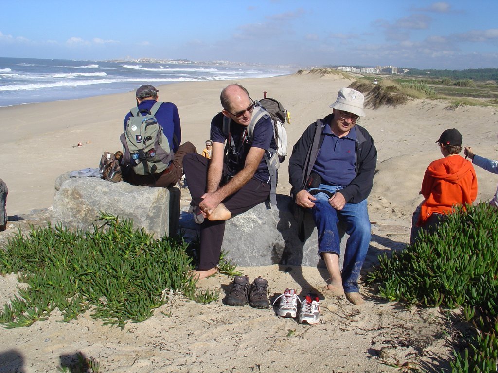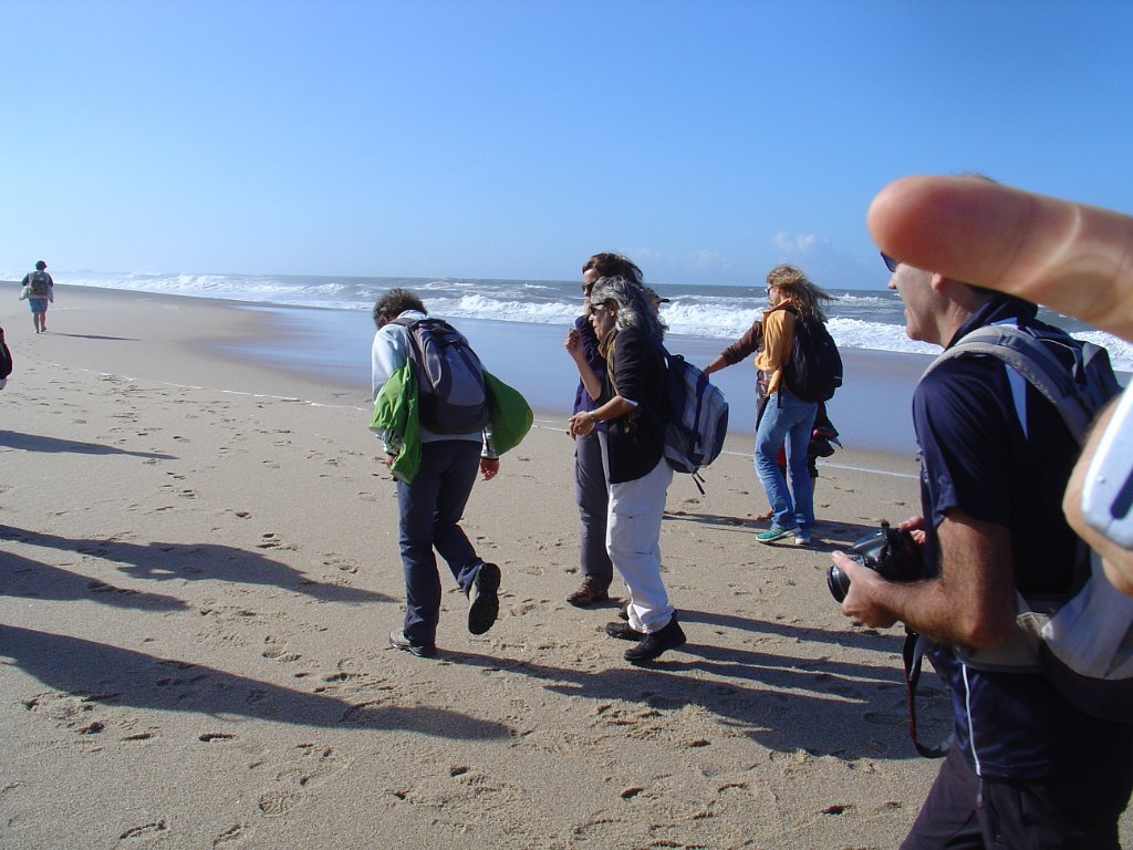 É pena que não haja uma continuidade desses passadiços ao longo das dunas, pois seria bem mais agradável fazer o percurso, com o mar sempre à vista, sem ter que sistematicamente procurar alternativas à falha de passagem pelo litoral. E foi um desses troços que motivou algumas belas fotos e muita risada. De repente, a meio de um areal, ficamos com a progressão cortada por um regato! Voltar atrás, nem pensar!