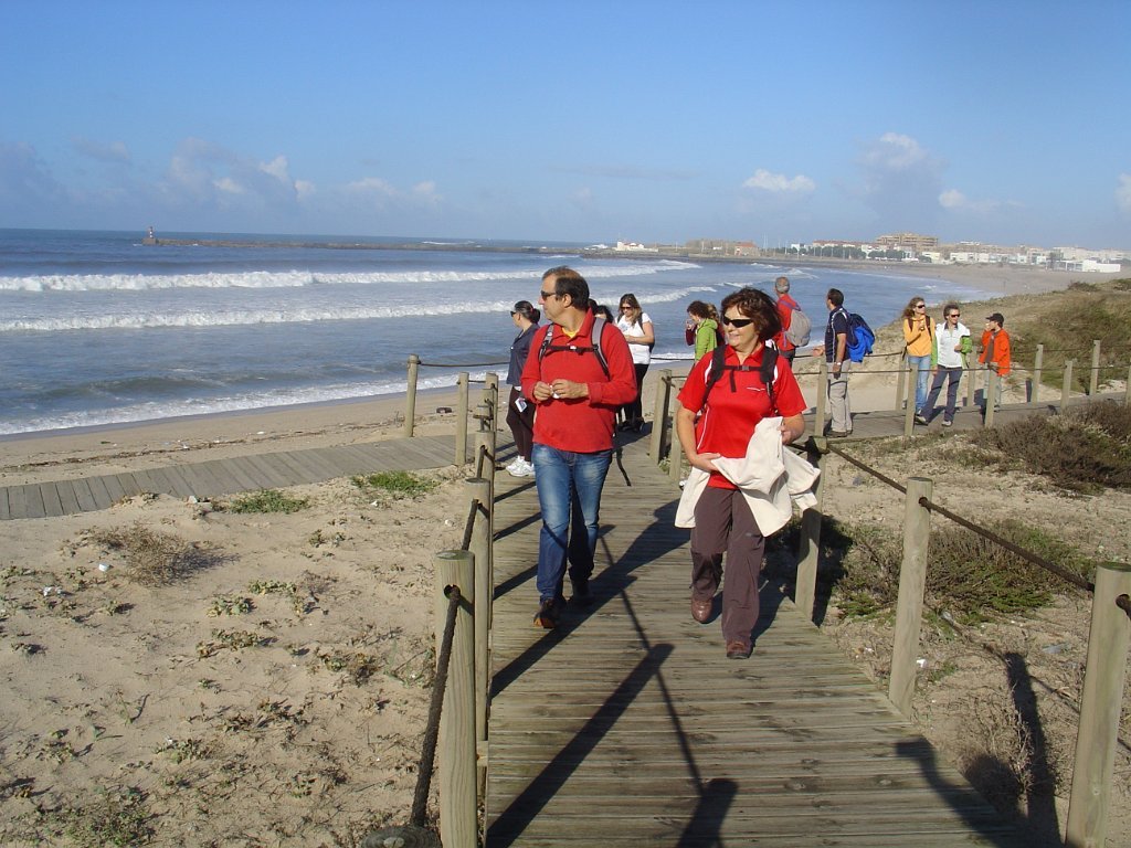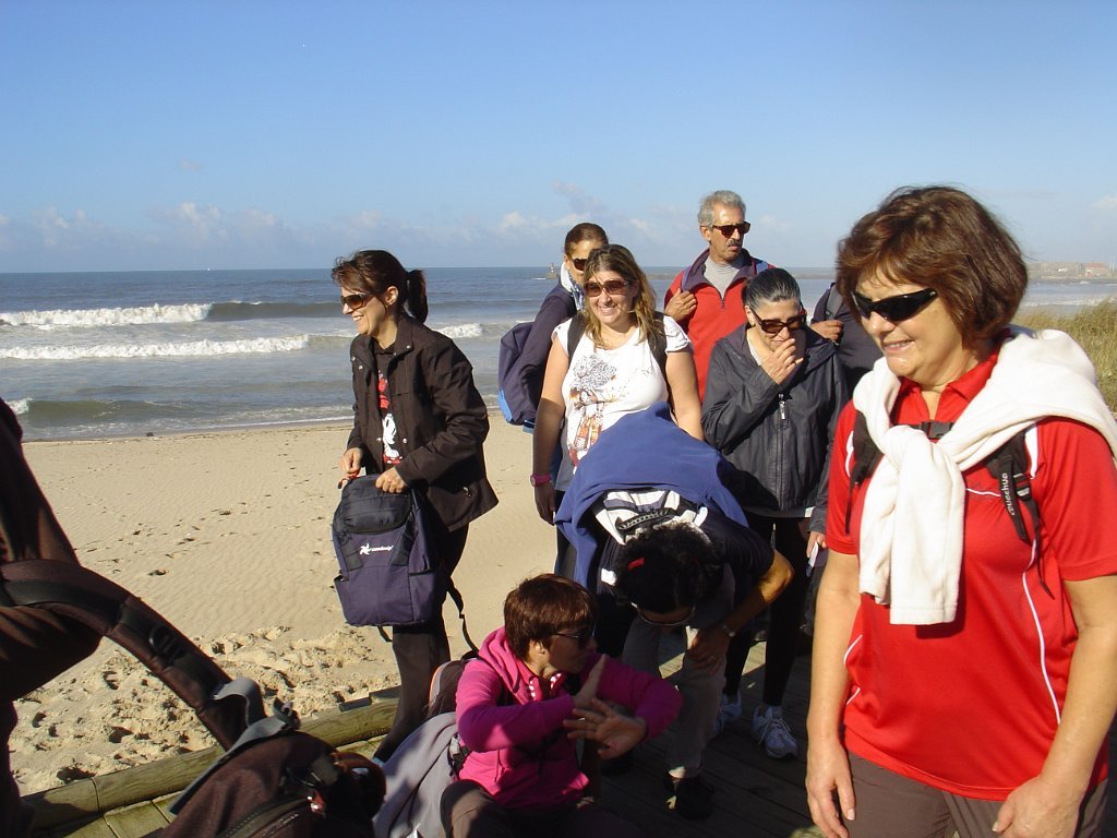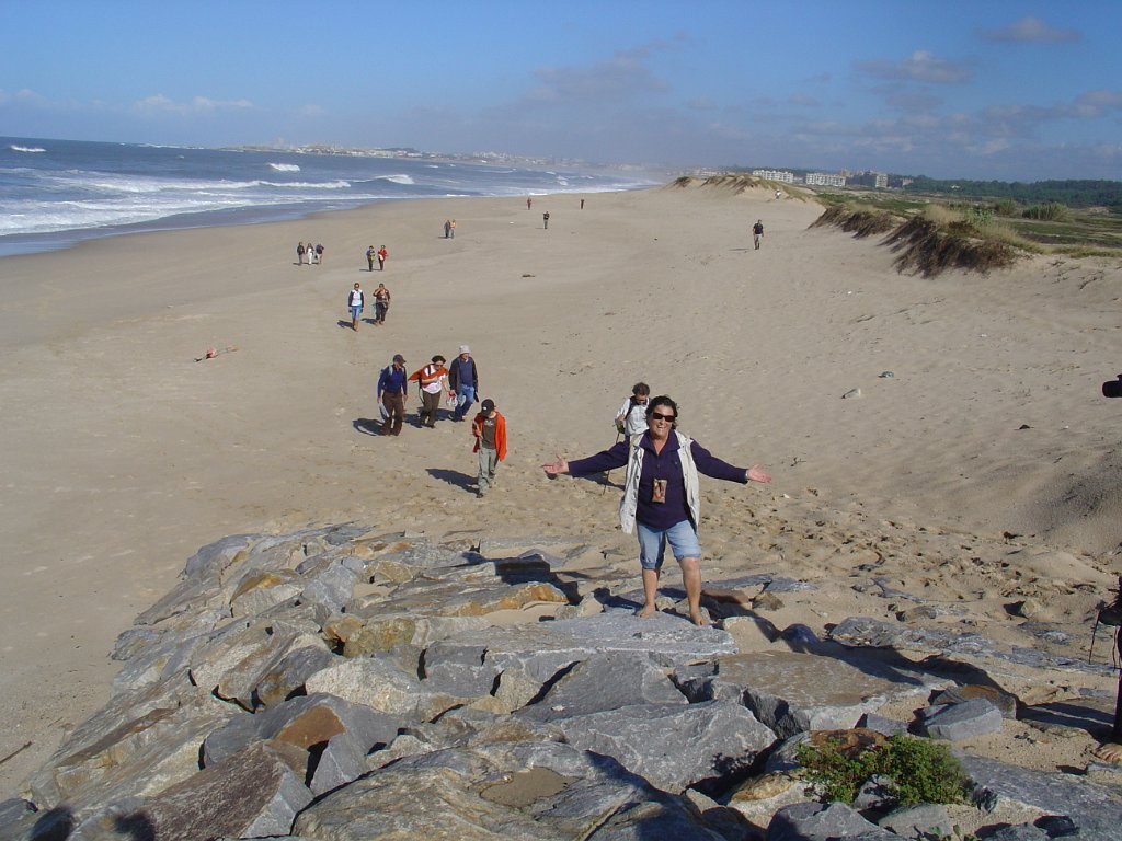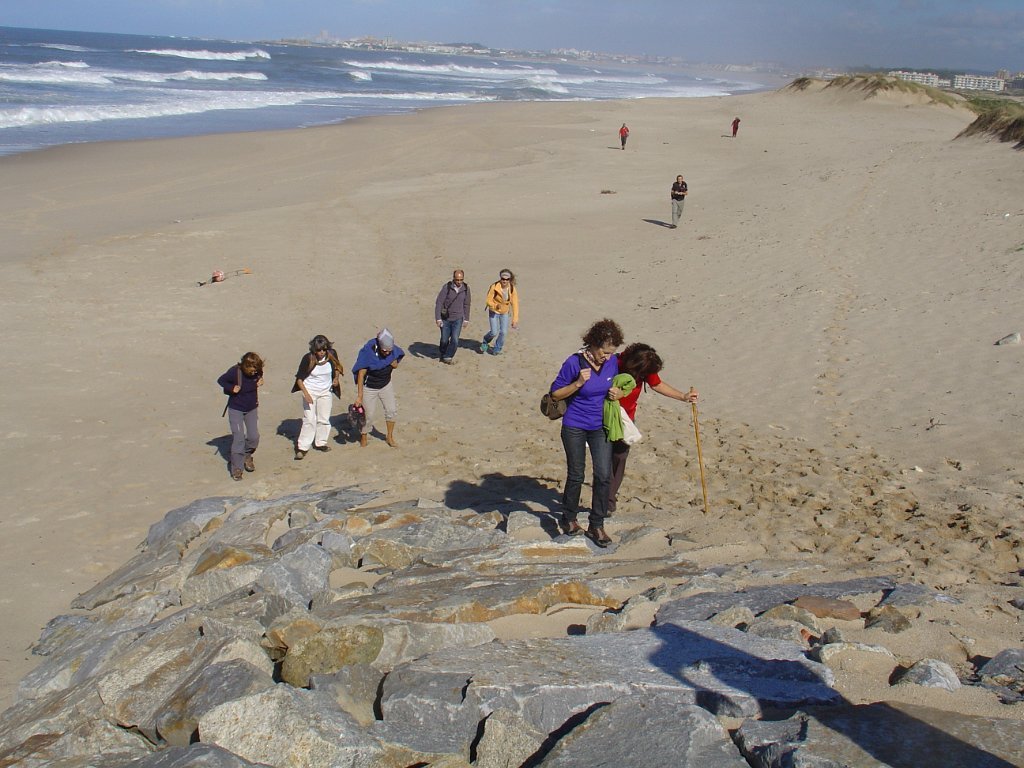 Fomos andando pela beira-mar, mas a páginas tantas, tivemos de nos descalçar para saltar um riacho e alcançar o areal e todas as praias a norte até ao Mindelo, Vila-Chã e às portas de Lavra. Achei engraçada Vila Chã, portinho piscatório, com o seu casario marítimo típico, com bares e restaurantes, apelidados de Salitre, taskuinha, barraquinha, pucinho. Chegamos ao fim da caminhada, onde um marco geodésico e as pedras amoladoras marcam presença, para além do castro Sampaio, reminiscências vivas da presença de antepassados. Aqui mesmo aconchegamos o estômago e regressamos, depois, calcorreando ruas empedradas até ao metropolitano de superfície, atravessando Vila Chã, de lés-a-lés. Chegamos a Vila do Conde, onde pudemos admirar a rendilheira e as rendas de bilros, atividade que data do início do séc. XVII, a alfândega régia, onde se instala o Museu da construção naval e a mulher do pescador, sentada com um lenço na mão à espera do marido que anda na faina da pesca. A NAU quinhentista, em réplica, é digna de um olhar histórico.