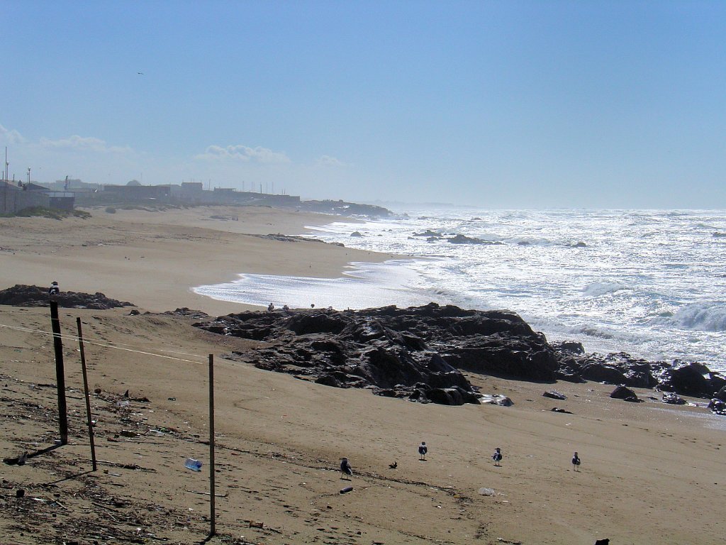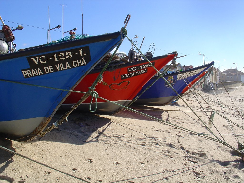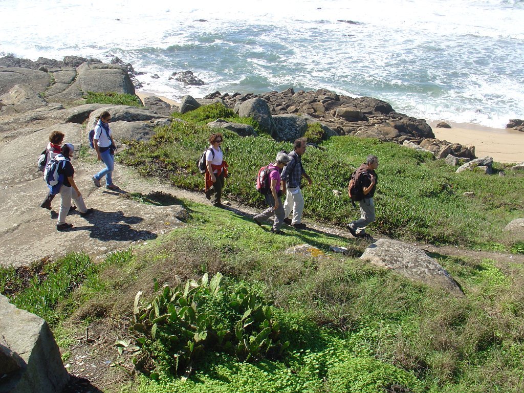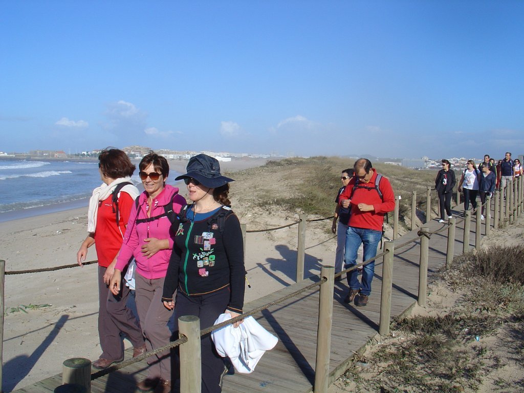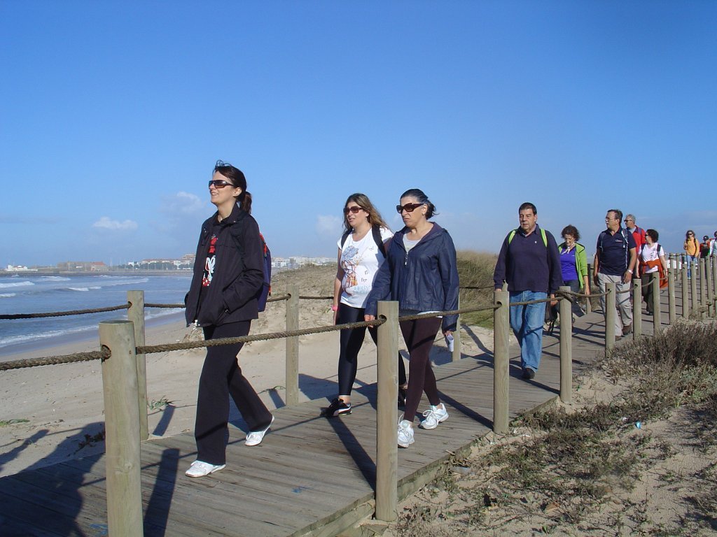 Fomos andando pela beira-mar, mas a páginas tantas, tivemos de nos descalçar para saltar um riacho e alcançar o areal e todas as praias a norte até ao Mindelo, Vila-Chã e às portas de Lavra. Achei engraçada Vila Chã, portinho piscatório, com o seu casario marítimo típico, com bares e restaurantes, apelidados de Salitre, taskuinha, barraquinha, pucinho. Chegamos ao fim da caminhada, onde um marco geodésico e as pedras amoladoras marcam presença, para além do castro Sampaio, reminiscências vivas da presença de antepassados. Aqui mesmo aconchegamos o estômago e regressamos, depois, calcorreando ruas empedradas até ao metropolitano de superfície, atravessando Vila Chã, de lés-a-lés. Chegamos a Vila do Conde, onde pudemos admirar a rendilheira e as rendas de bilros, atividade que data do início do séc. XVII, a alfândega régia, onde se instala o Museu da construção naval e a mulher do pescador, sentada com um lenço na mão à espera do marido que anda na faina da pesca. A NAU quinhentista, em réplica, é digna de um olhar histórico.
