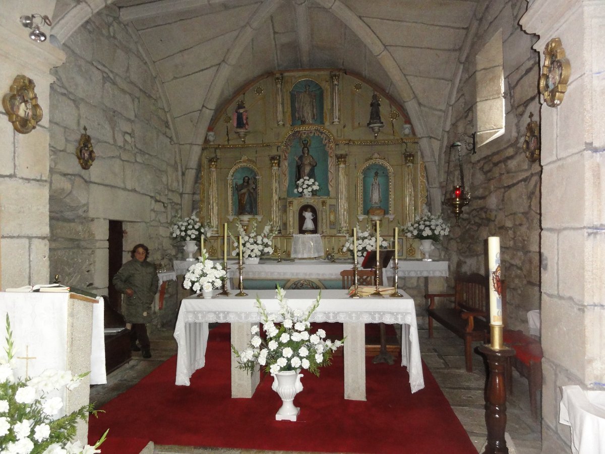 Depois da foto de grupo na Eira da Cera, local em que era estendida a cera para ser branqueada, descemos à igreja de Santa María de Paraños, onde pudemos apreciar o seu interior, festivamente decorada com cravos brancos, certamente como decoração de próxima boda.