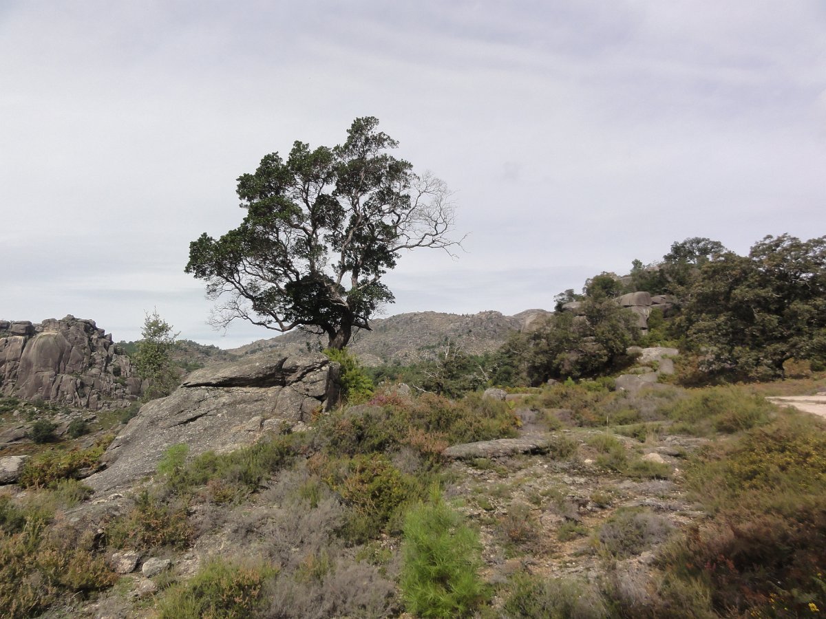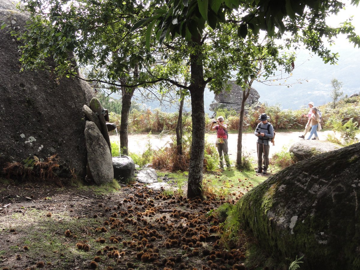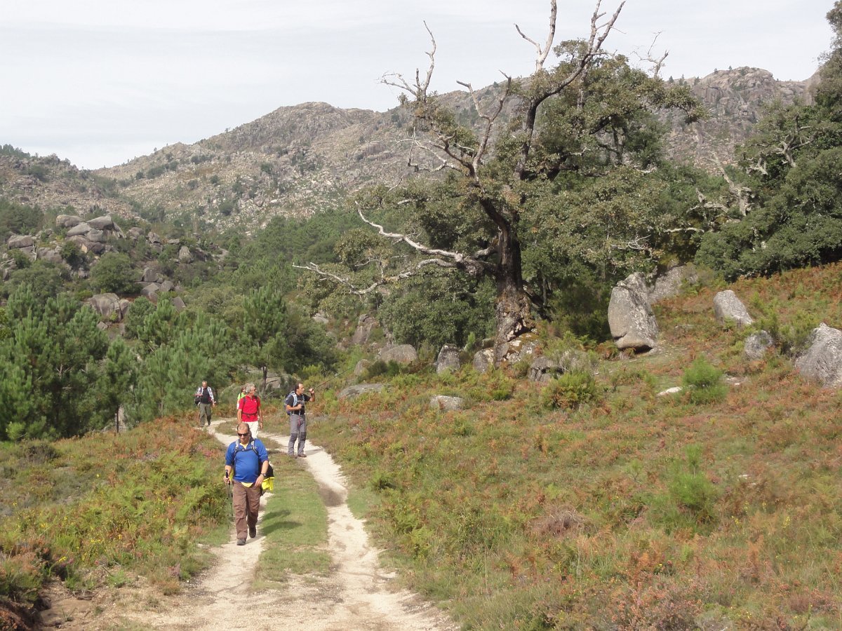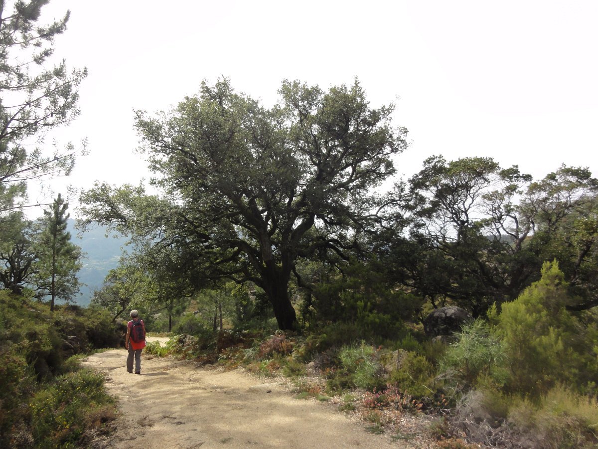 Iniciamos de seguida a descida de uma encosta virada a sul, protegida dos ventos dominantes, que deu o nome a esta caminhada - o Sobreiral da Ermida, em que os seculares sobreiros se combinam harmoniosamente com medronheiros, coloridos com vermelhos frutos, vidoeiros e alguns castanheiros, também carregados de verdes ouriços, quase maduros nesta época do ano.
