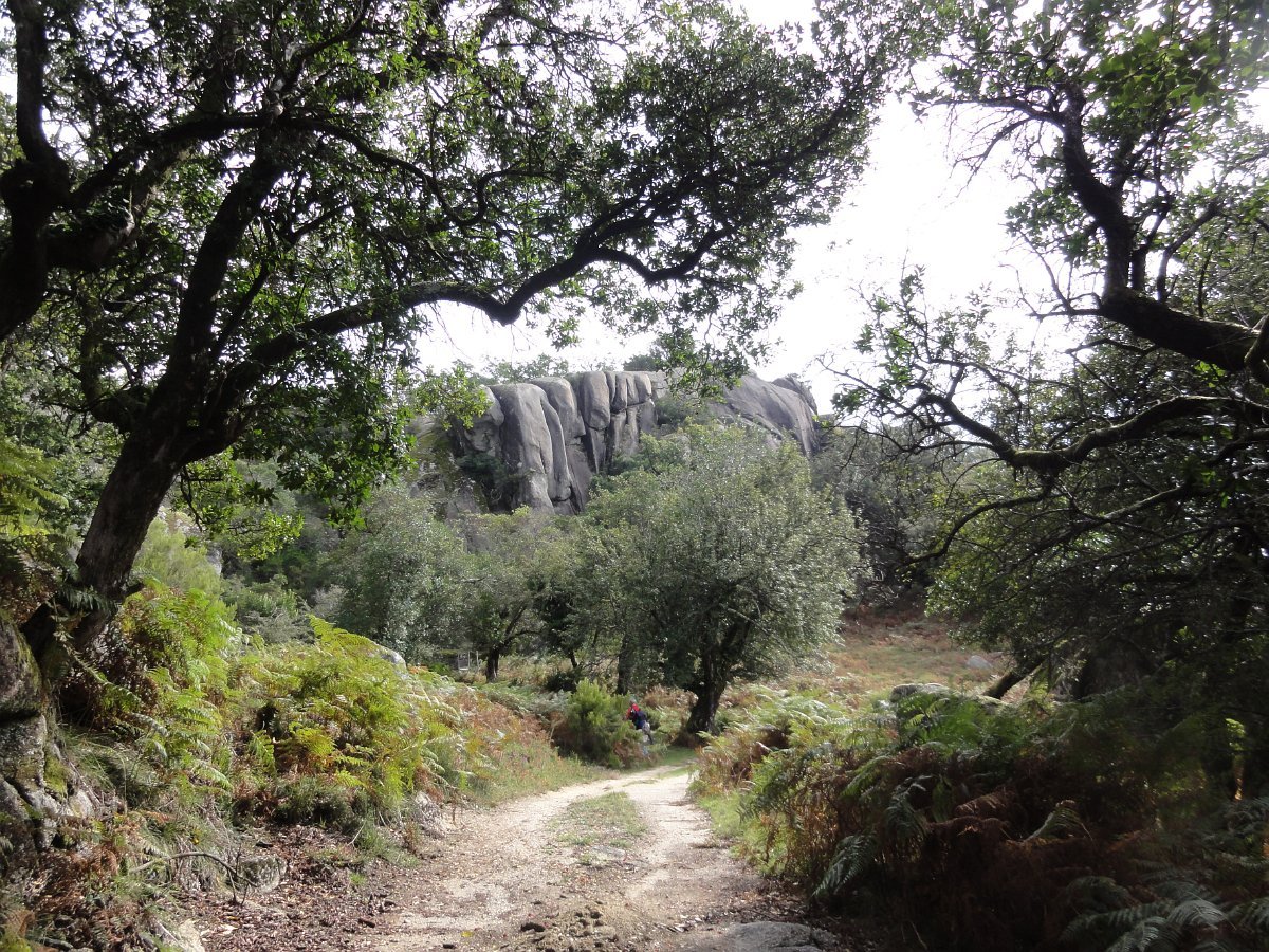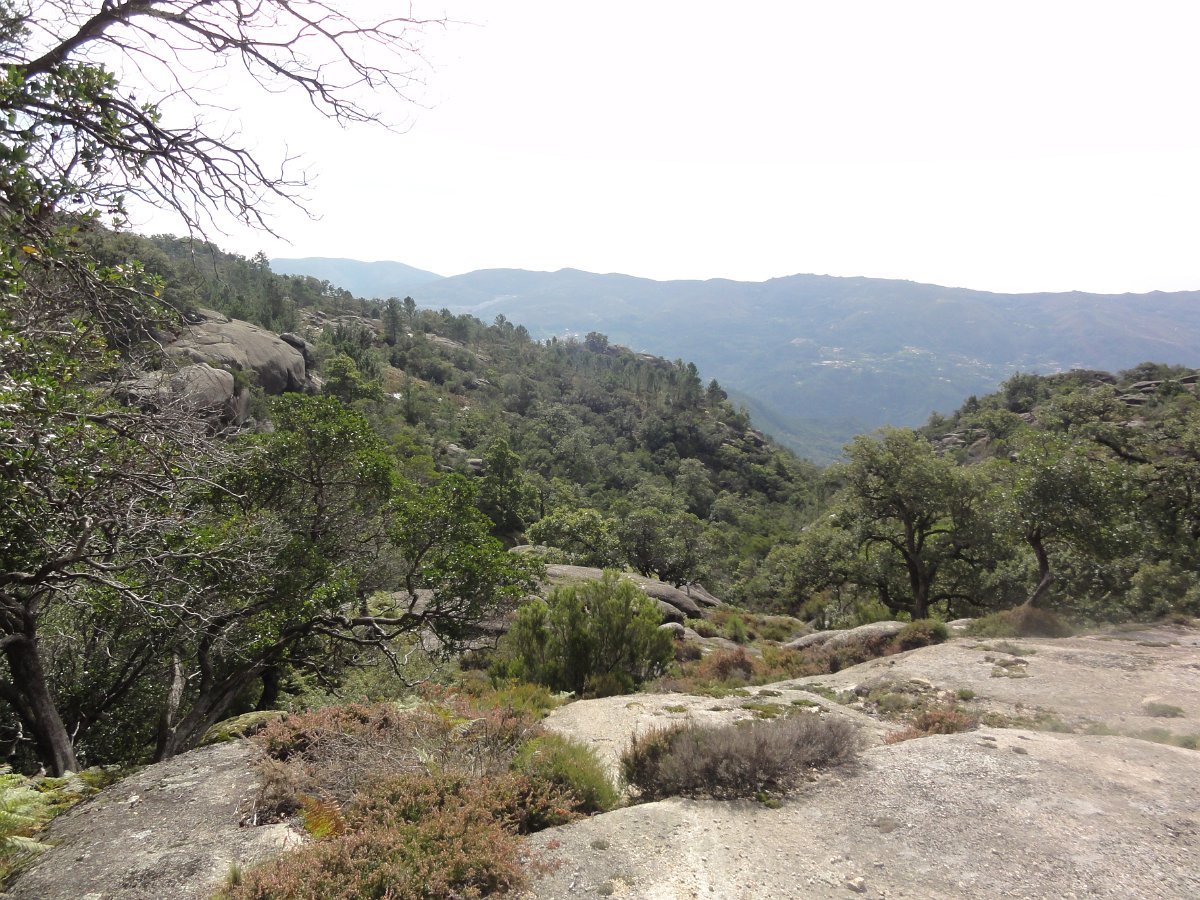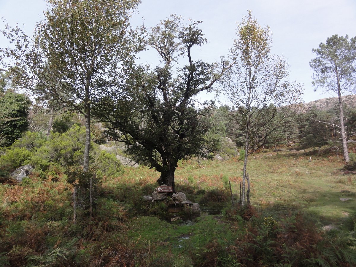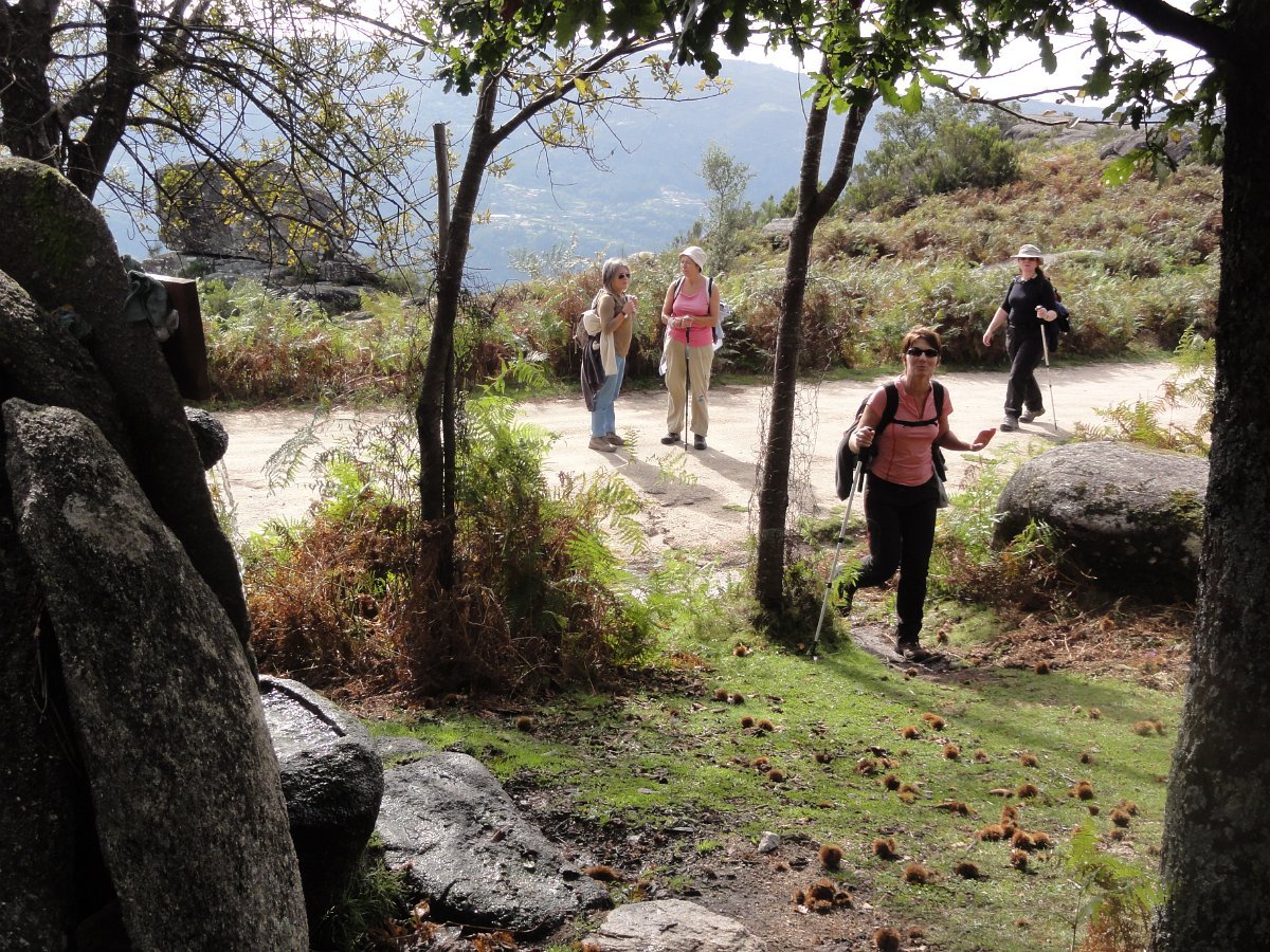 Iniciamos de seguida a descida de uma encosta virada a sul, protegida dos ventos dominantes, que deu o nome a esta caminhada - o Sobreiral da Ermida, em que os seculares sobreiros se combinam harmoniosamente com medronheiros, coloridos com vermelhos frutos, vidoeiros e alguns castanheiros, também carregados de verdes ouriços, quase maduros nesta época do ano.