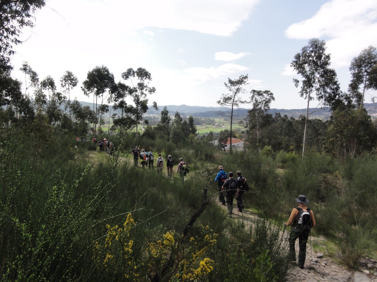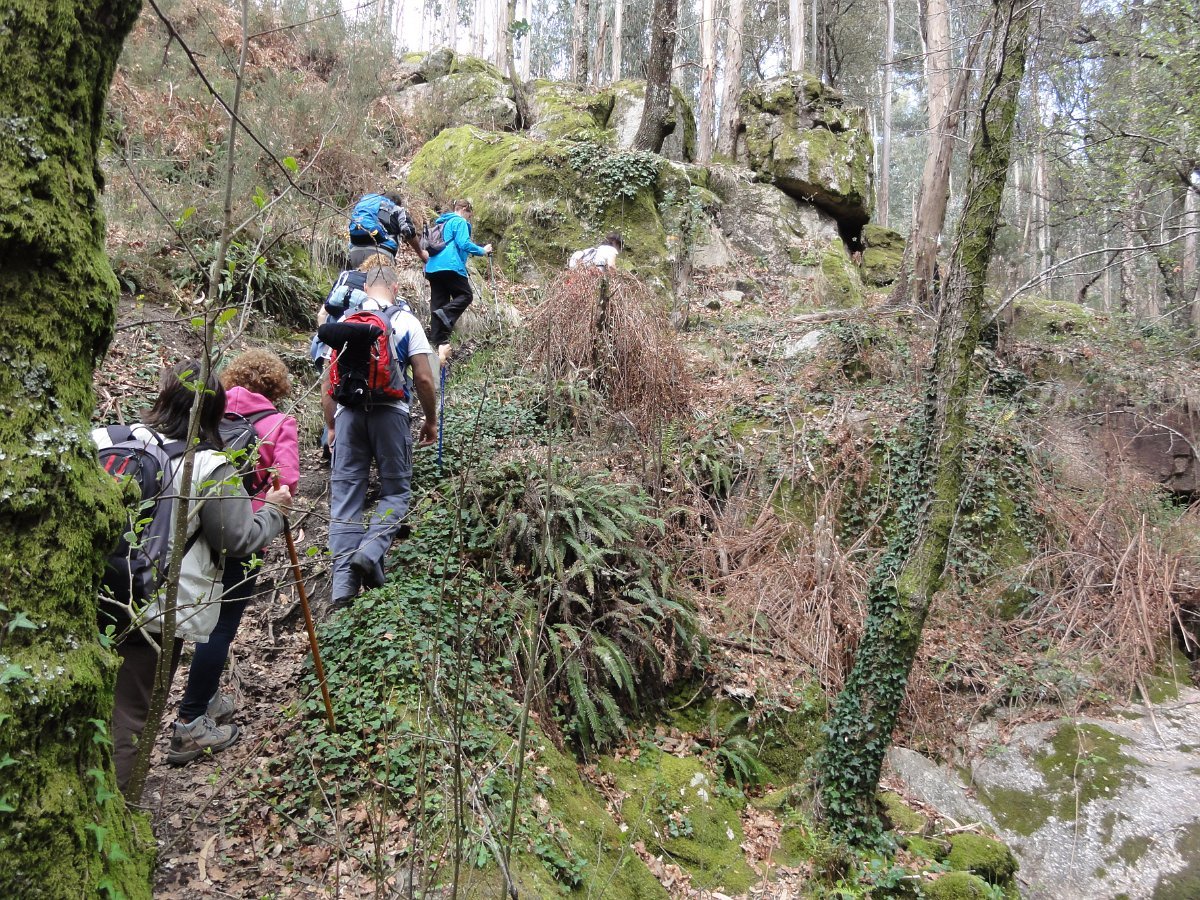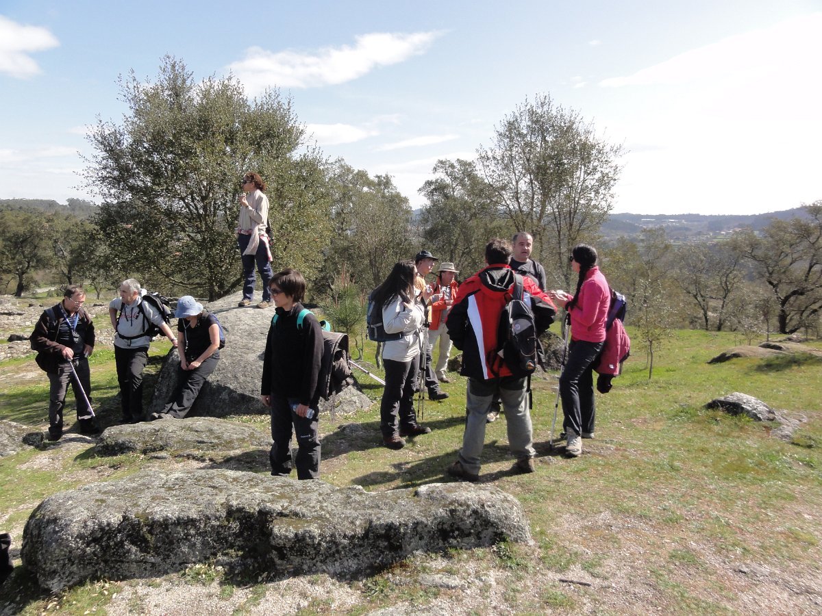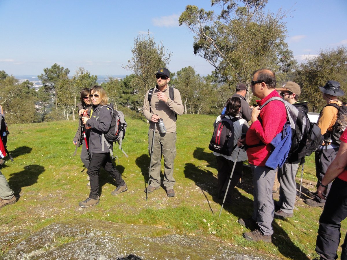 Pensamos que estava a brincar, mas o certo é que, pouco depois de deixar o recinto do santuário, tomamos um atalho junto a um muro de propriedade, que descia a bom descer… quase a pique. Se descer foi difícil, para subir… lá fez falta a malfadada corda, pois o penedio inclinado e liso, aconselhava um apoio suplementar, providenciado pelo guia. Mas foi mesmo pontual, pois a partir daí, seguimos o PR1 até ao Castro do Monte Padrão, sem qualquer dificuldade.