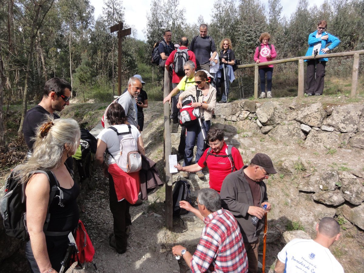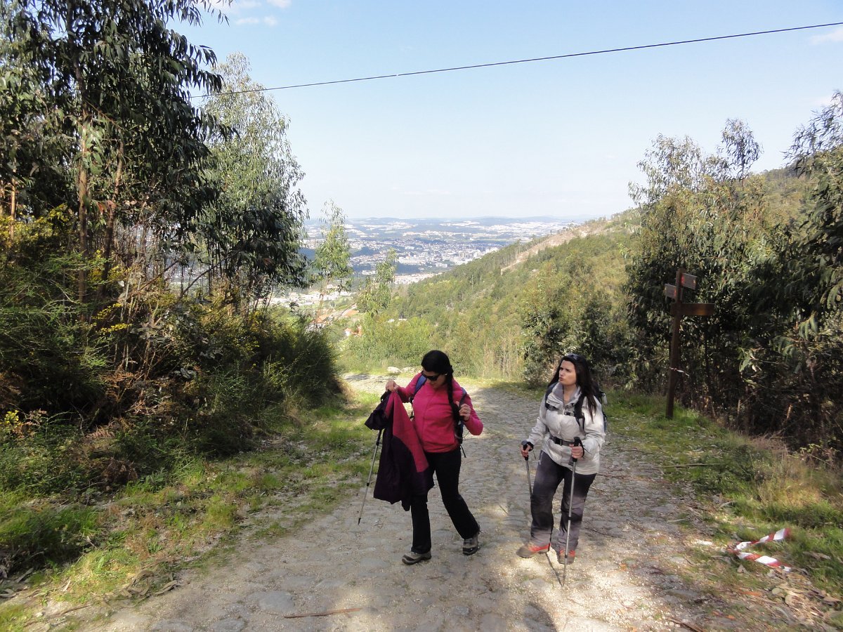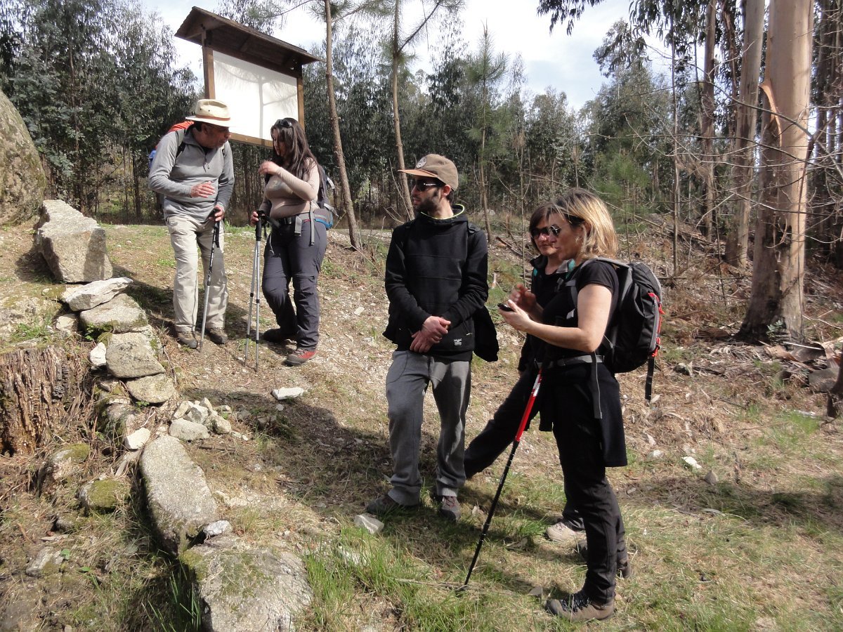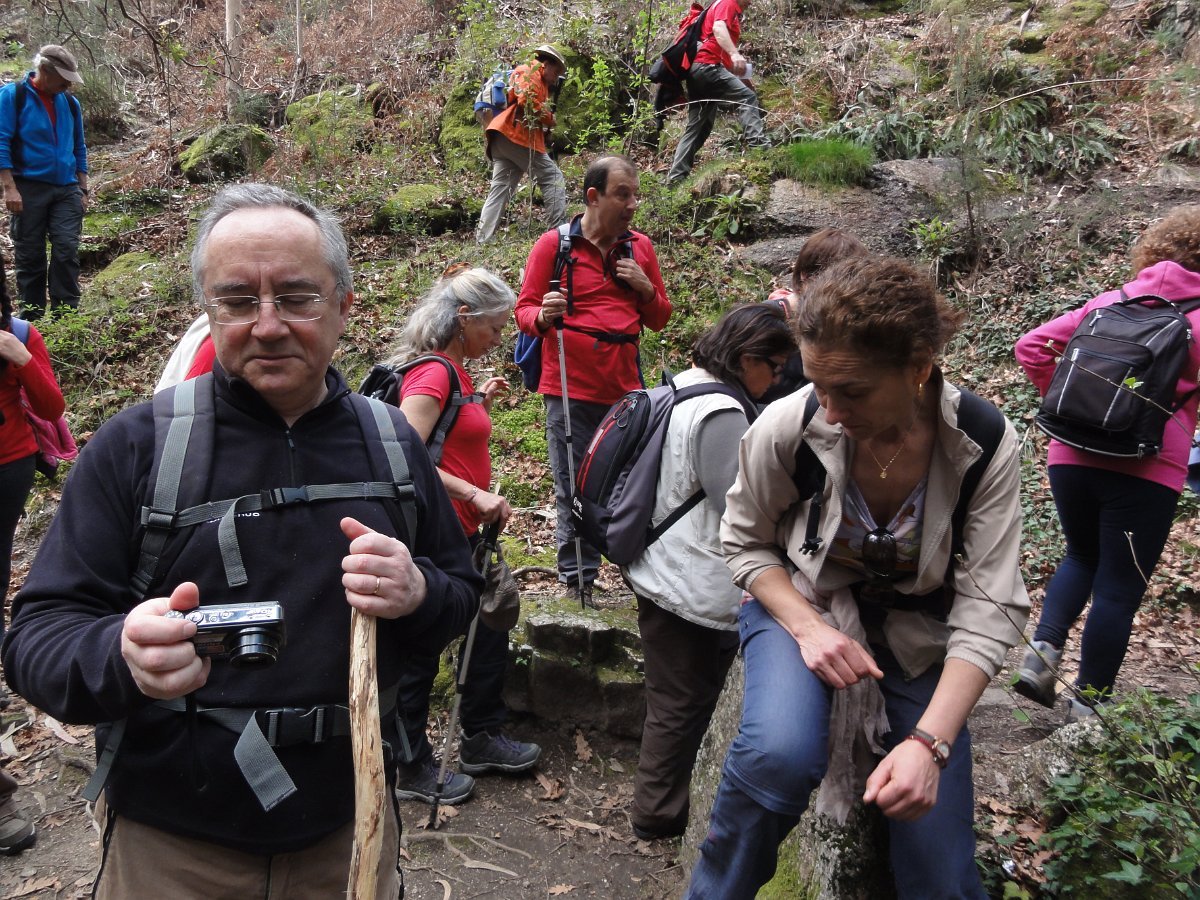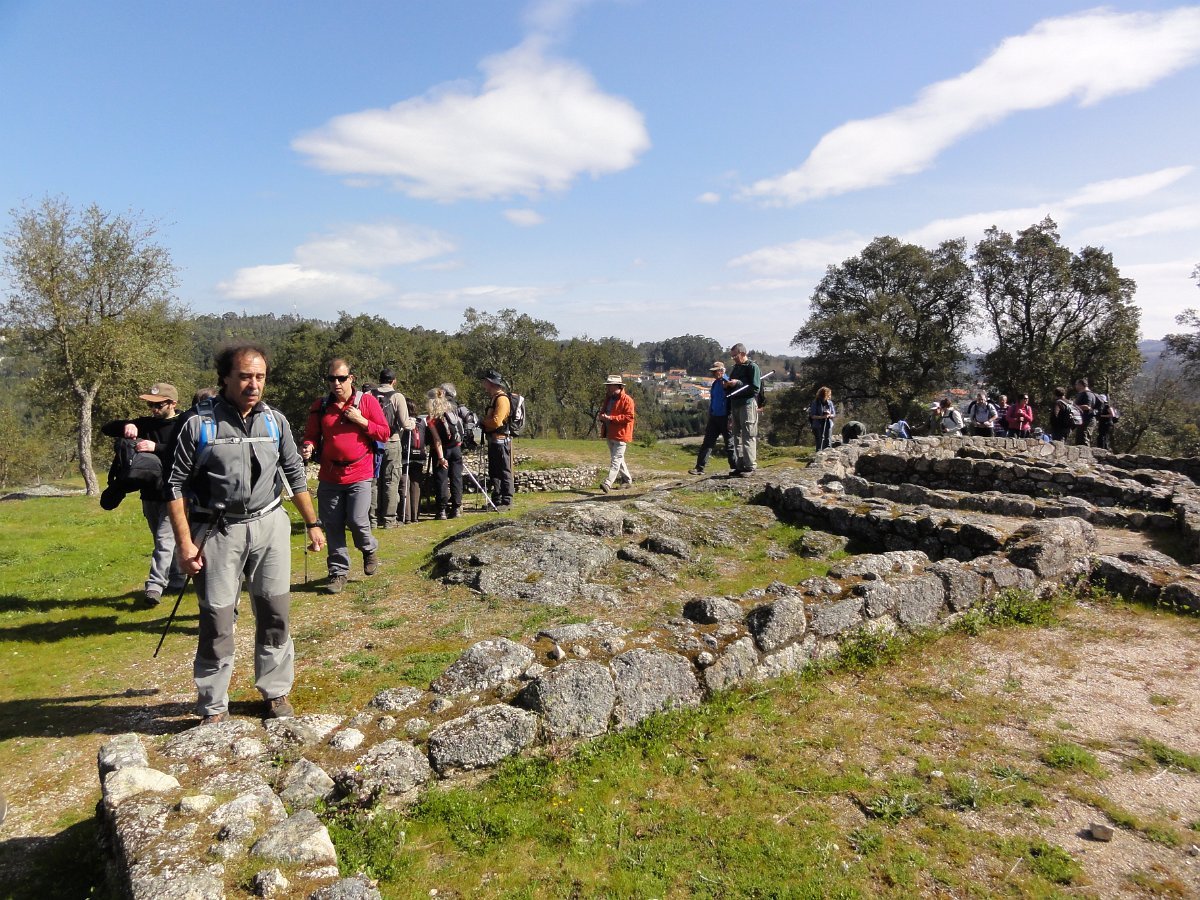 Pensamos que estava a brincar, mas o certo é que, pouco depois de deixar o recinto do santuário, tomamos um atalho junto a um muro de propriedade, que descia a bom descer… quase a pique. Se descer foi difícil, para subir… lá fez falta a malfadada corda, pois o penedio inclinado e liso, aconselhava um apoio suplementar, providenciado pelo guia. Mas foi mesmo pontual, pois a partir daí, seguimos o PR1 até ao Castro do Monte Padrão, sem qualquer dificuldade.
