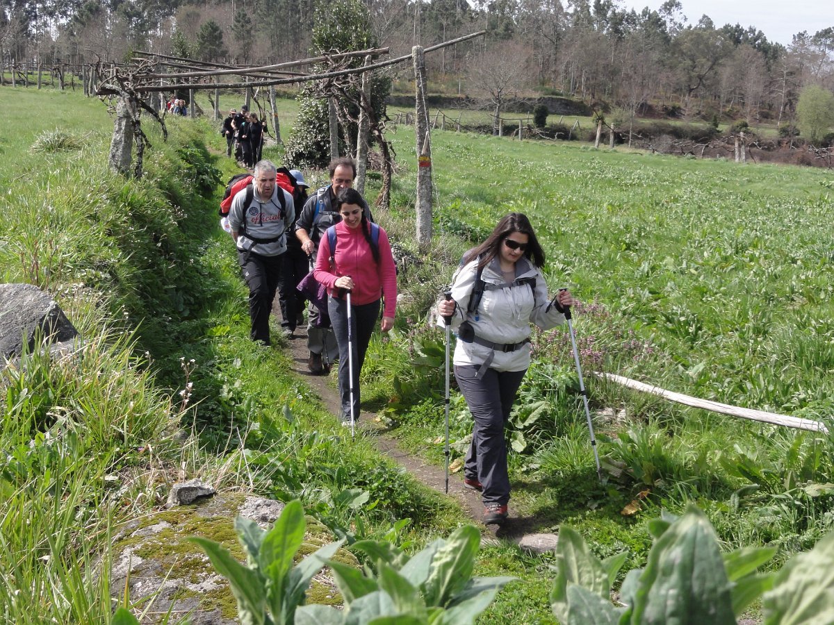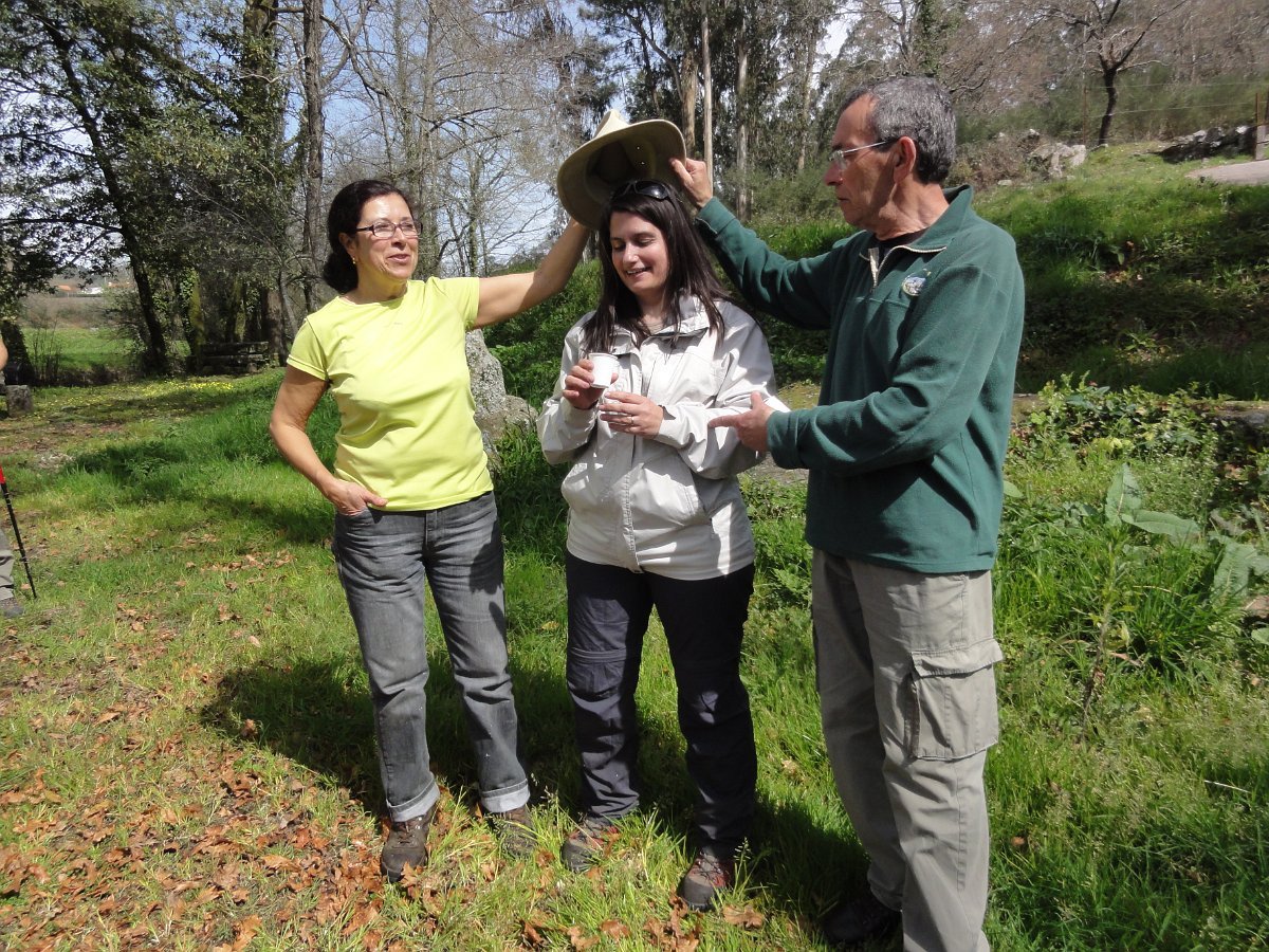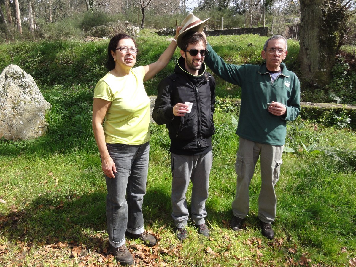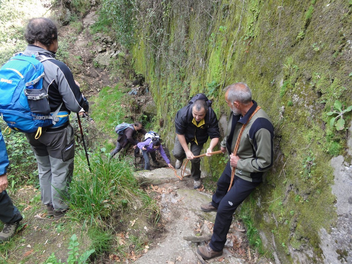 Pensamos que estava a brincar, mas o certo é que, pouco depois de deixar o recinto do santuário, tomamos um atalho junto a um muro de propriedade, que descia a bom descer… quase a pique. Se descer foi difícil, para subir… lá fez falta a malfadada corda, pois o penedio inclinado e liso, aconselhava um apoio suplementar, providenciado pelo guia. Mas foi mesmo pontual, pois a partir daí, seguimos o PR1 até ao Castro do Monte Padrão, sem qualquer dificuldade.