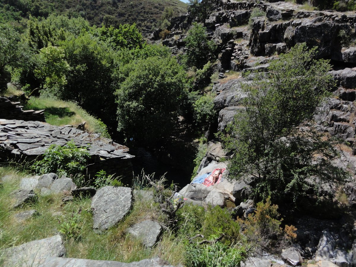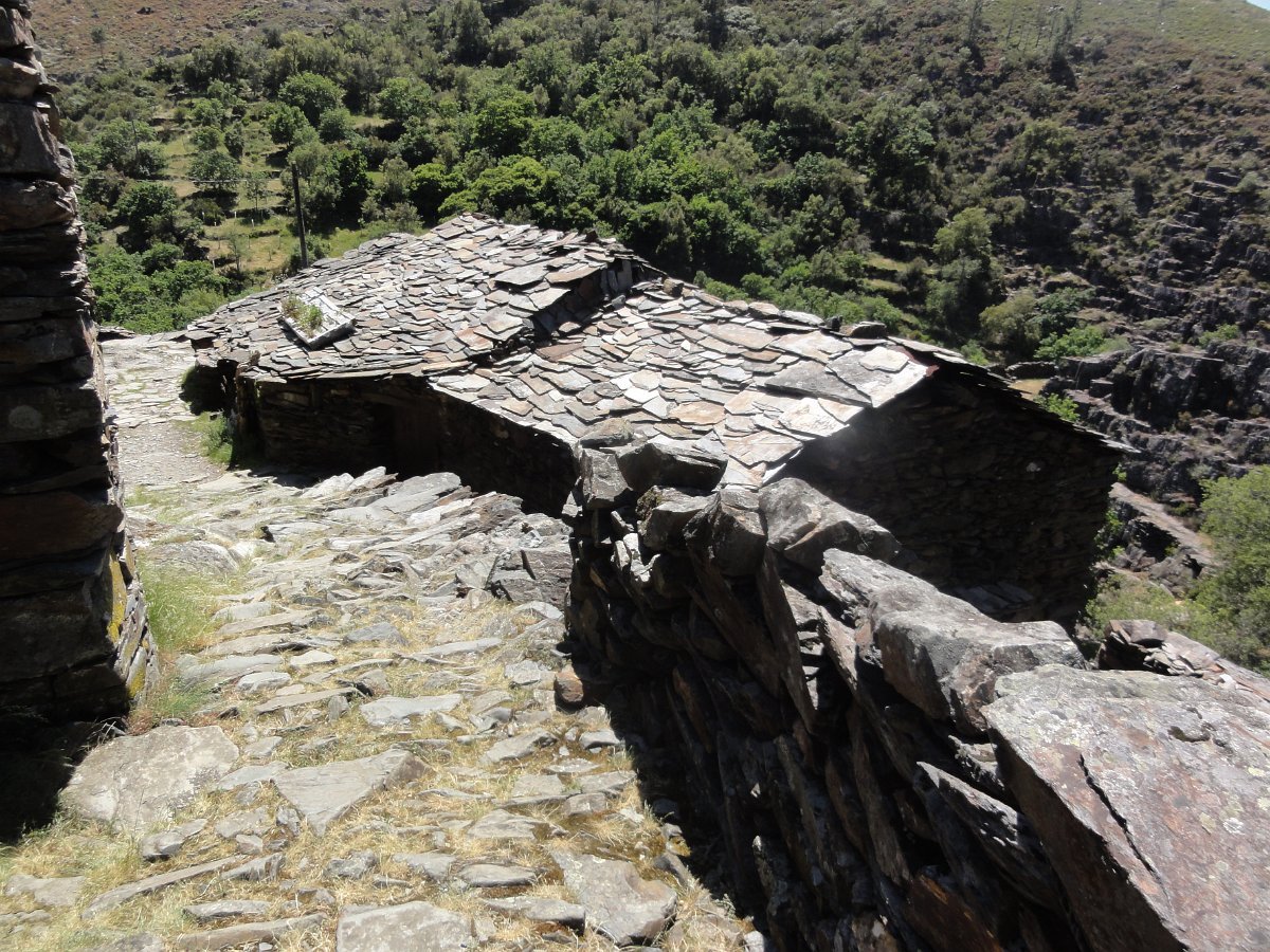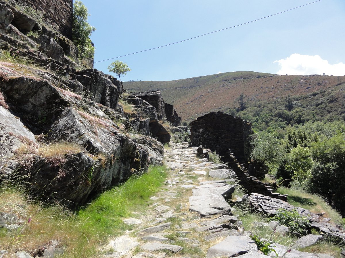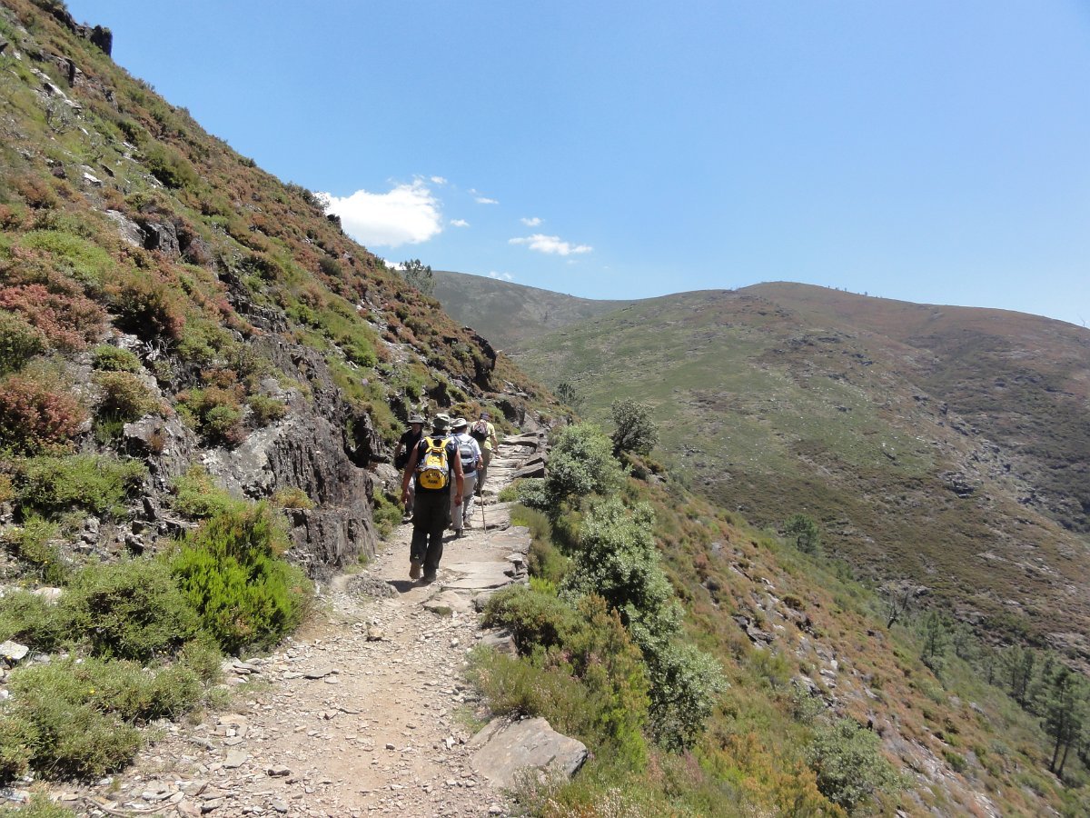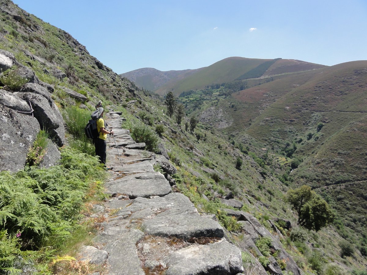 Atravessamos a ribeira de Regoufe e iniciamos mais uma penosa subida, por um amontoado de pedras xistosas soltas, que não se pode chamar de caminho, na direção do Alto de Belide, também chamado de Garra do Alto de Belide, onde conflui o caminho que sobe de Drave e o que desce do Portal do Inferno.