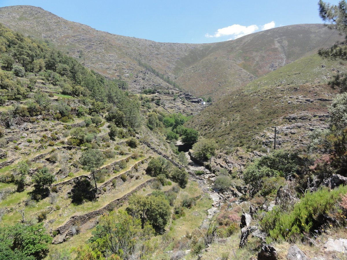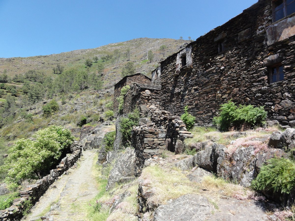 Superada a subida, com várias queixas sobre a classificação da dificuldade do percurso... descemos para Drave, primeiro por estradão largo ao longo do rio Paivô , depois por uma interessante calçada que serpenteia o vale da ribeira de Palhais, avistando ao longe a aldeia abandonada de Drave, encaixada na vertente das montanhas, com a sua capelinha branca a destacar-se do negrume das pedras xistosas das ruinas envolventes.