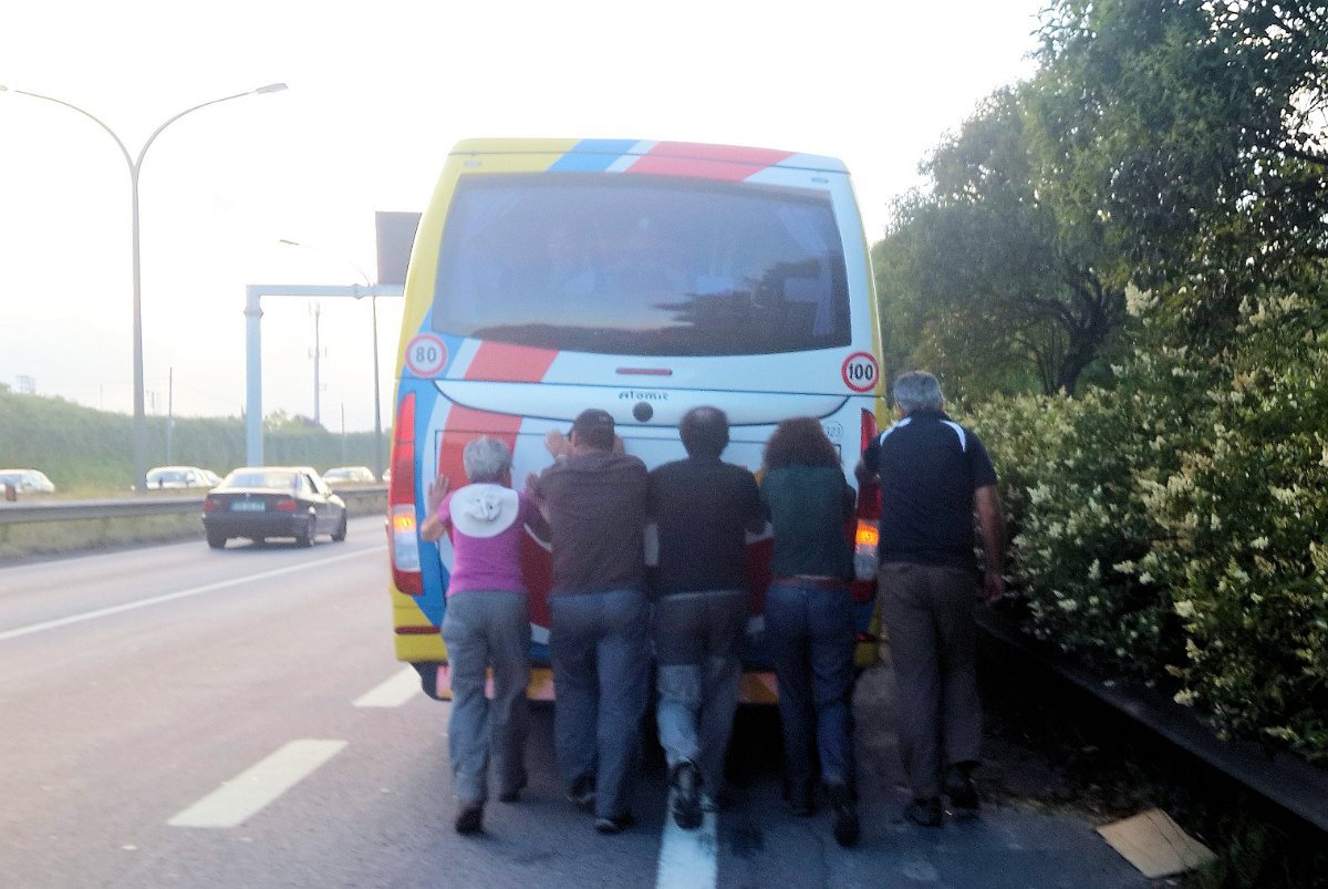 Um grupo de cansados caminheiros, depois de um dia extenuante a empurrar uma camioneta! Isto é que é resistência!