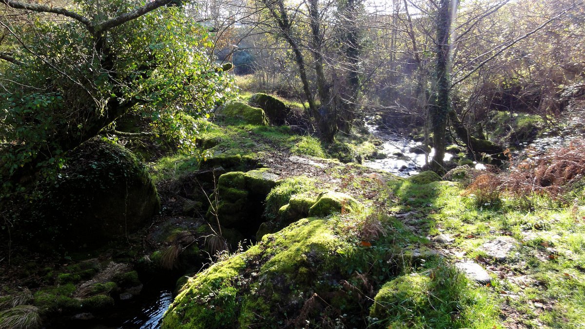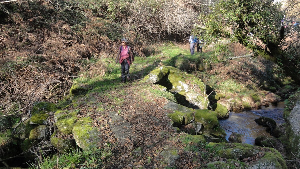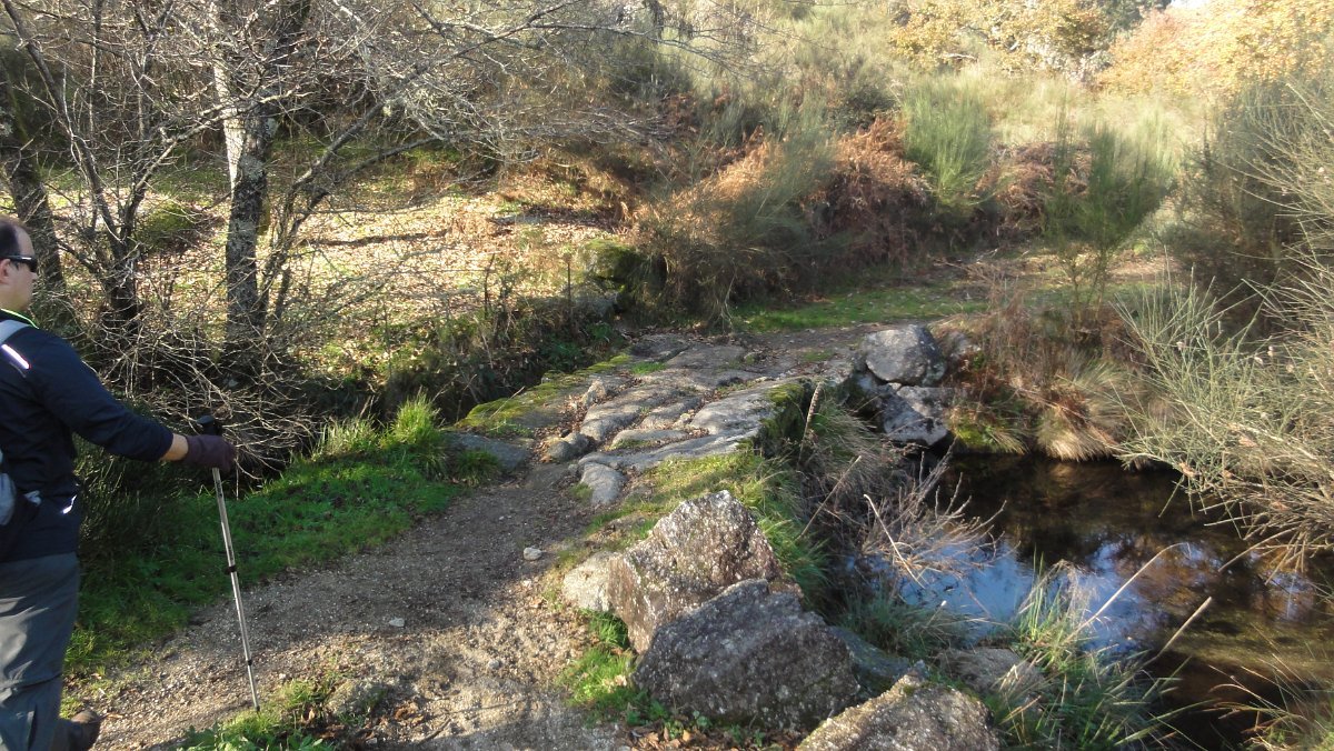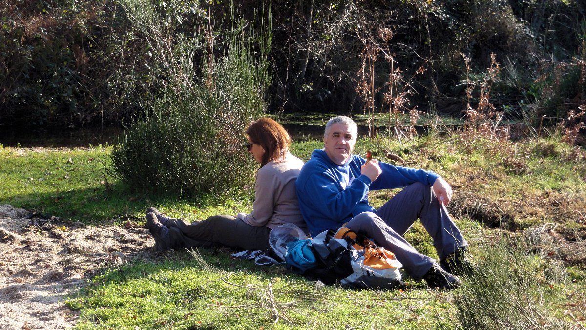No carta militar e vista de satélite a coisa até era fácil... mas na realidade o caminho estava quase totalmente tapado com silvas e giestas, pelo que foi à “paulada” que fomos abrindo caminho, com os bastões virados em improvisados cajados, que lá conseguimos, a muito custo, encontrar o modo transpor um pequeno ribeiro e apanhar um trilho que nos conduziu à ponte de S. Mamede, onde transpusemos a estrada municipal, tomando agora a margem esquerda do ribeiro de Rio de Moinhos até um pontão junto a uma pequena soalheira enseada, local escolhido para um já tardio e muito reclamado almoço.