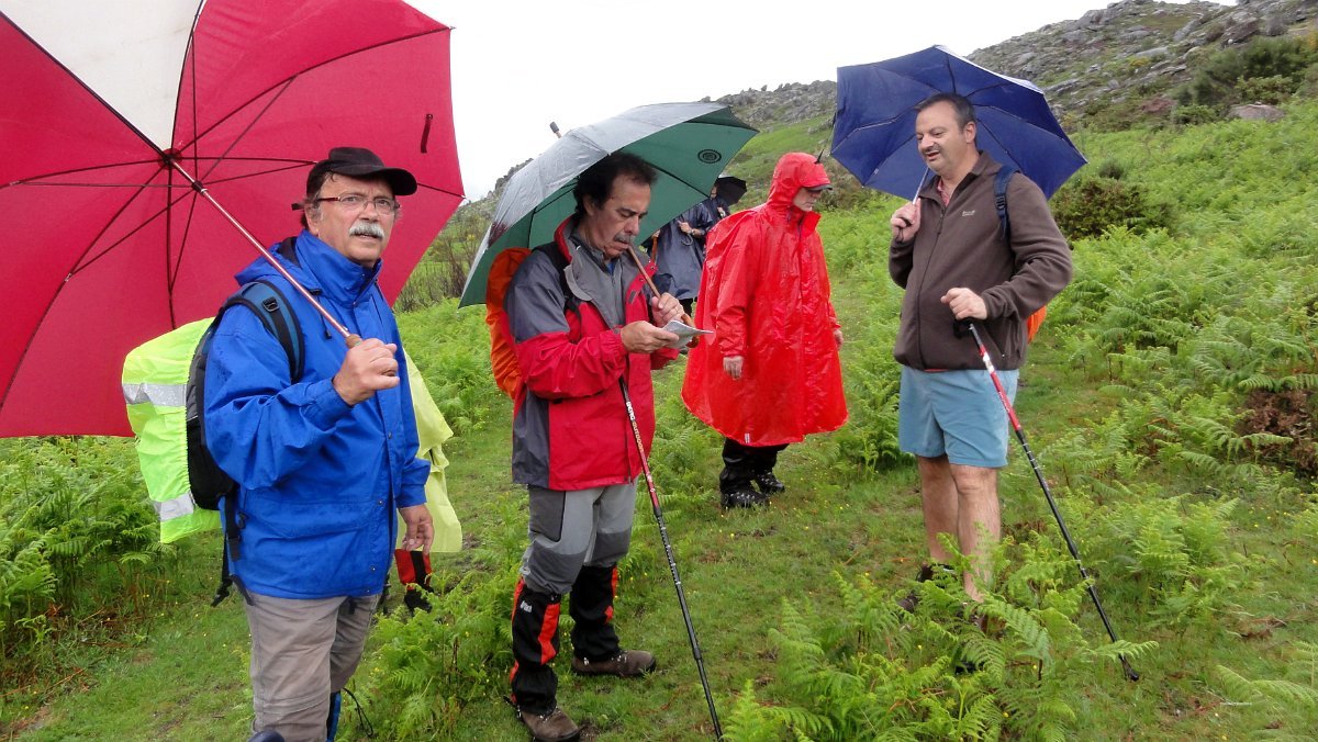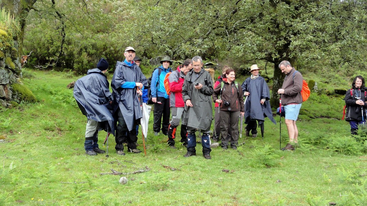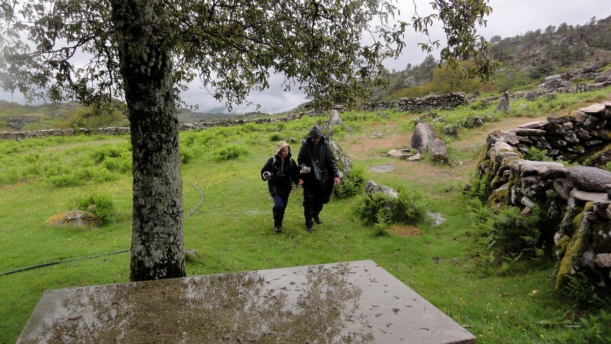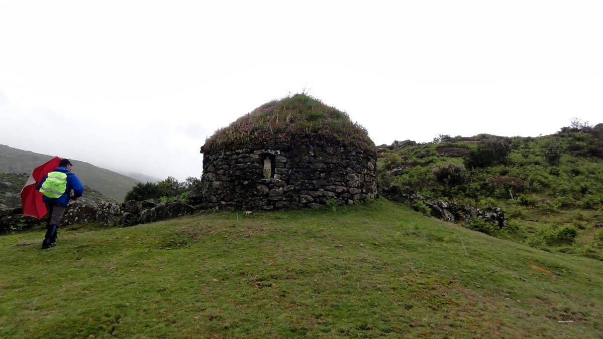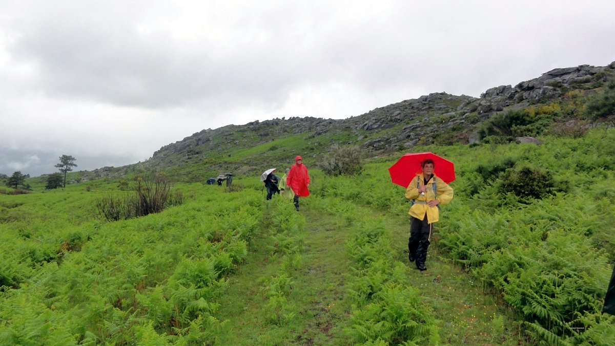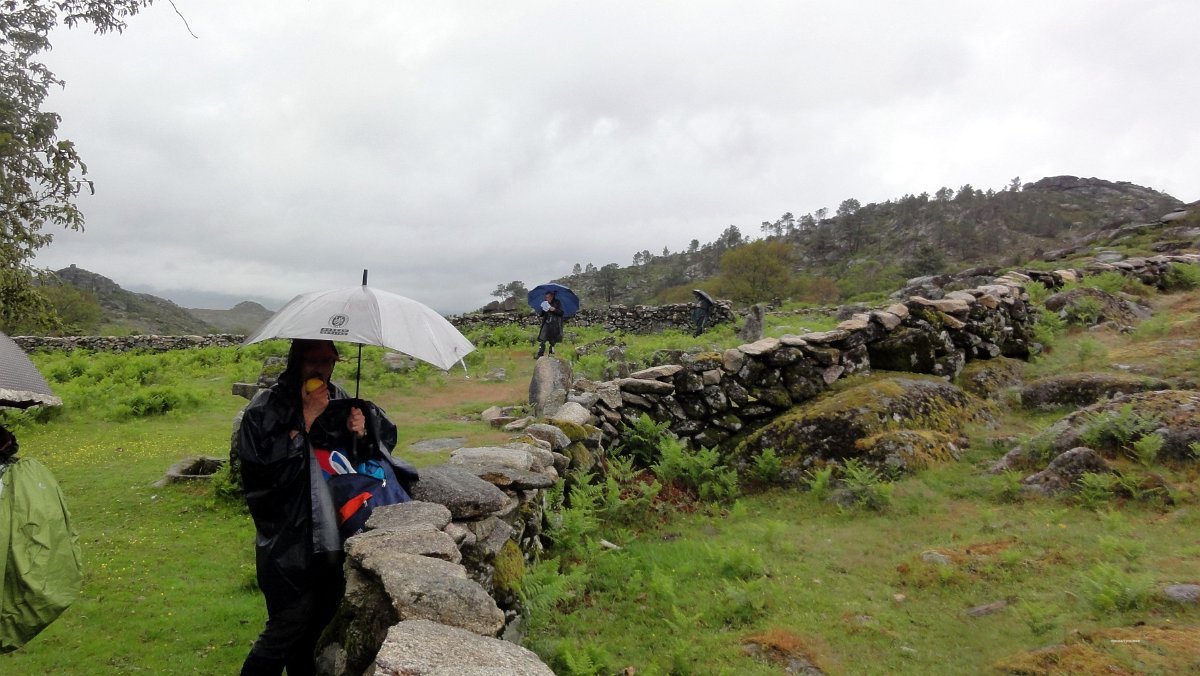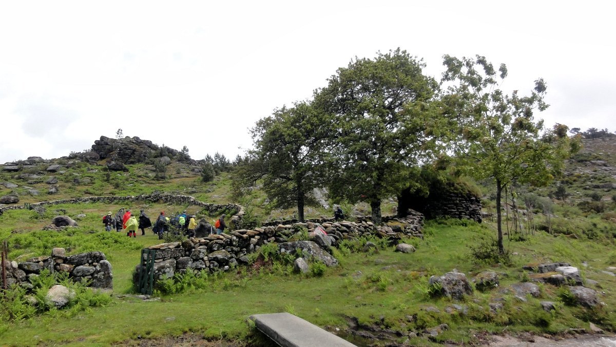 O santo não quis nada connosco e a chuva intensa persistia, mas havia que prosseguir e subimos o rio Perdiz, até ao curral da Escravilheira, onde tínhamos prevista a pausa para almoço antes de rumar à serra Amarela, para visitar mais algumas cabanas (ou fornos) nas suas margens. Mas com o tempo assim, fomos forçados ao regresso imediato à Chão do Couto, com a esperança de arranjar abrigo numa das cabanas.