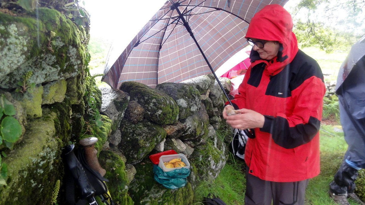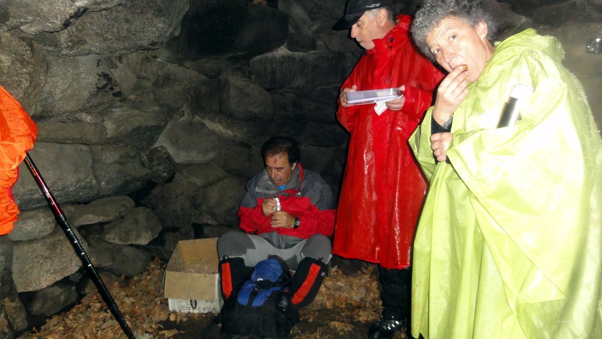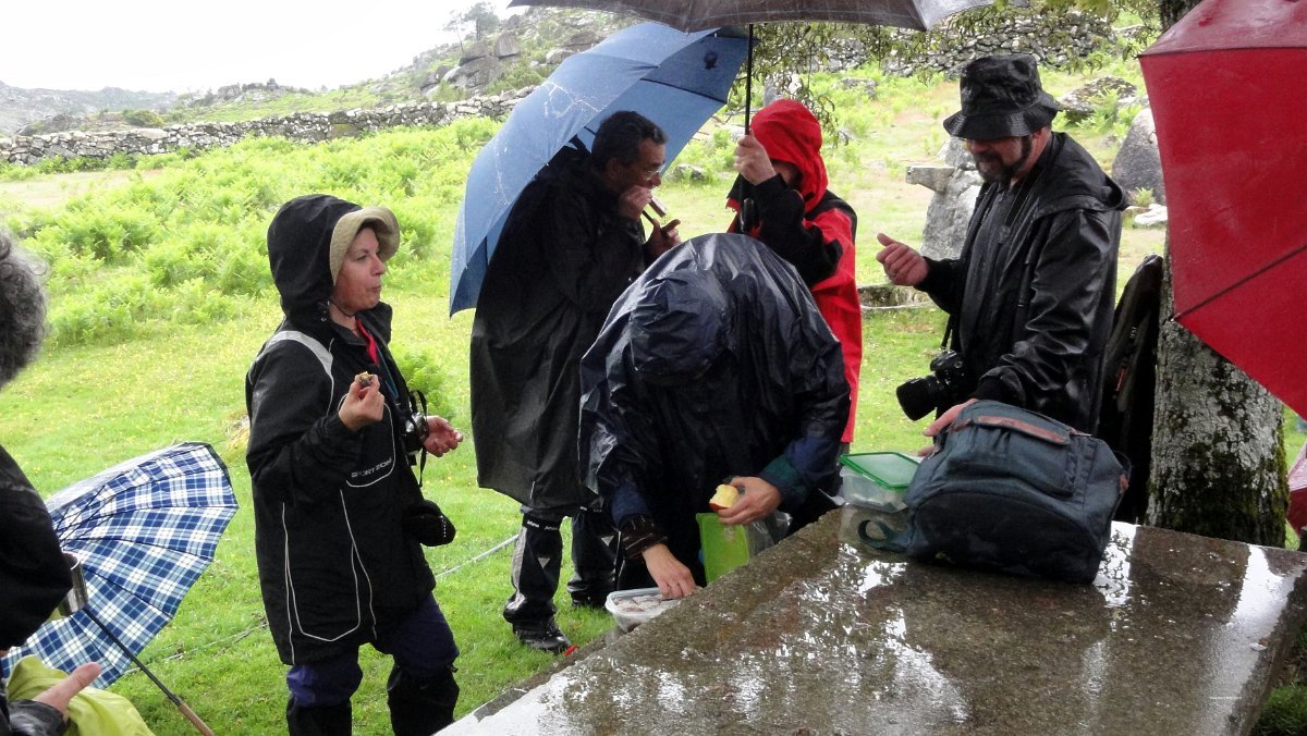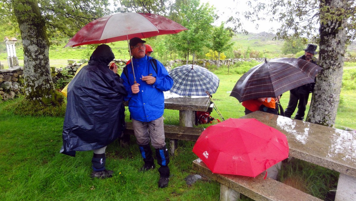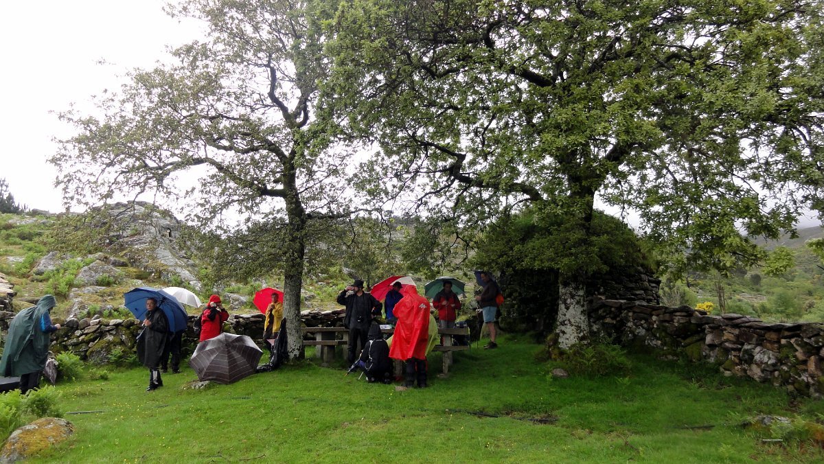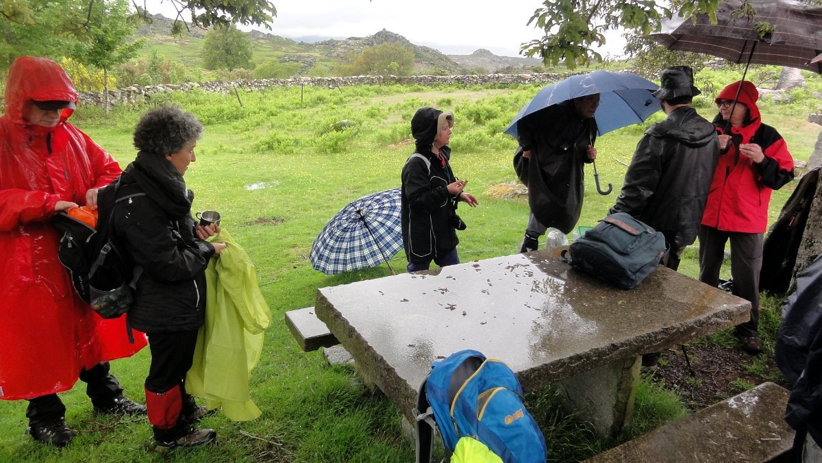Uma cabana proporcionou parco abrigo para uma rápida refeição e o Miguel até acendeu uma fogueira com umas espigas, mas o fumo prejudicou a já fraca habitabilidade do forno, pelo que fugiu tudo do fumeiro e houve que comer à chuva, abrigados com os oleados encharcados. Nem houve tempo para batismos!