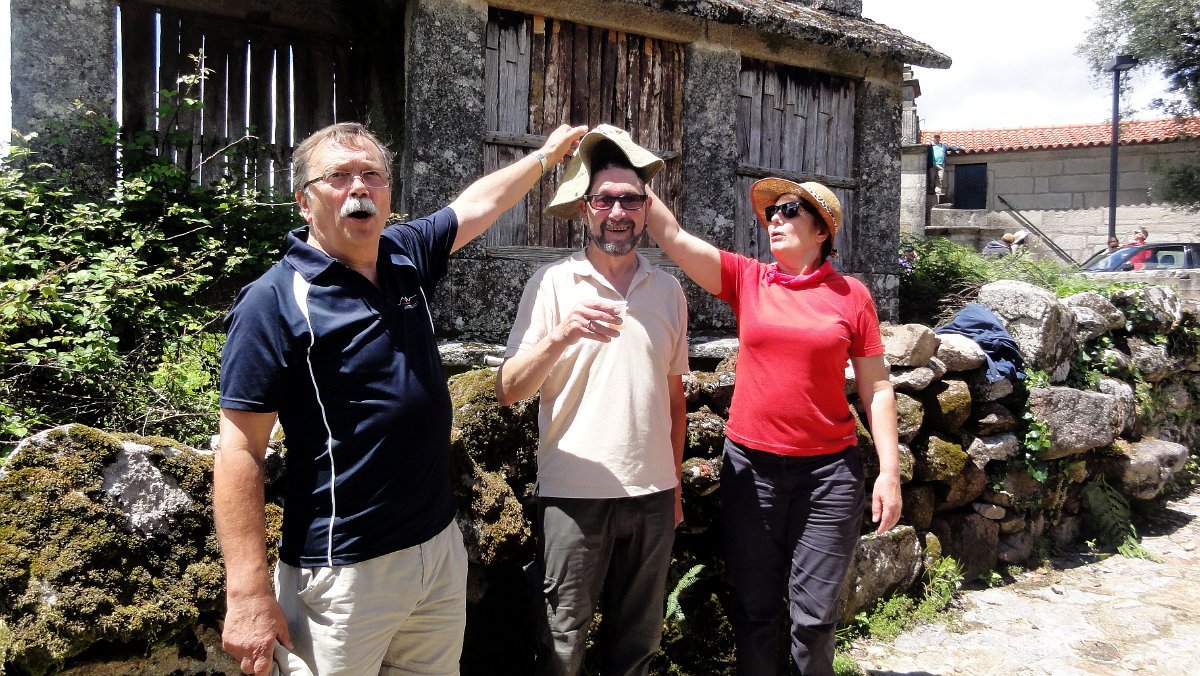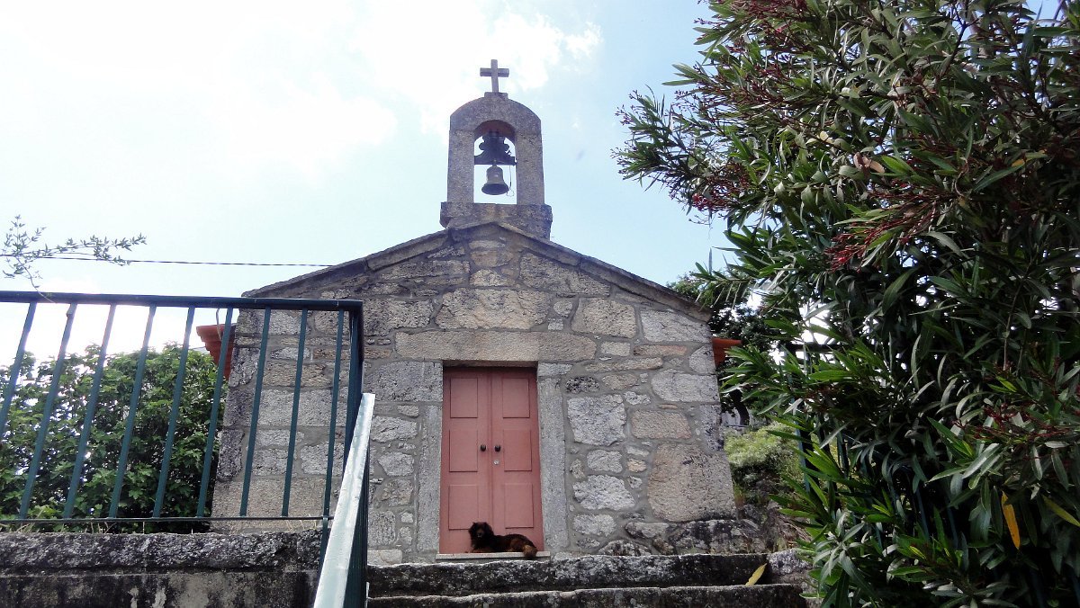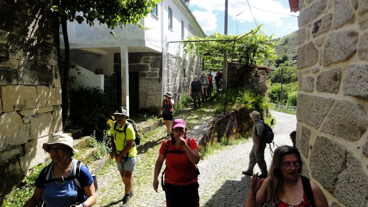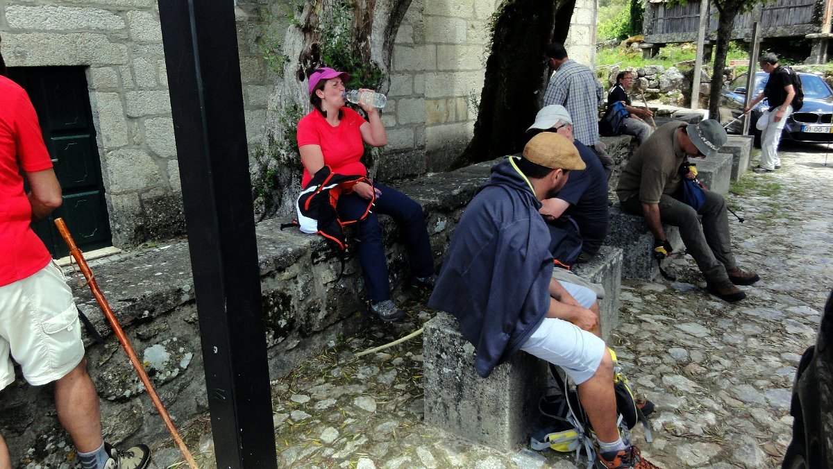 Ficamos de pé ainda mais atrás, pois a coisa estava mesmo muito pior do que a Associação Péd´Rios do Germil nos tinha prevenido, mas lá fomos descendo por uma velha calçada para Paradela, onde fizemos uma pausa no largo da capela de S. Pedro, defronte de mais um núcleo de típicos espigueiros comunitários.