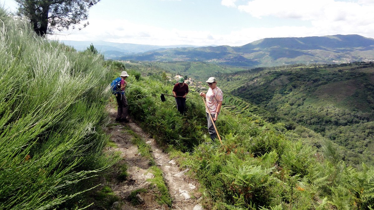 Ouvimos vozes e paramos com um grupo que, aproveitando o sábado, trabalhava na manutenção da levada, já que “a água dava sempre jeito para os campos” e havia que manter o sistema de distribuição comunitário em boas condições.