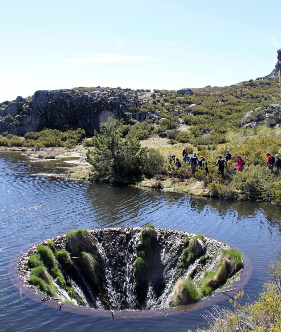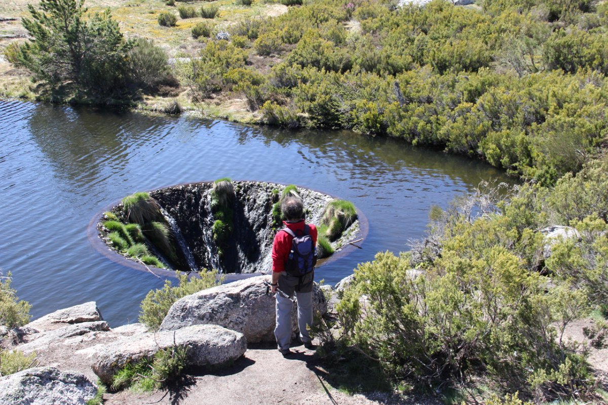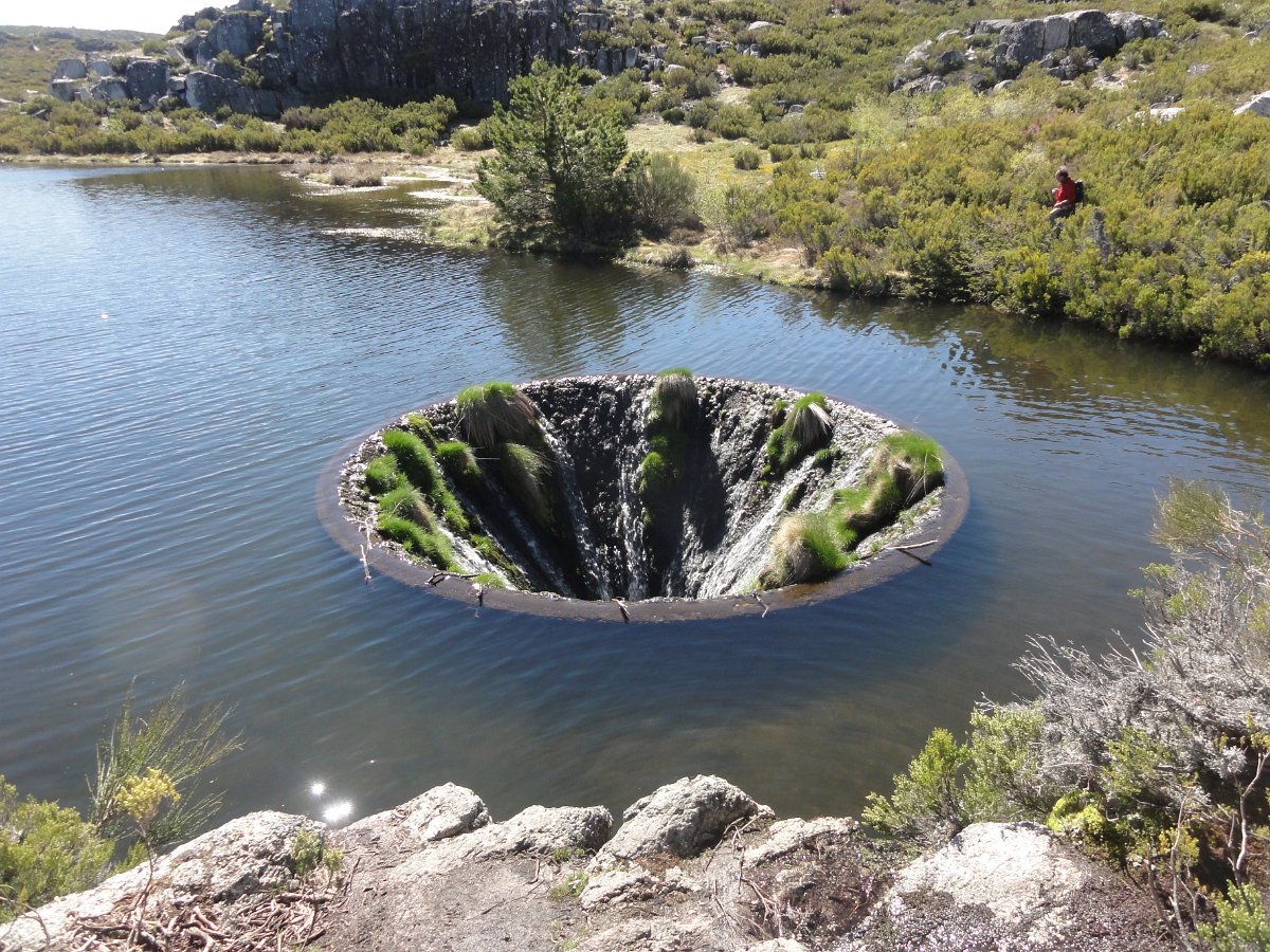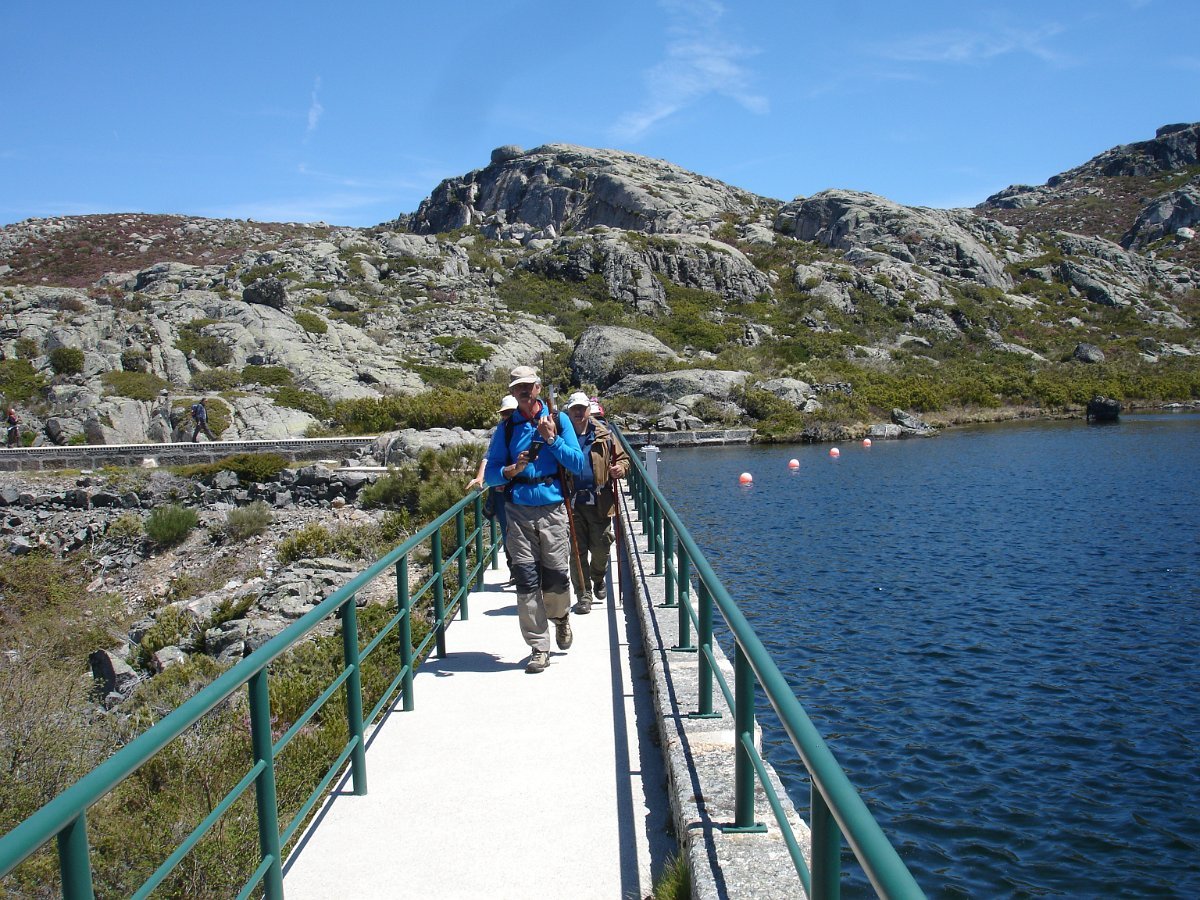 Mais à frente num local em que se entrecruzam dois trilhos, o da direita que vem da Nave Mestra uma joia da serra. Nós seguimos pelo da esquerda que após breve descida nos levou até á 3ª. das lagoas a “Lagoa do Covão dos Conchos”(1690m), mais uma das Lagoas que faz parte do aproveitamento hidroelétrico da Serra da Estrela, construída em 1955 em betão e granito. Esta pequena barragem desvia as águas da Ribeira das Naves para a albufeira da Lagoa Comprida através de um túnel com 1519m. Este local era aguardado por todos para se ver o tão falado “Funil” que parece engolir as águas da lagoa.