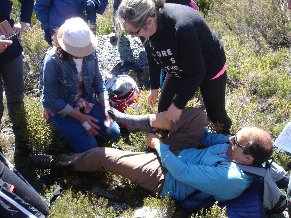 A partir daqui sempre em fila “pirilau” seguimos contornando penhascos, cruzando pequenas linhas de água que sob os nossos pés iam surgindo como que pequenas armadilhas escondidas sob a vegetação. Vagarosamente lá íamos progredindo com muitos cuidados mesmo assim não suficientes para evitar que o companheiro Filipe tivesse um pequeno percalço torcendo um tornozelo obrigando a que fosse chamada a “emergência médica” para prestar o respetivo apoio e tratamento. Com o spray milagroso e ligaduras se procedeu ao “arranjo” com as mãos da enfermeira Fernanda, e que com a vontade e o querer do “sinistrado” o levaram a “bom porto”, passando ainda através de mais uma Lagoa, a 5ª denominada de “Lagoa Seca”, a mais pequena, mas com a particularidade da sua beleza através do grande manto de flores que a cobriam, dando-lhe características diferente das restantes.
