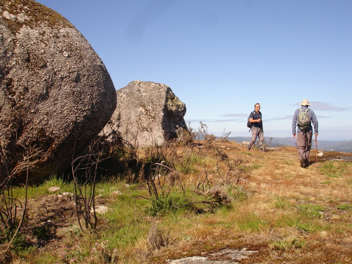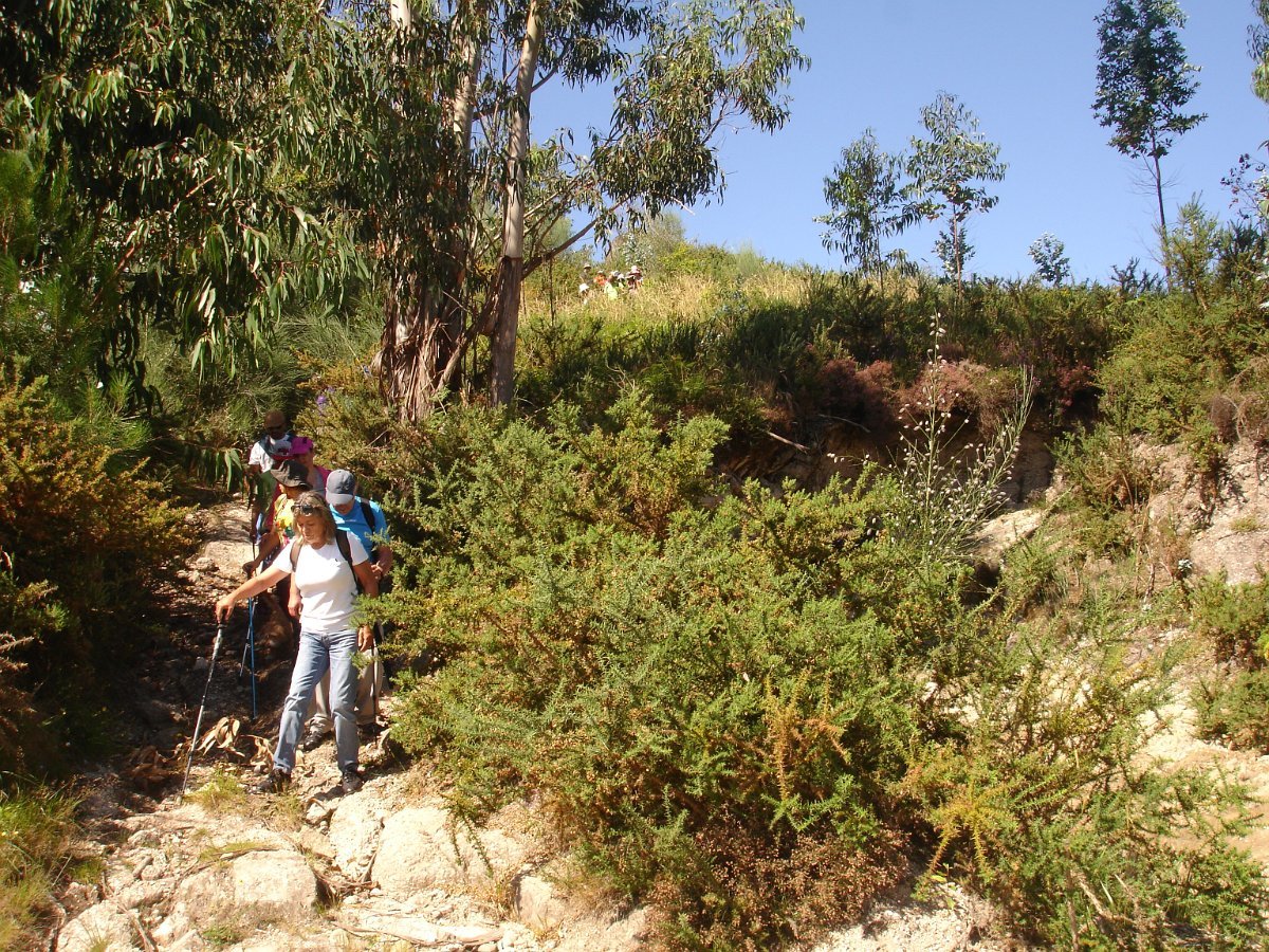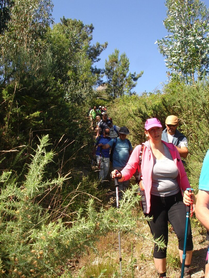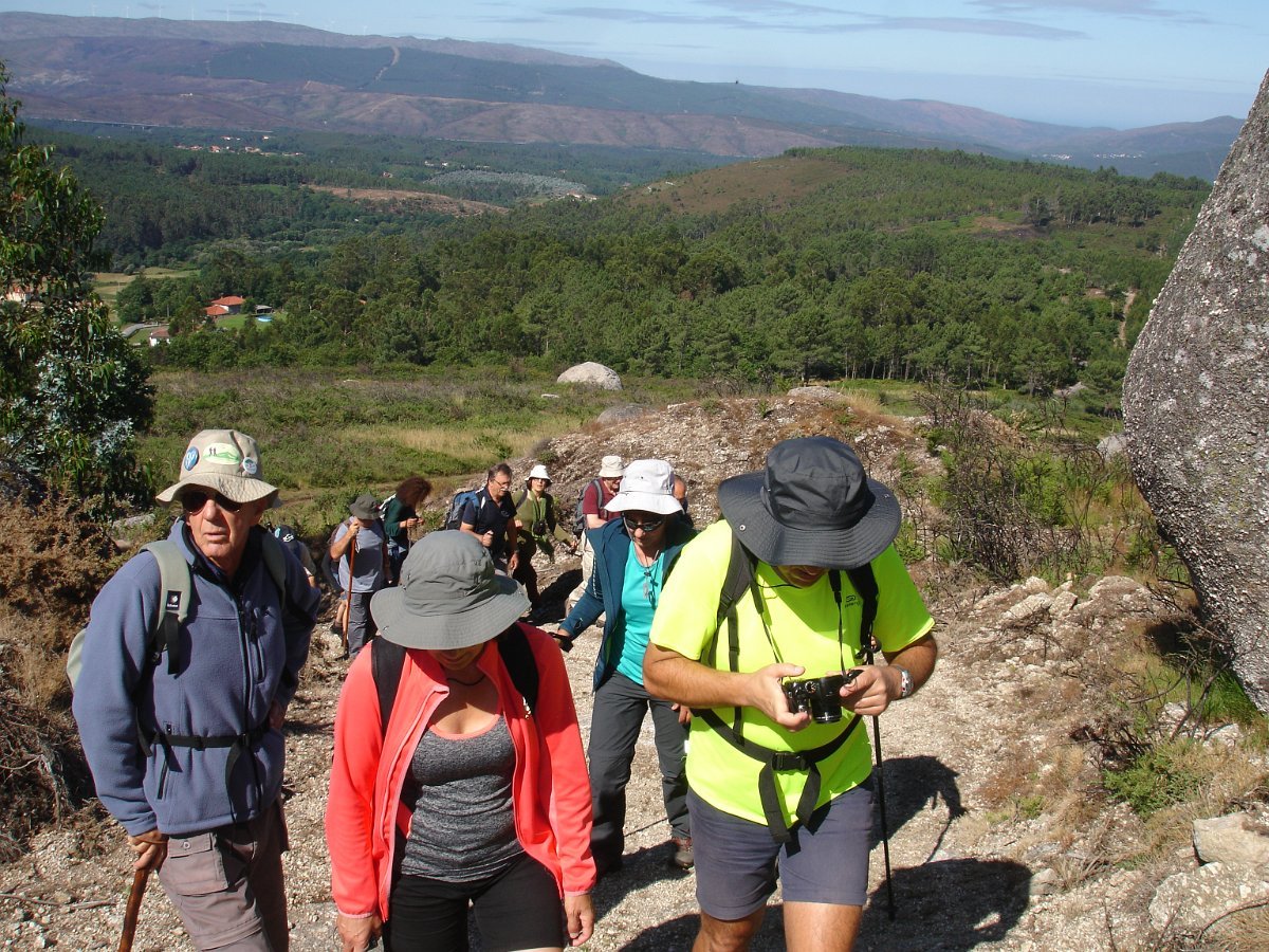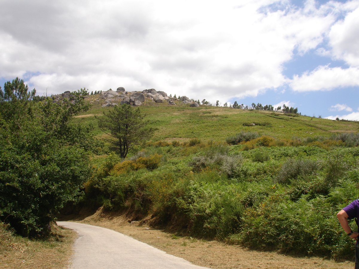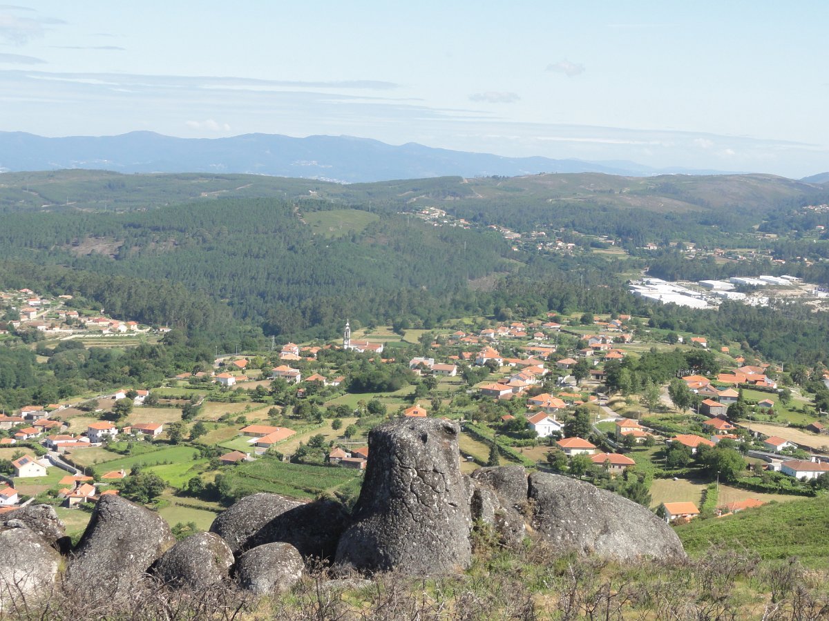Depois de atravessarmos o asfalto, iniciamos a subida para o cabeço de Montuzelo, á procura do Penedo do Macaco, que dá o nome a este trilho. A subida não foi longa, havendo oportunidade para se poder observar a paisagem agrícola e ao longe a encosta menos protegida da serra D’Arga, o alto de Santo Antão já em Caminha e Santa Tecla já em La Guardia.