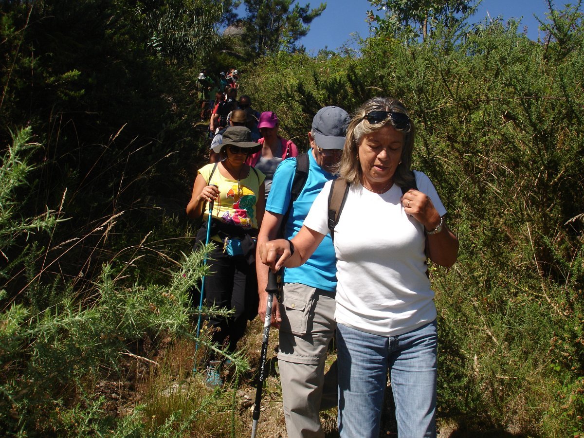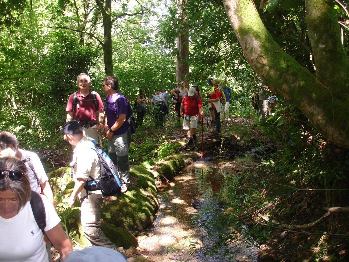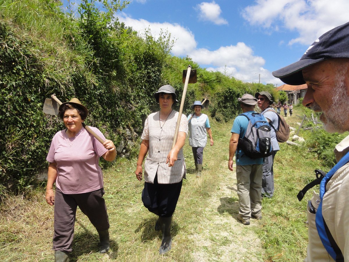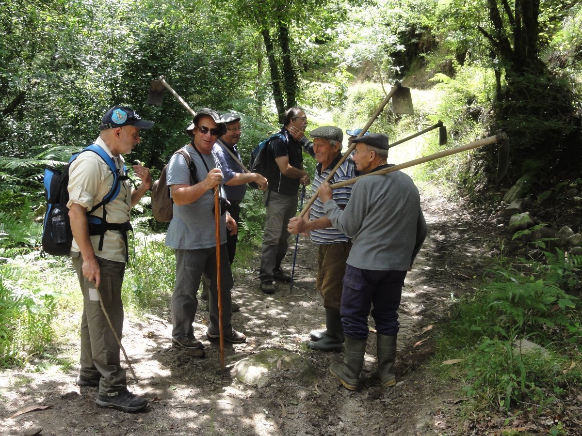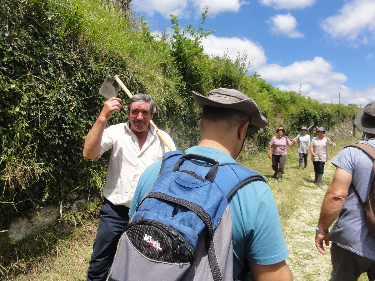 Aqui chegados às Lages Altas, o belo local foi aproveitado para uma pausa, aproveitando também para se tirar a foto de grupo. Atravessando as poldras, seguimos através de uma levada, passando depois em zonas de lameiro, onde cruzamos com um grupo de populares que de sachola às costas se dirigiam para a limpeza comunitária das levadas, pois há que fazer chegar a água aos campos de milho, feijão, batata e outros bens essenciais para a sua subsistência. Esta oportunidade foi aproveitada para uma troca de palavras.