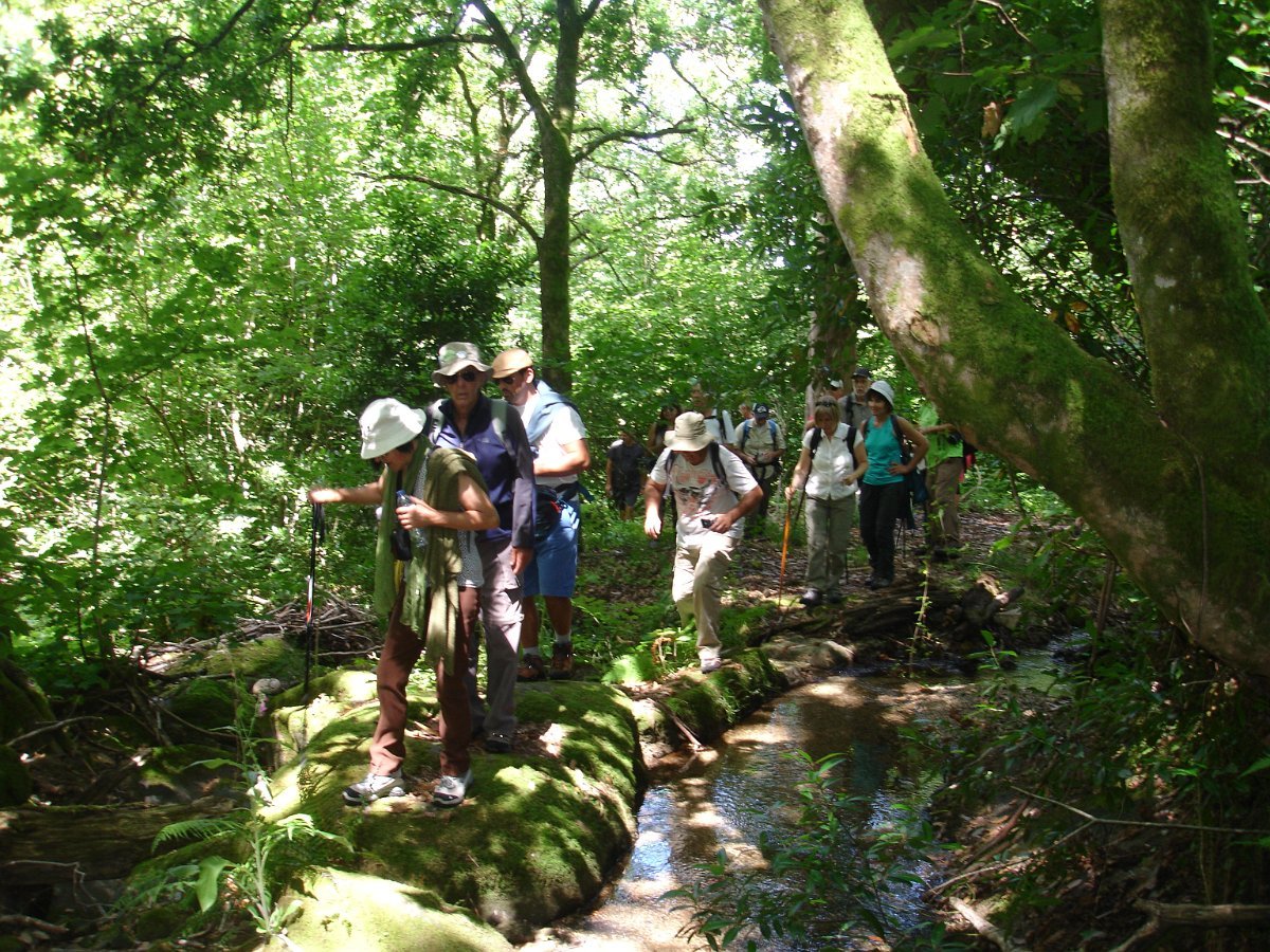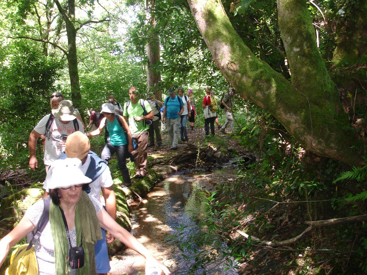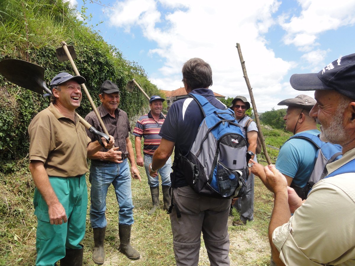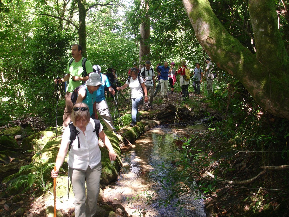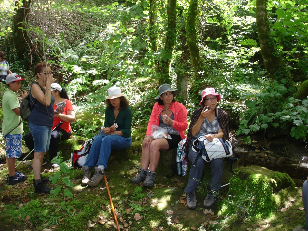 Aqui chegados às Lages Altas, o belo local foi aproveitado para uma pausa, aproveitando também para se tirar a foto de grupo. Atravessando as poldras, seguimos através de uma levada, passando depois em zonas de lameiro, onde cruzamos com um grupo de populares que de sachola às costas se dirigiam para a limpeza comunitária das levadas, pois há que fazer chegar a água aos campos de milho, feijão, batata e outros bens essenciais para a sua subsistência. Esta oportunidade foi aproveitada para uma troca de palavras.