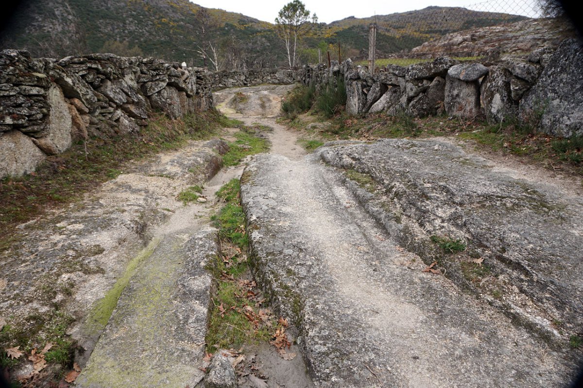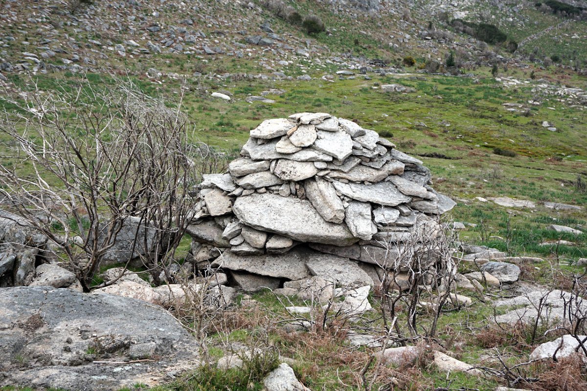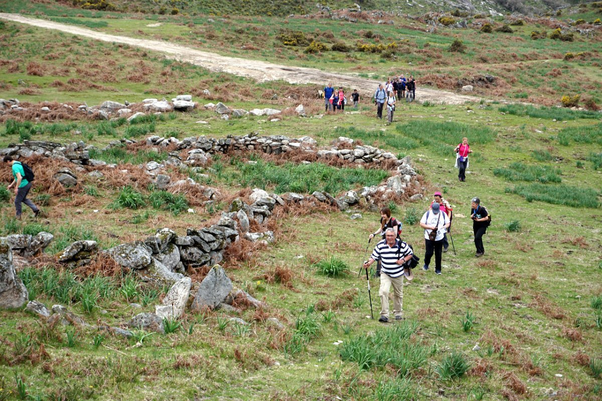 Retomada a marcha, a descida foi a corta-mato, apresentando alguma dificuldade, especialmente quando nos aproximamos de uns curros circulares, perdidos na imensidão da serra, com uma cardenha quase escondida nos penedos circundantes. A descida tornou-se complicada e foi a custo que alcançamos a sua calçada de acesso.