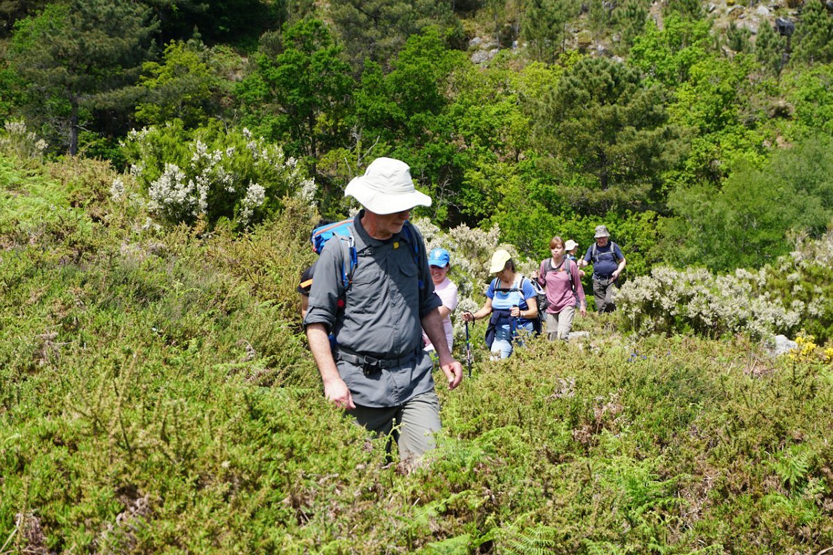 Mais uma conferência de mapa e GPS, concluindo-se que havia que voltar a trepar a escarpa para tentar chegar a outro carreiro que seguia a nível superior. Foi mais um esforço de subir a pés e mãos, agarrados às giestas e calhaus, trepando palmo a palmo até atingir uma bendita estreita calçada, por onde continuamos a destilar do esforço.