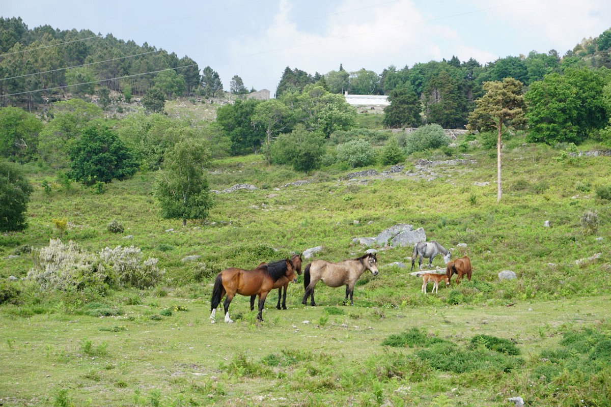 Cansados e um pouco arranhados mas cheios de adrenalina, fizemos a pausa da refeição na relva do curral, tirando do descanso alguns garranos e seus potros que por aí descansavam.