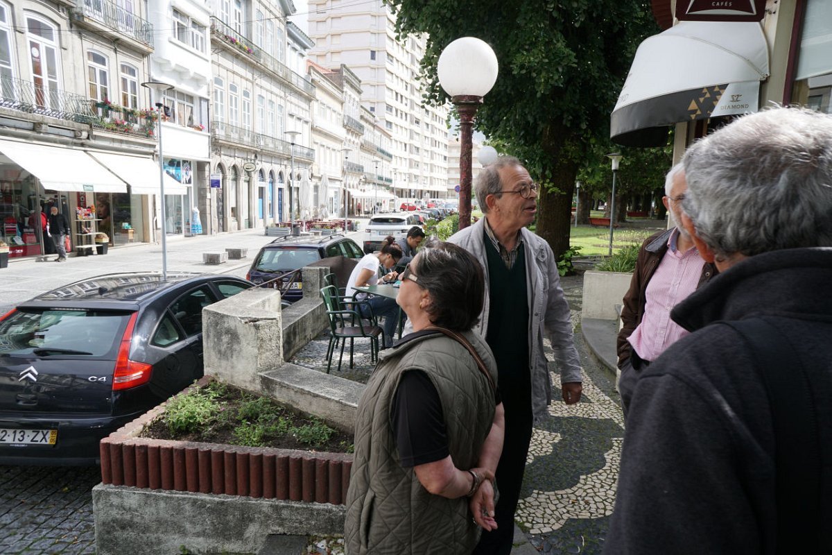 Começamos a observação da azulejaria junto ao café Girassol, tirando-se a foto de grupo junto da estátua de Viana e continuamos pela alameda João Alves Cerqueira até à igreja de S. Domingos, o mais majestoso dos templos quinhentistas da cidade, que subsiste do grandioso e extinto convento de Santa Cruz.