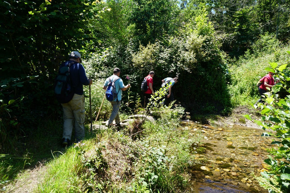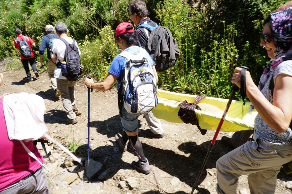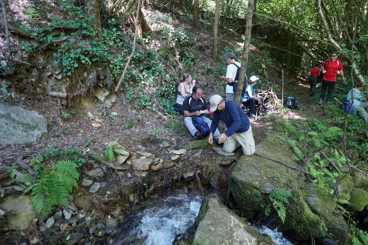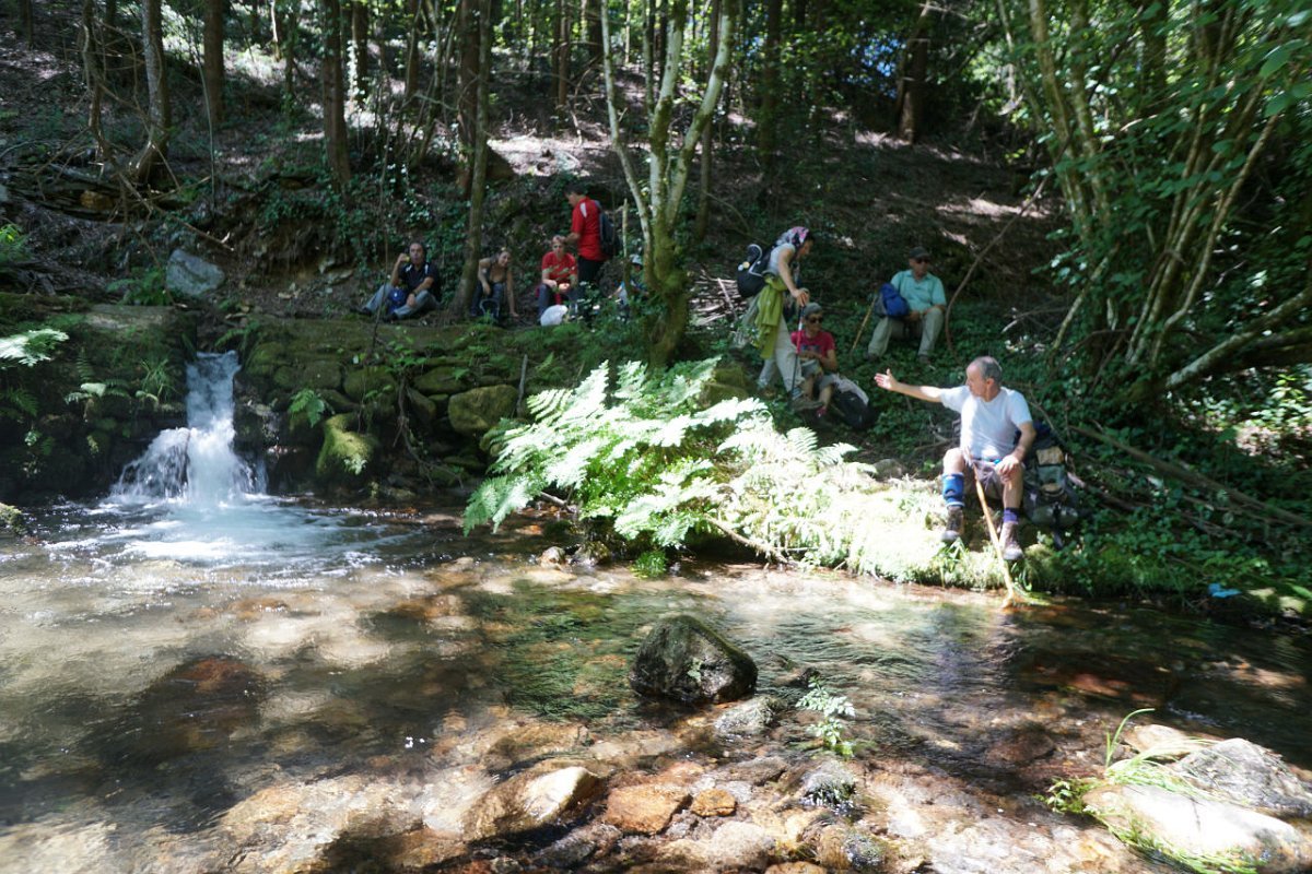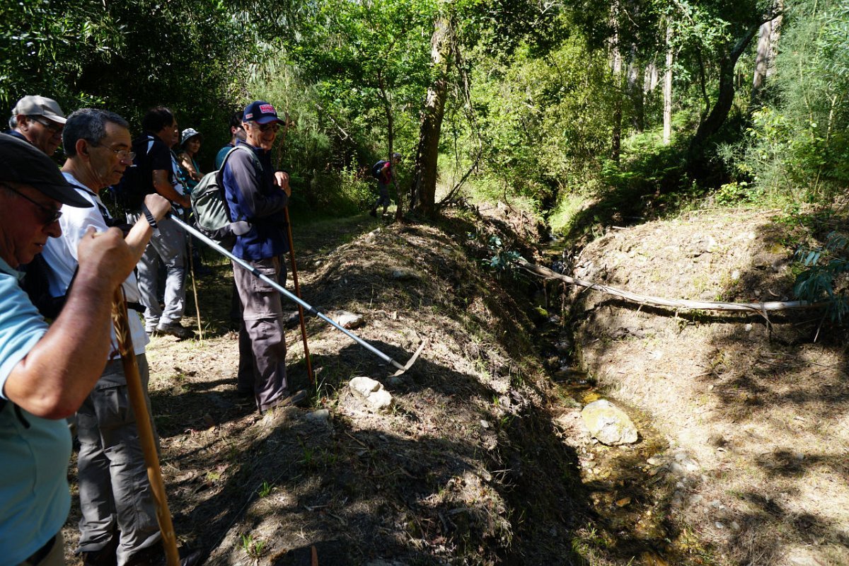 Depois de cruzar o lugar de Fontinhas atravessamos a mata de Lenteira e subimos o vale quase até ao cruzamento dos 7 caminhos, para cruzar a ribeira de Raibô. Aí fizemos uma pausa prolongada, pois a velhinha cadela da Manuela Rego, face ao muito calor e cansaço teve uma quebra e teve que ser transportada, primeiro ao colo e depois numa padiola improvisada, até às minas de volfrâmio de Azevedo.