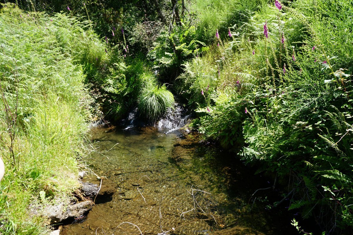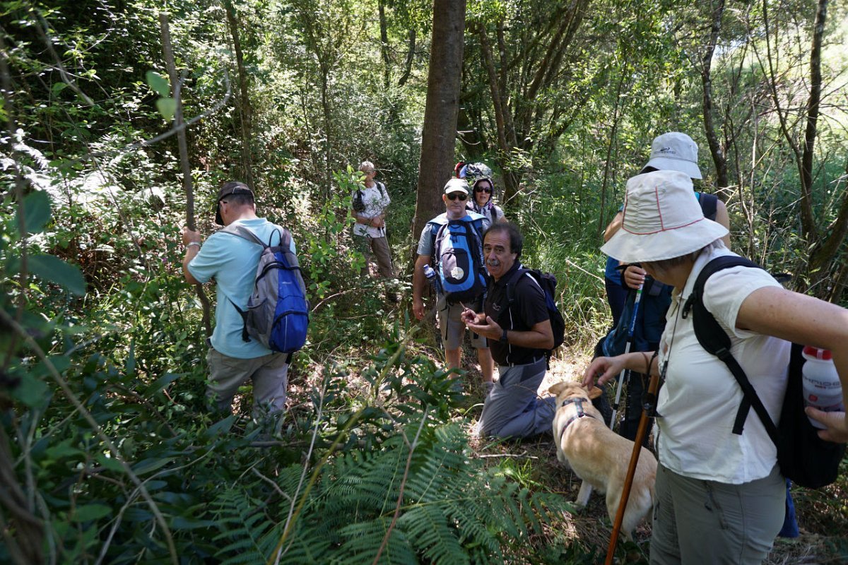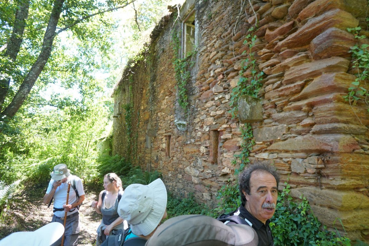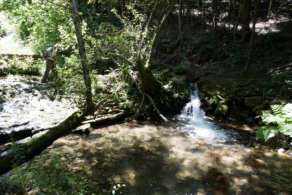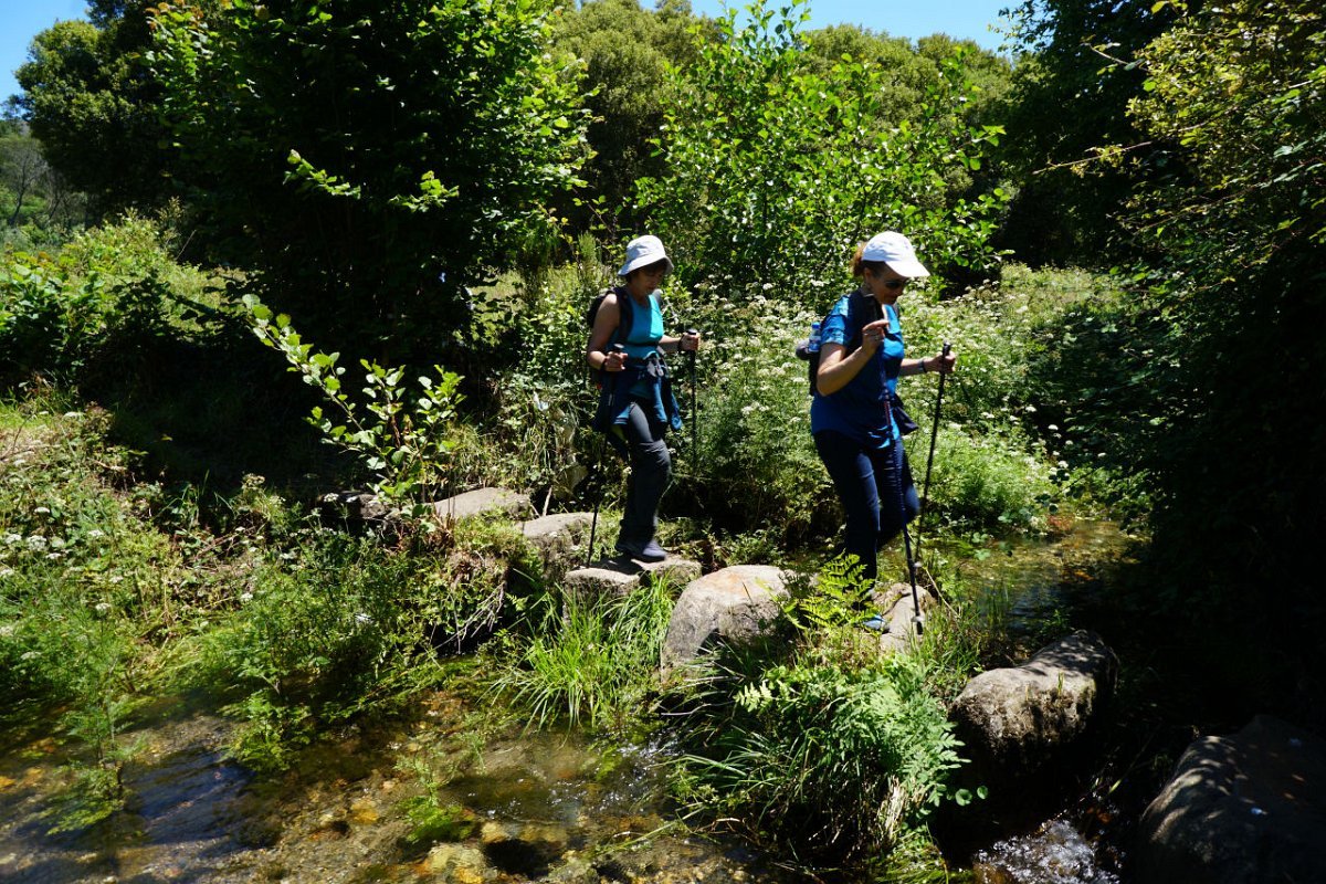 Depois de cruzar o lugar de Fontinhas atravessamos a mata de Lenteira e subimos o vale quase até ao cruzamento dos 7 caminhos, para cruzar a ribeira de Raibô. Aí fizemos uma pausa prolongada, pois a velhinha cadela da Manuela Rego, face ao muito calor e cansaço teve uma quebra e teve que ser transportada, primeiro ao colo e depois numa padiola improvisada, até às minas de volfrâmio de Azevedo.