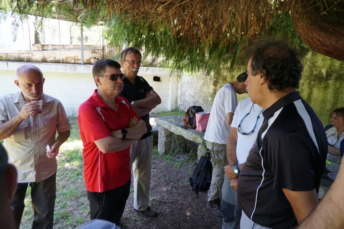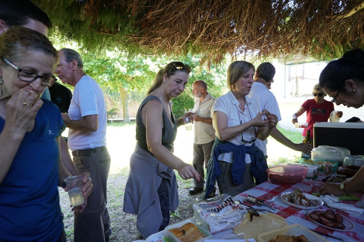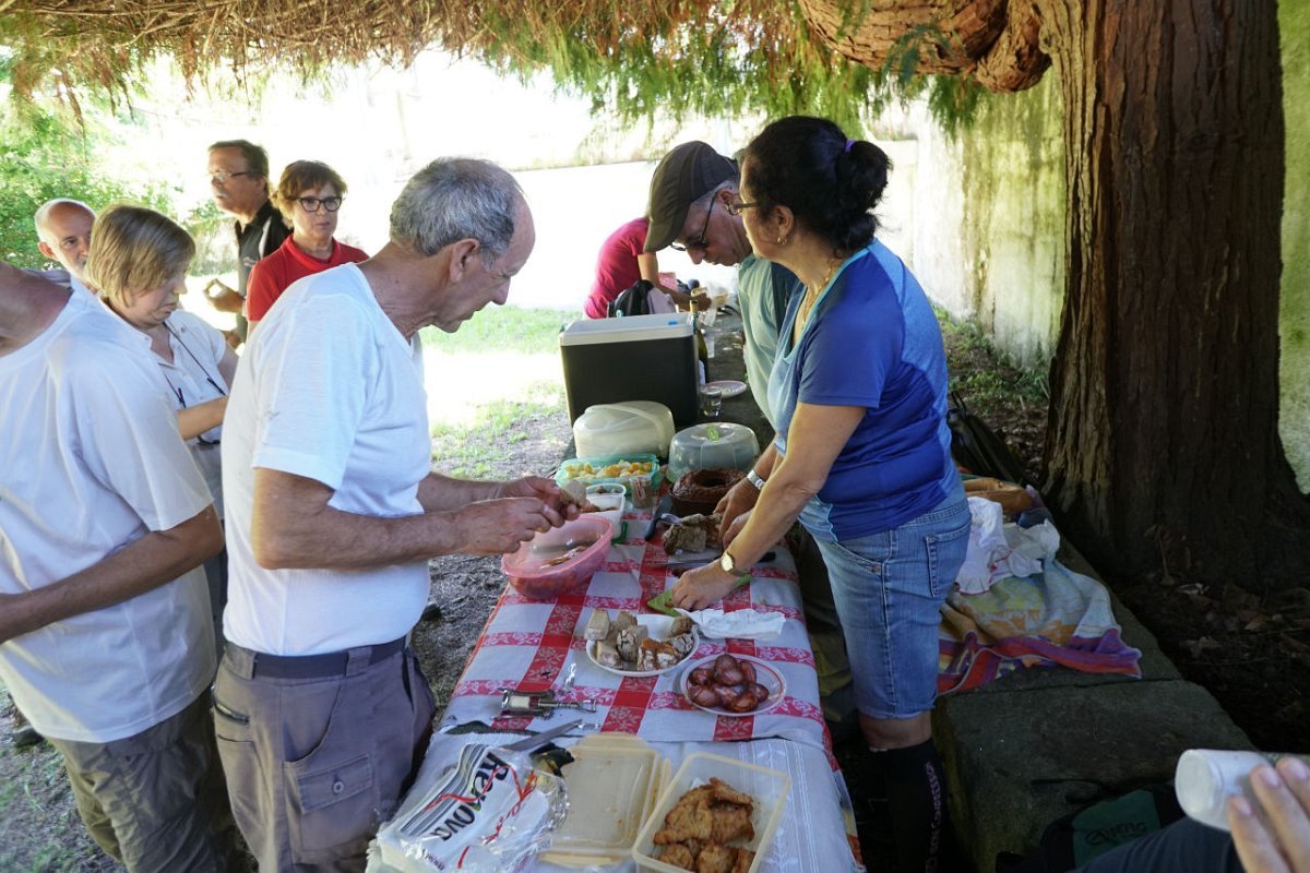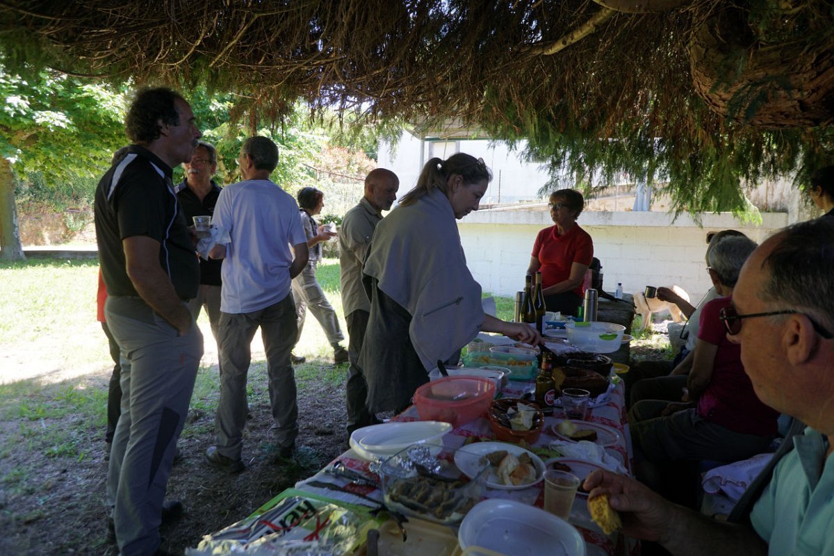 Quando finalmente demos conta que os poucos faltosos já estavam no "bem bom", na sombra do parque de merendas, seguimos pela Av. Barão S. Roque e Rua de Ribas, fazendo um pequeno desvio até ao Solar dos Aragões e monumento de homenagem ao Engº João José Azevedo. Daí continuamos até à Travessa das Fornas, onde finalmente trocamos os farnéis, numa providencial sombrinha em amena cavaqueira.