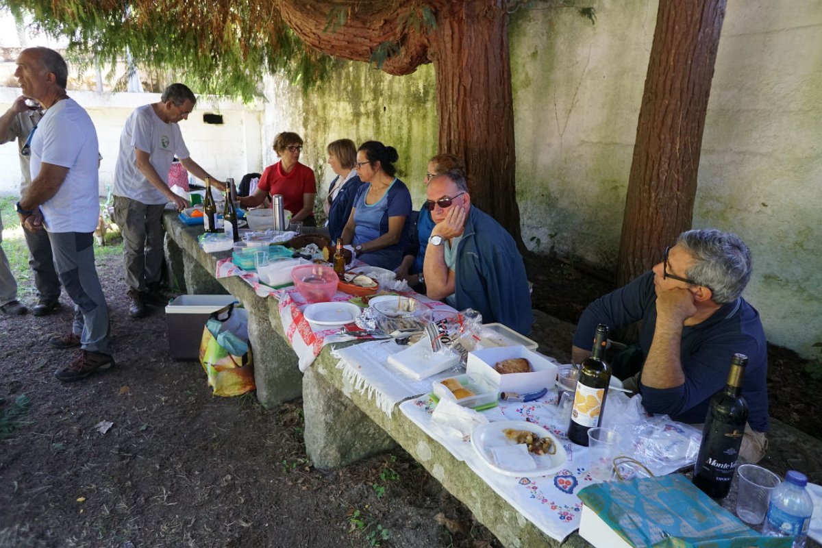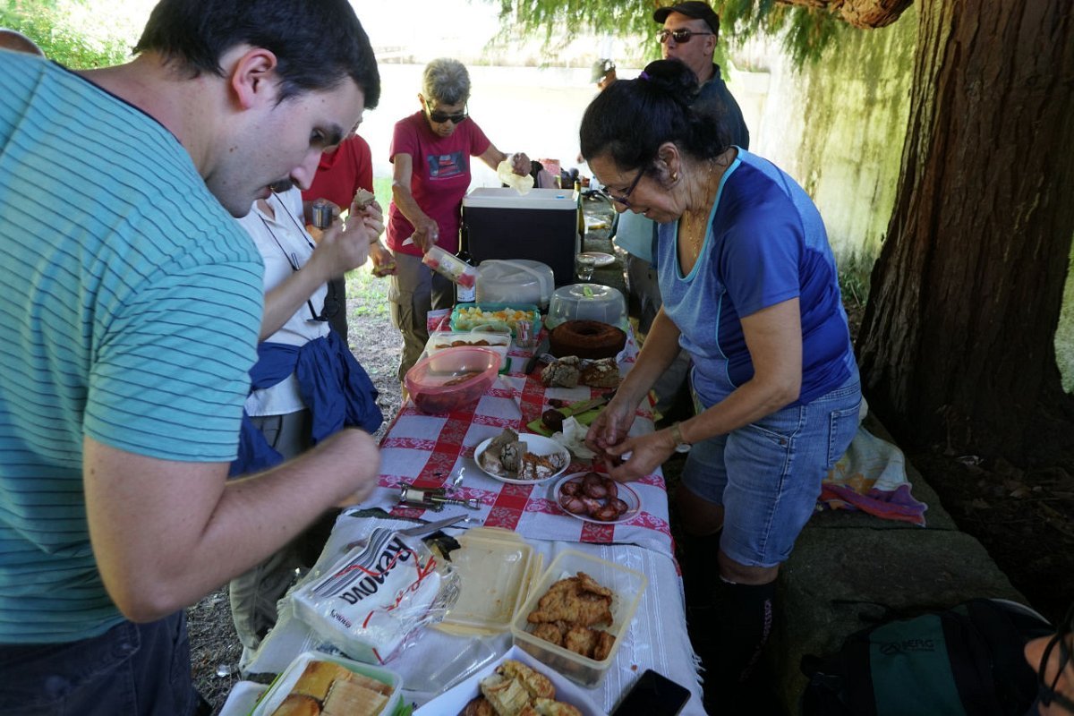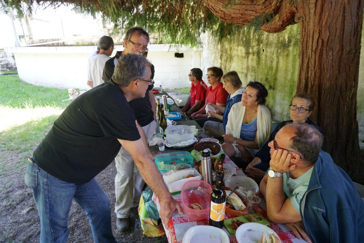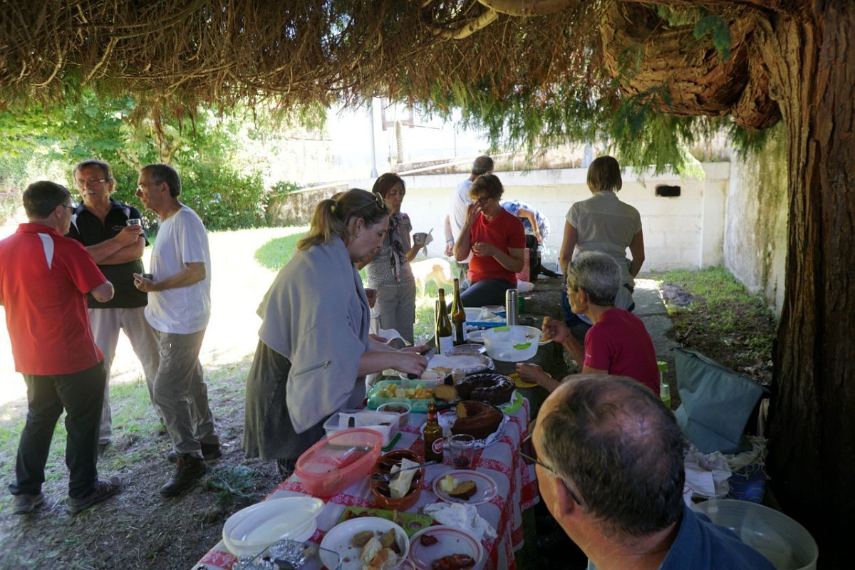 Quando finalmente demos conta que os poucos faltosos já estavam no "bem bom", na sombra do parque de merendas, seguimos pela Av. Barão S. Roque e Rua de Ribas, fazendo um pequeno desvio até ao Solar dos Aragões e monumento de homenagem ao Engº João José Azevedo. Daí continuamos até à Travessa das Fornas, onde finalmente trocamos os farnéis, numa providencial sombrinha em amena cavaqueira.