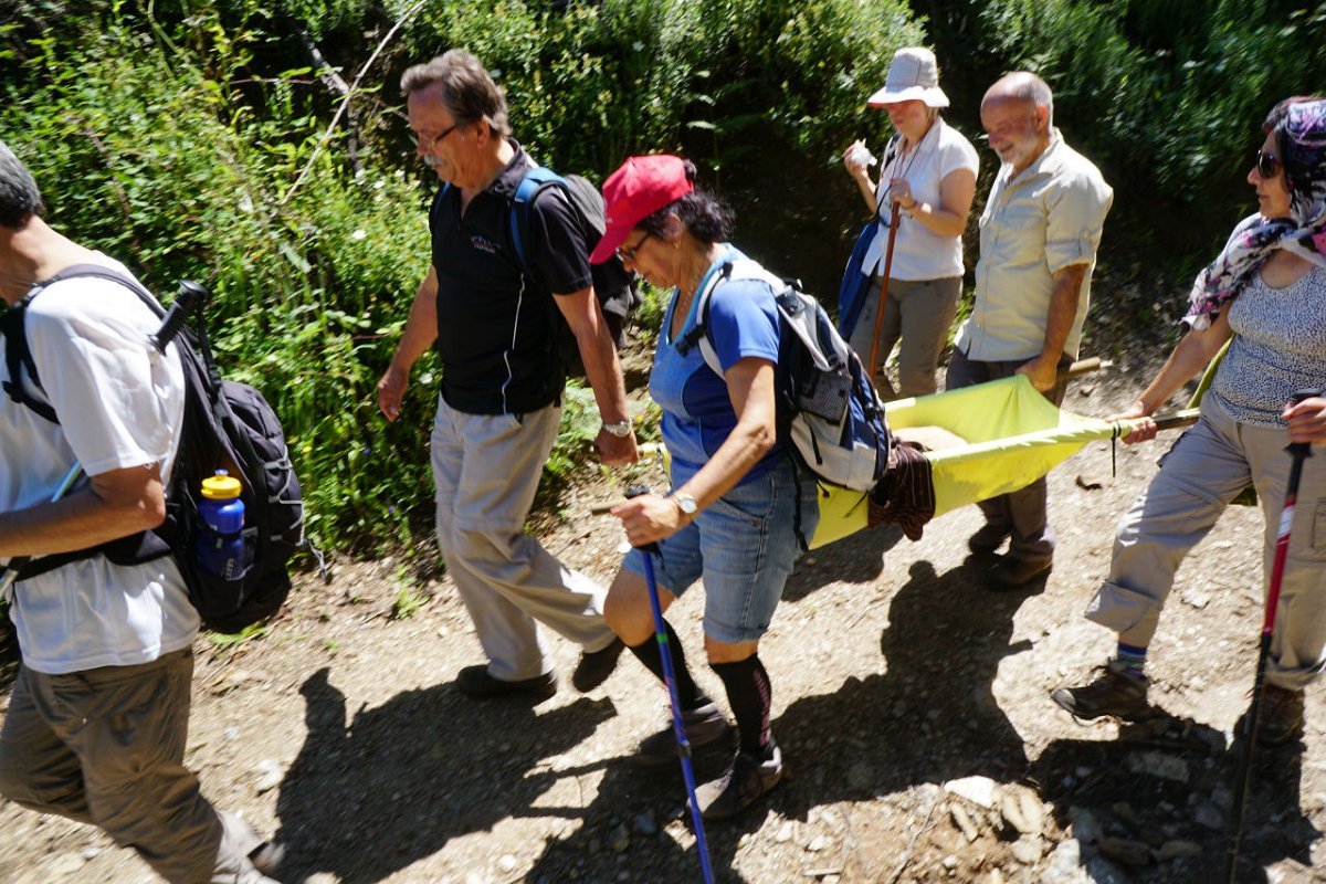 A bicha de nome Rita (!) estava exausta e as agruras do percurso foram para além da sua já débil resistência, obrigando a este improviso que se mostrou providencial, pois recuperou rapidamente as forças, passando a acompanhar pelos seus meios os preocupados donos, dispensado os "maqueiros" de mais esse esforço.