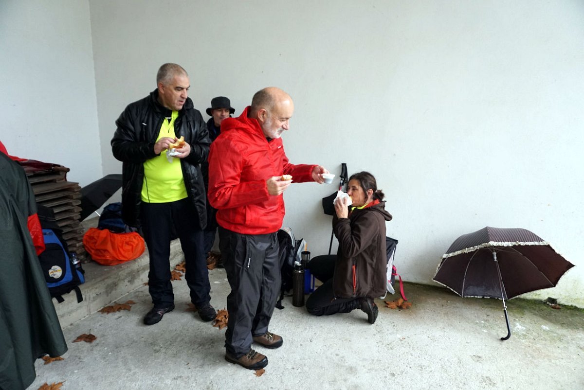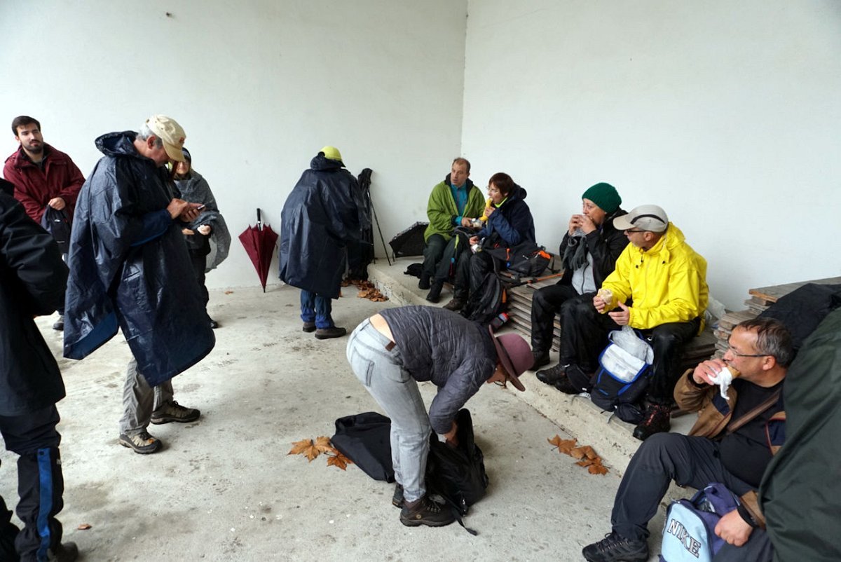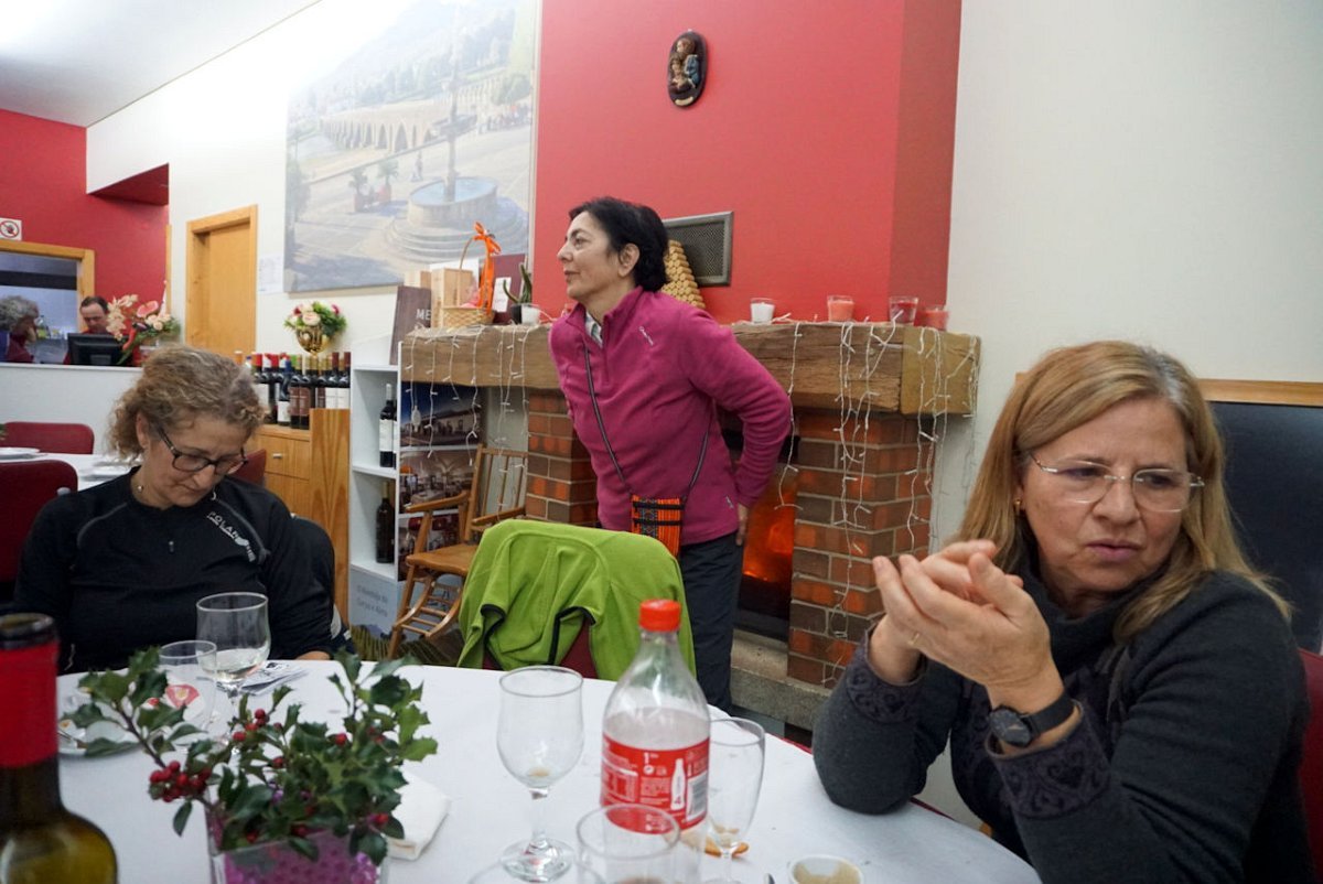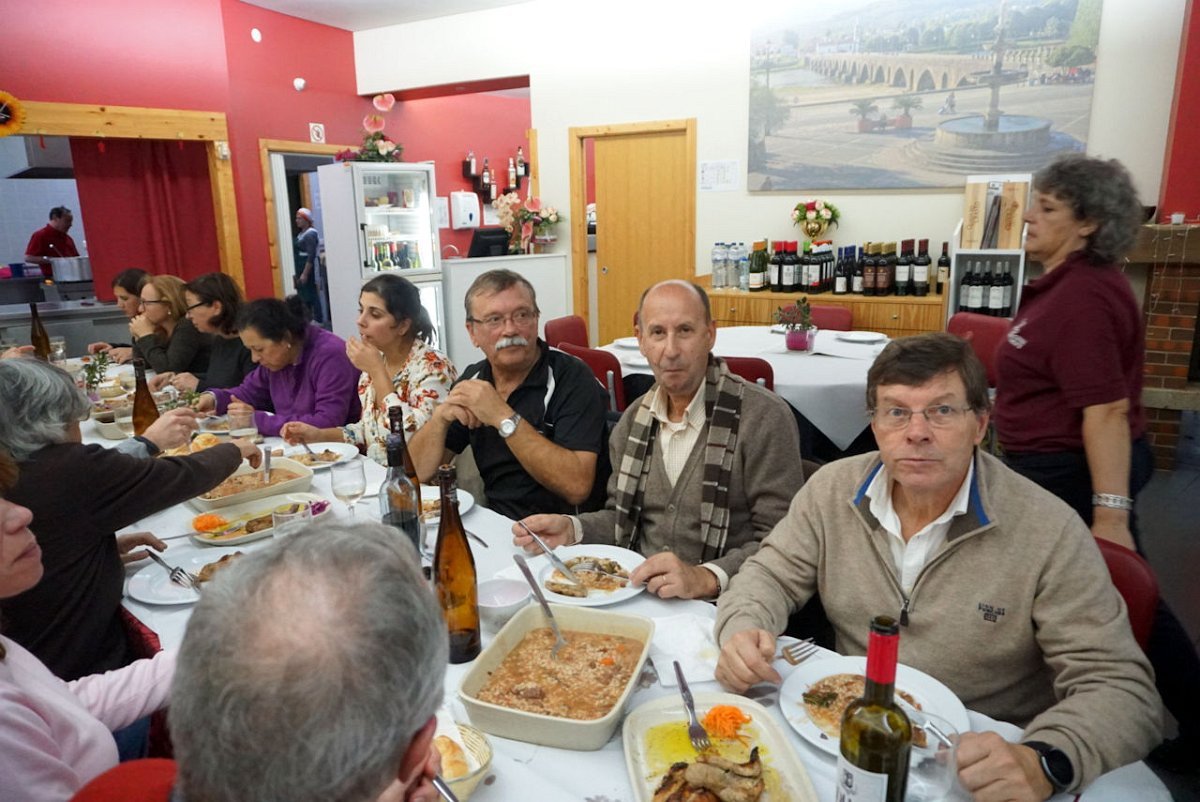 Finalmente chegamos, completamente encharcados da chuva e do ressoamento dos impermeáveis, pelo que havia que mudar de roupa e botas antes de dar início à segunda parte do programa, prevista para Cepões no restaurante Casa Carneiro. Como não havia onde fazer as mudas, foi a estrada que serviu de balneário, perante o espanto dos passantes que estranharam estes preparos.