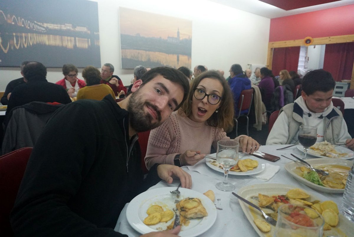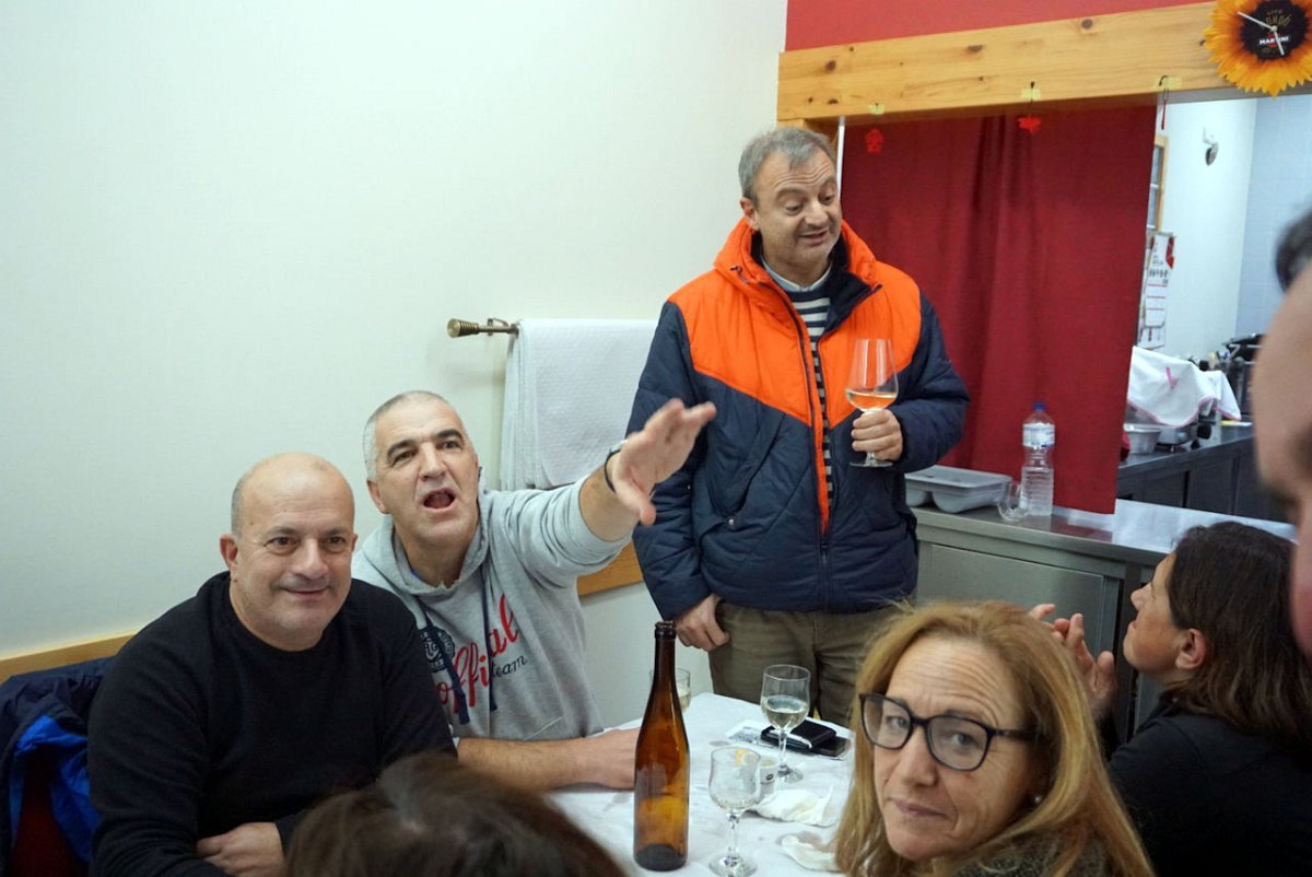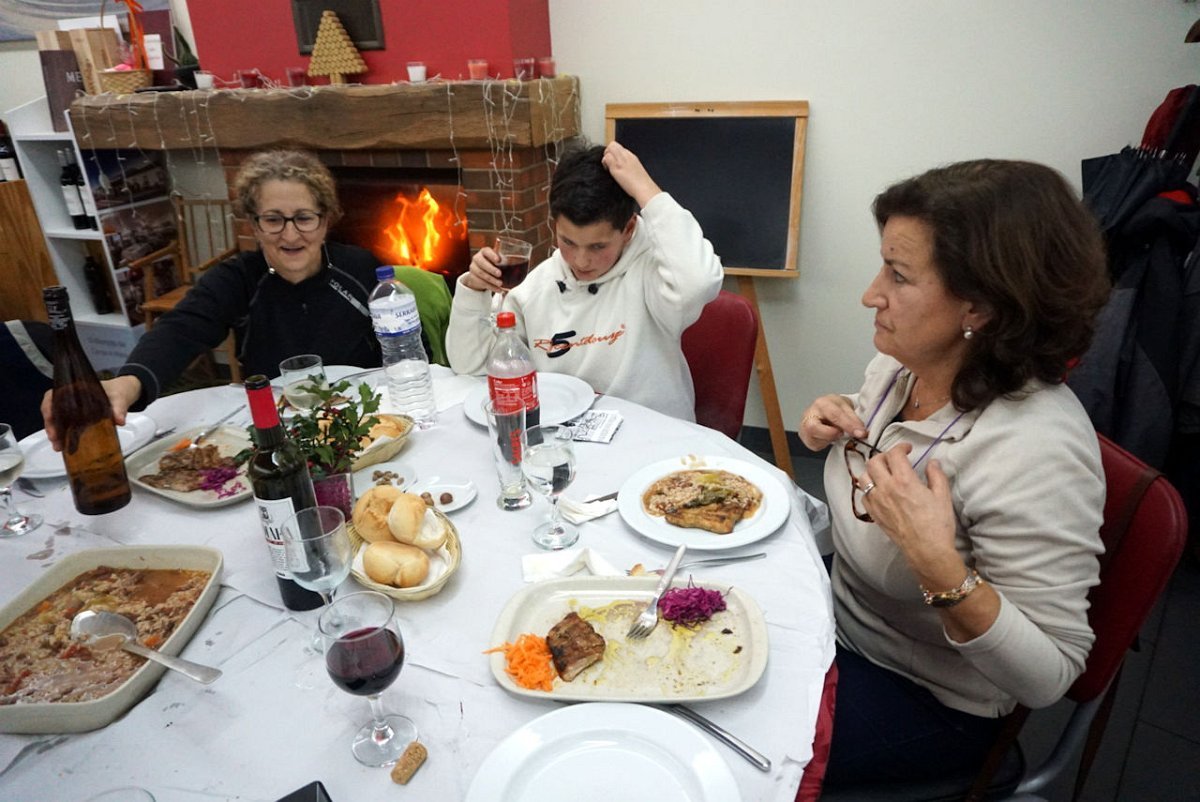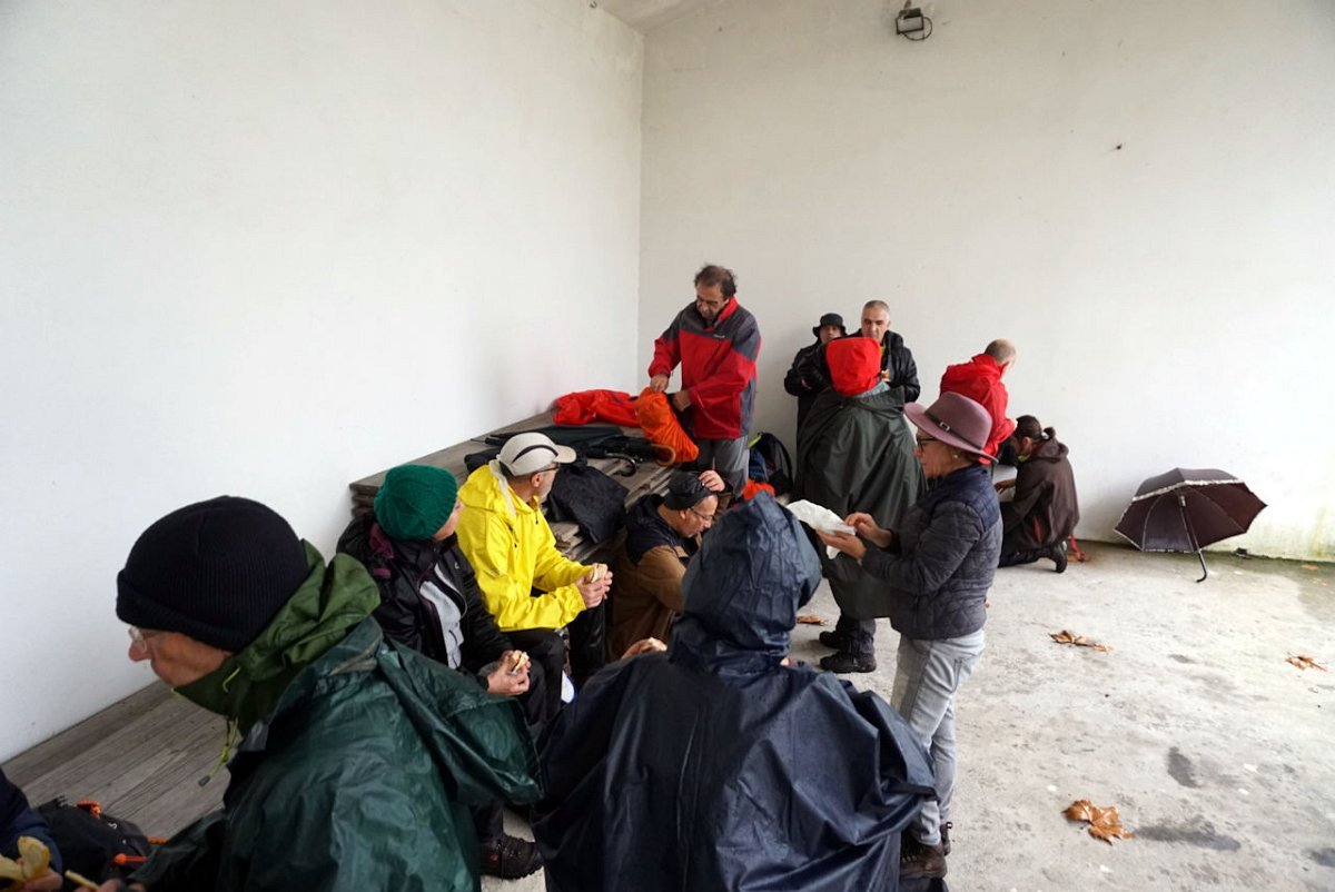Finalmente chegamos, completamente encharcados da chuva e do ressoamento dos impermeáveis, pelo que havia que mudar de roupa e botas antes de dar início à segunda parte do programa, prevista para Cepões no restaurante Casa Carneiro. Como não havia onde fazer as mudas, foi a estrada que serviu de balneário, perante o espanto dos passantes que estranharam estes preparos.