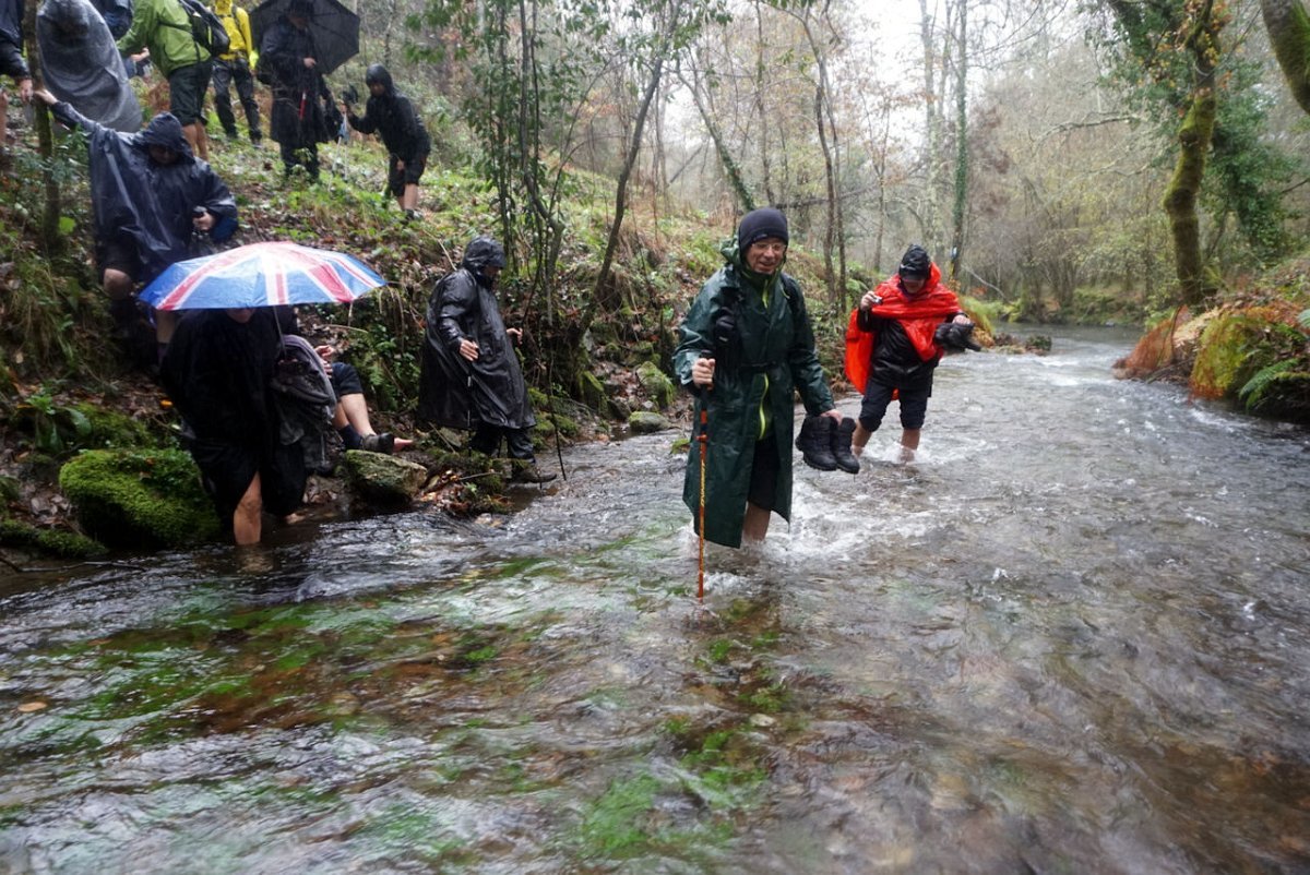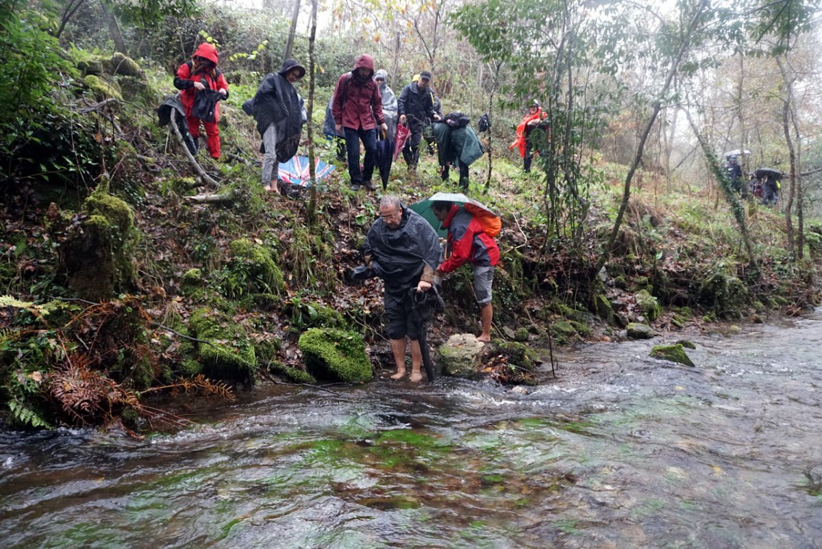 Foi um espetáculo! Houve quem tentasse encontrar um local melhor mais a montante, mas não havia mesmo alternativa, pelo que um a um os valentes caminheiros despojaram-se das botas e meias e molharam os delicados pezinhos na torrente do ribeiro que nos impedia a progressão.