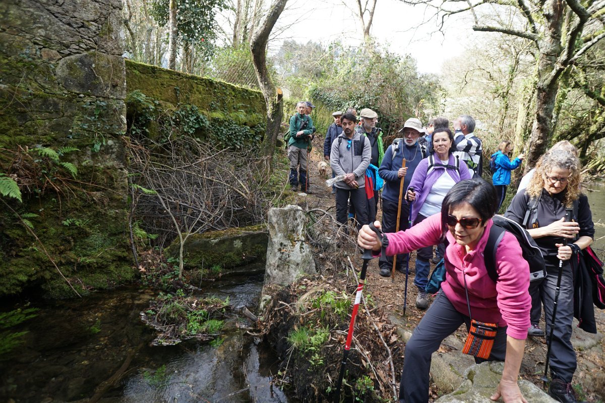 A dificuldade veio depois, pois a passagem do rio junto ao moinho era uma autêntica ratoeira, com as pedras escorregadias a causar alguns calafrios e molhadelas. Seguiu-se a progressão pelo carreiro até uma velha ponte de cimento, em que cruzamos o Âncora pela 4ª vez, continuando lentamente pela margem direita na direção da “casa da Alhada”, onde voltamos a cruzar pela 5ª vez o Âncora, aproveitando para fazer a foto de grupo.