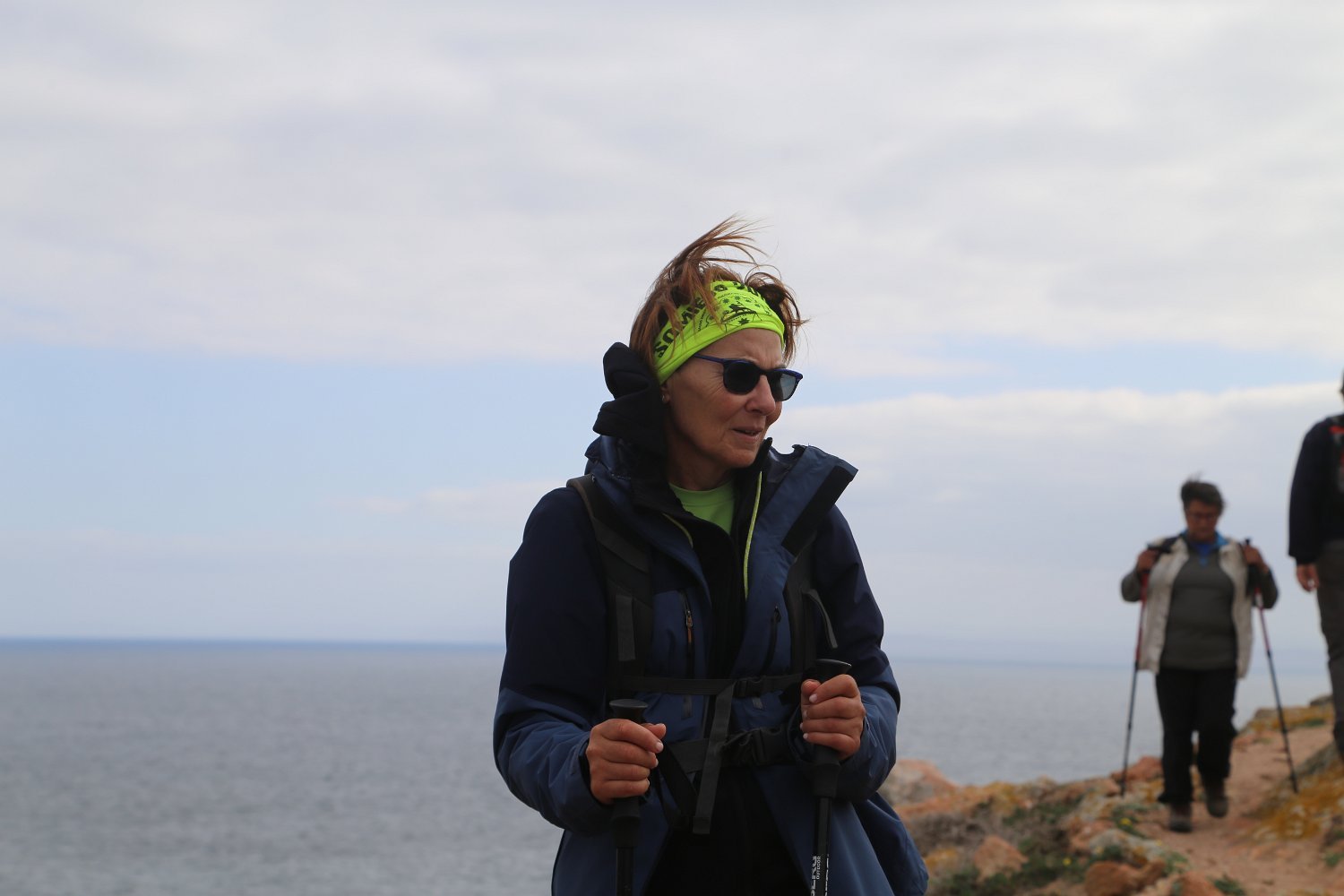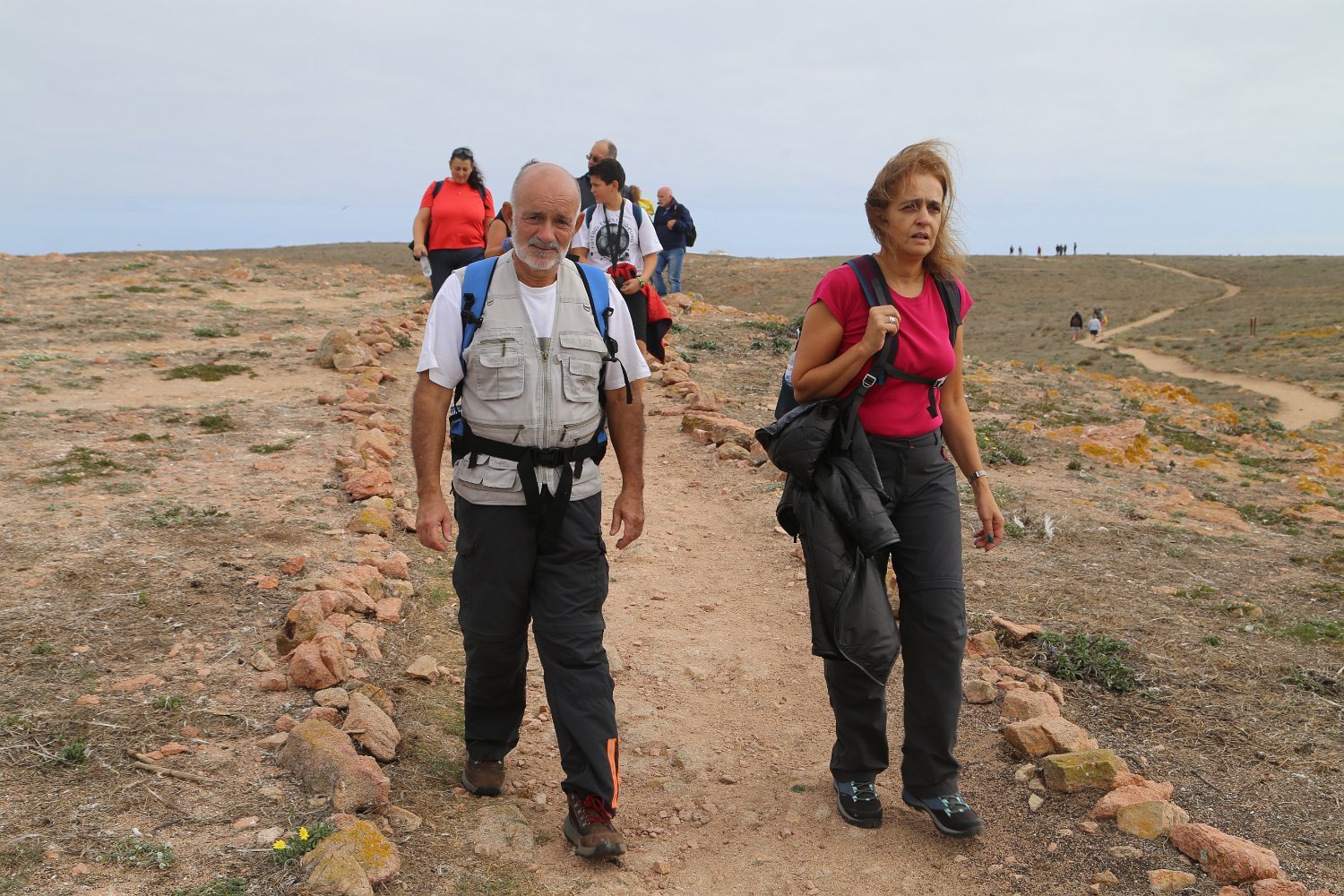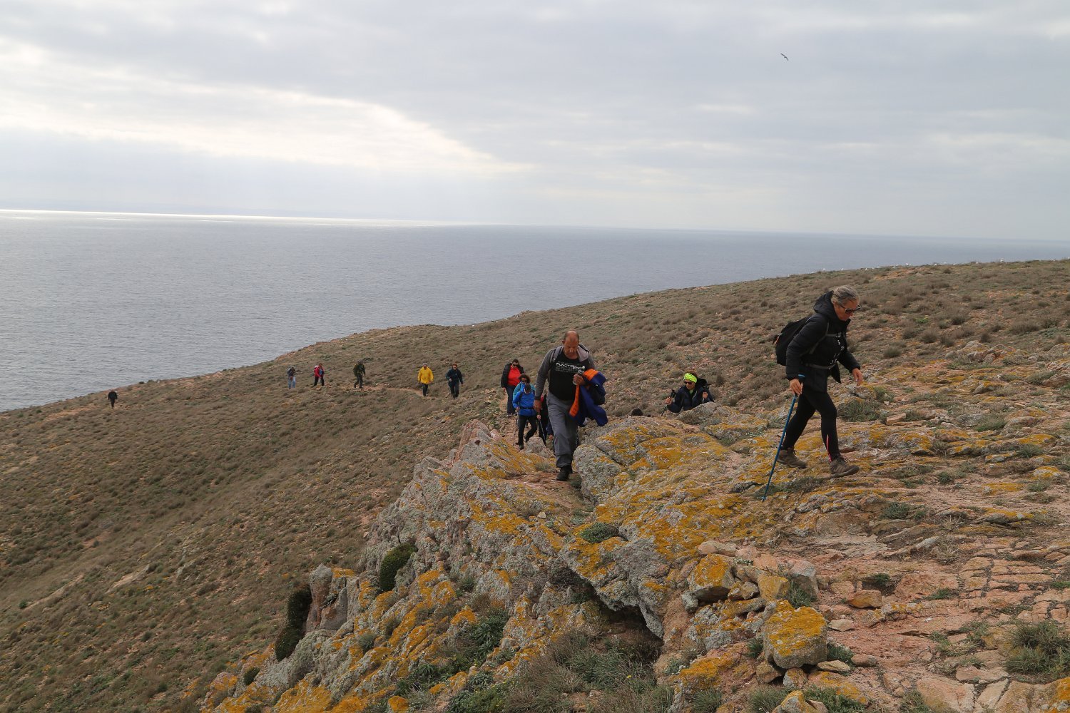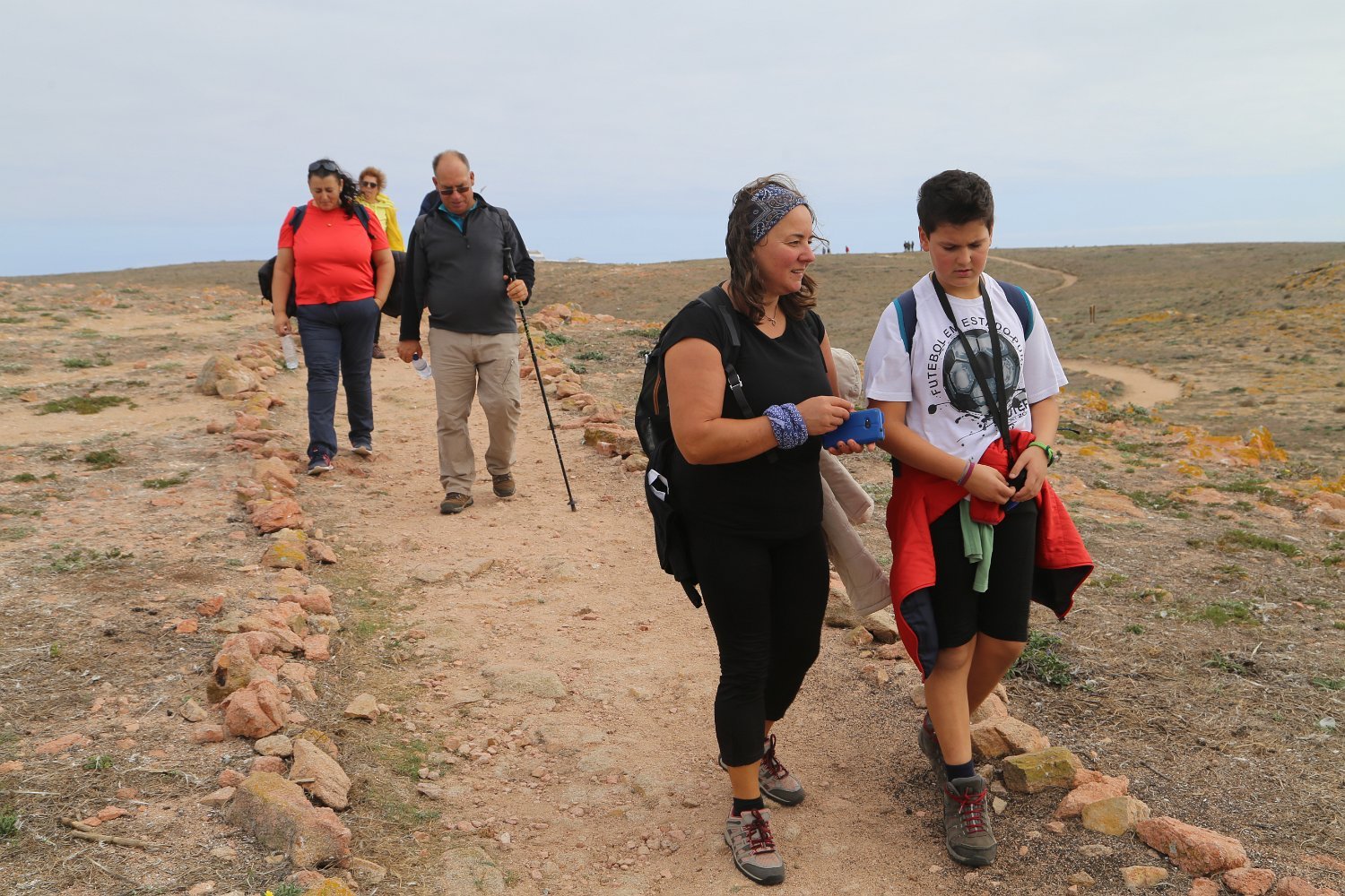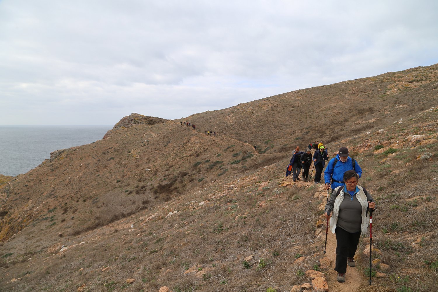 Depois de reagrupar com os que fizeram a travessia no semirrígido amarelo “Homero” começamos a subida pelo “Carreiro do Mosteiro” passando pelo “bairro dos pescadores” e antes do parque de campismo iniciamos o trilho que nos levou aos miradouros de “Melreu” e um pouco mais à frente de “buzinas”. Foi o ponto mais oriental da “ilha velha” com Peniche a destacar-se na costa litoral no horizonte e com a ilhota do “Cerro da Velha” mais cercana. Depois de uma curta paragem retomamos a subida pelo bem delimitado carreiro até ao ponto mais elevado da “Ilha Velha”, de onde se tem uma perspetiva completa da ilha e seu entorno.