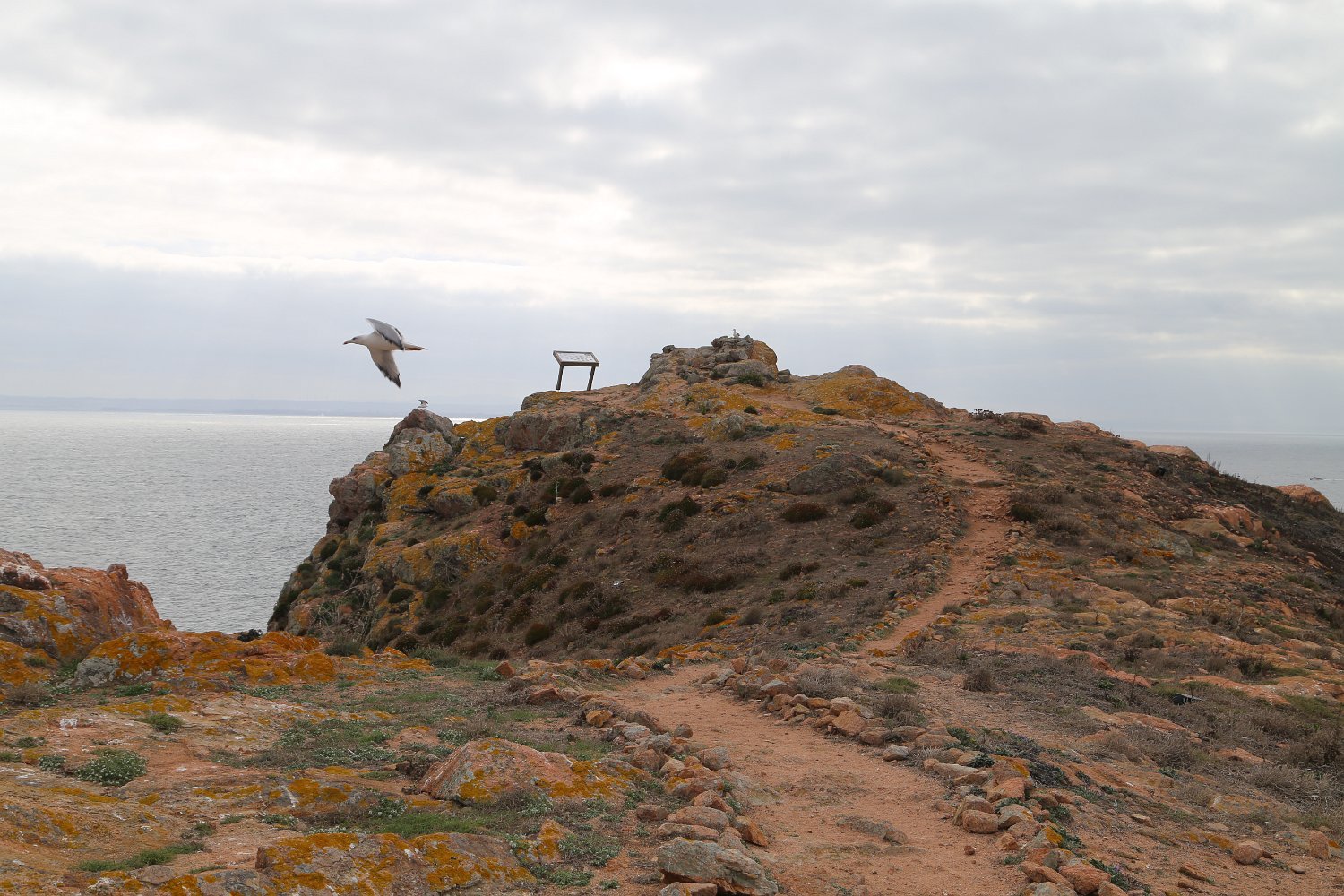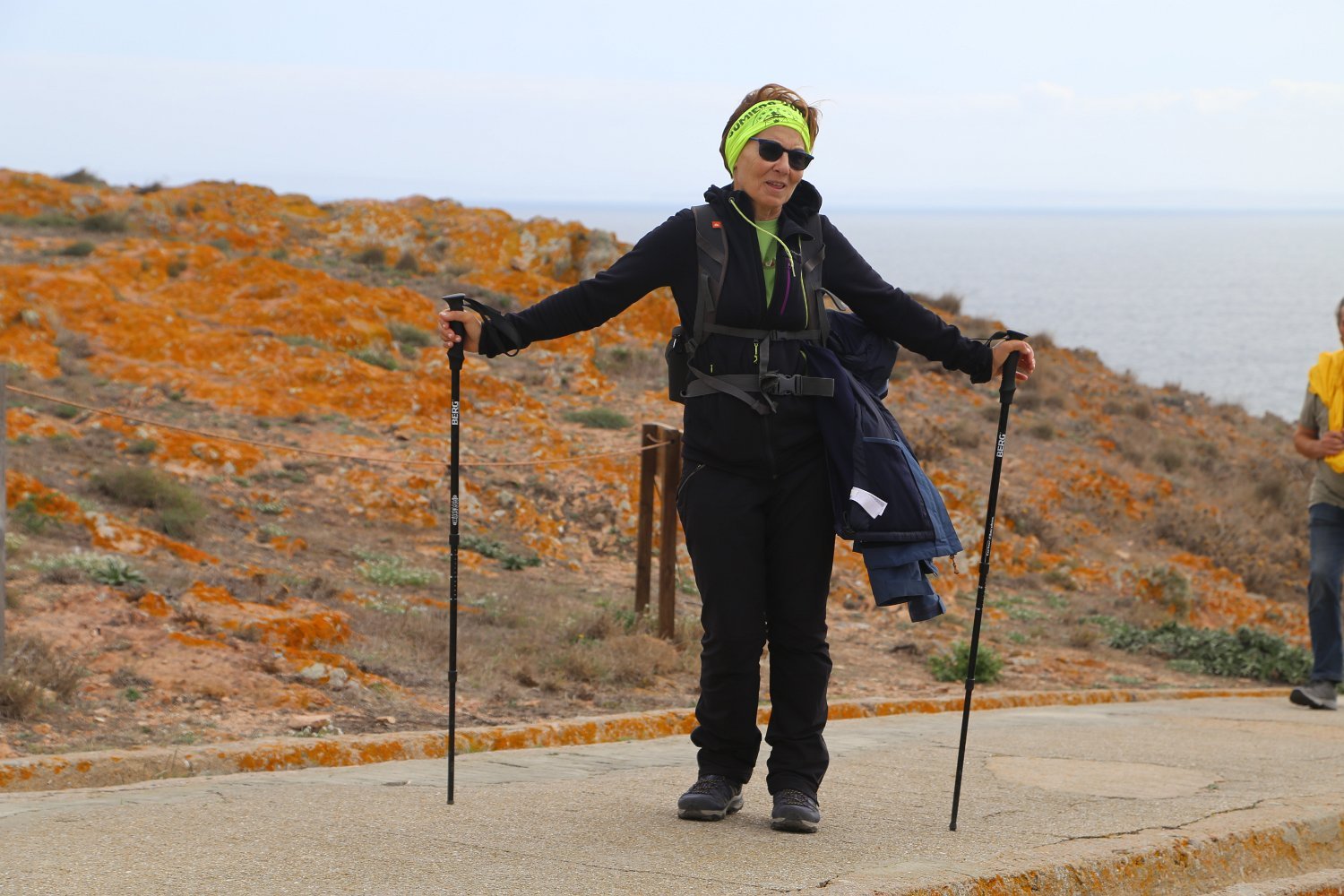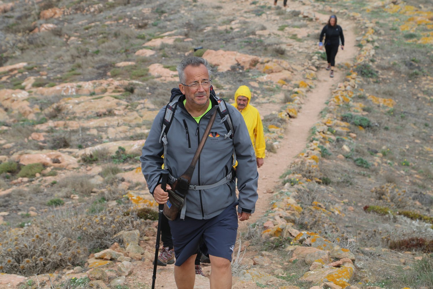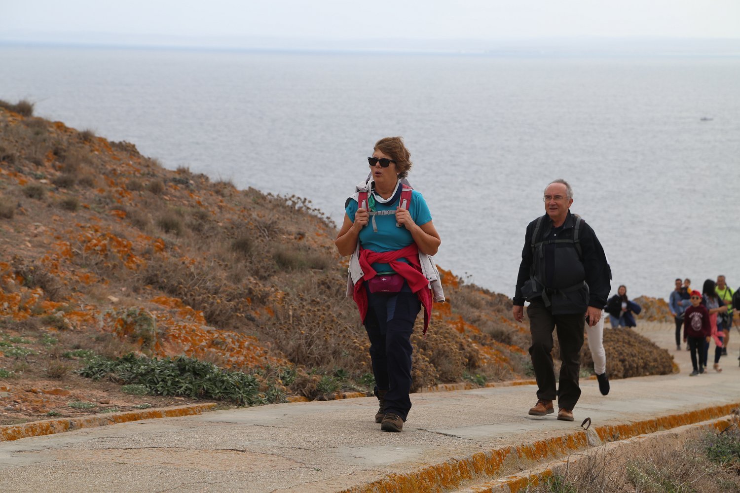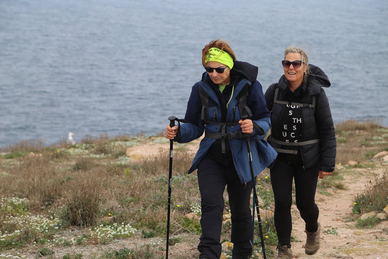 Depois de reagrupar com os que fizeram a travessia no semirrígido amarelo “Homero” começamos a subida pelo “Carreiro do Mosteiro” passando pelo “bairro dos pescadores” e antes do parque de campismo iniciamos o trilho que nos levou aos miradouros de “Melreu” e um pouco mais à frente de “buzinas”. Foi o ponto mais oriental da “ilha velha” com Peniche a destacar-se na costa litoral no horizonte e com a ilhota do “Cerro da Velha” mais cercana. Depois de uma curta paragem retomamos a subida pelo bem delimitado carreiro até ao ponto mais elevado da “Ilha Velha”, de onde se tem uma perspetiva completa da ilha e seu entorno.
