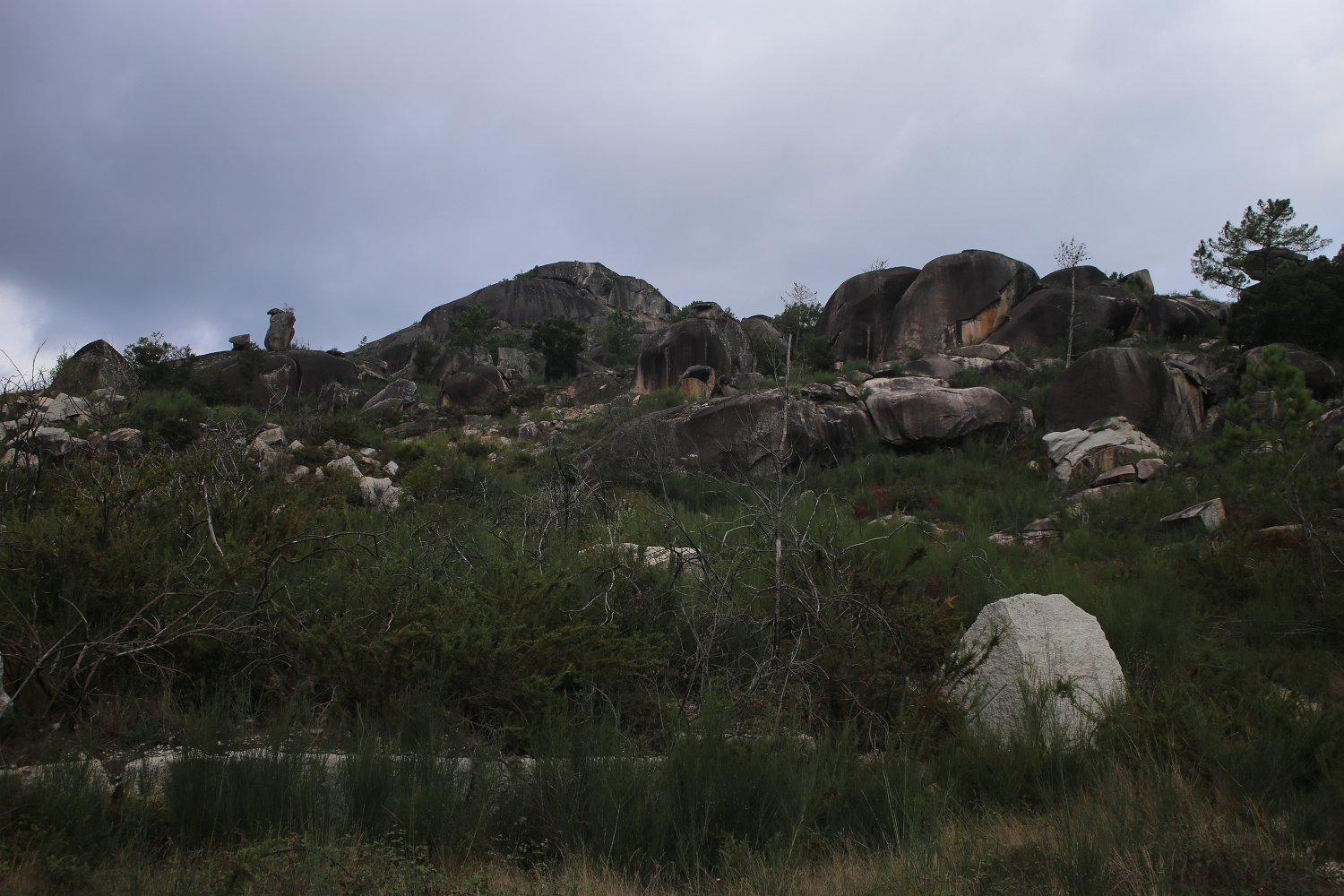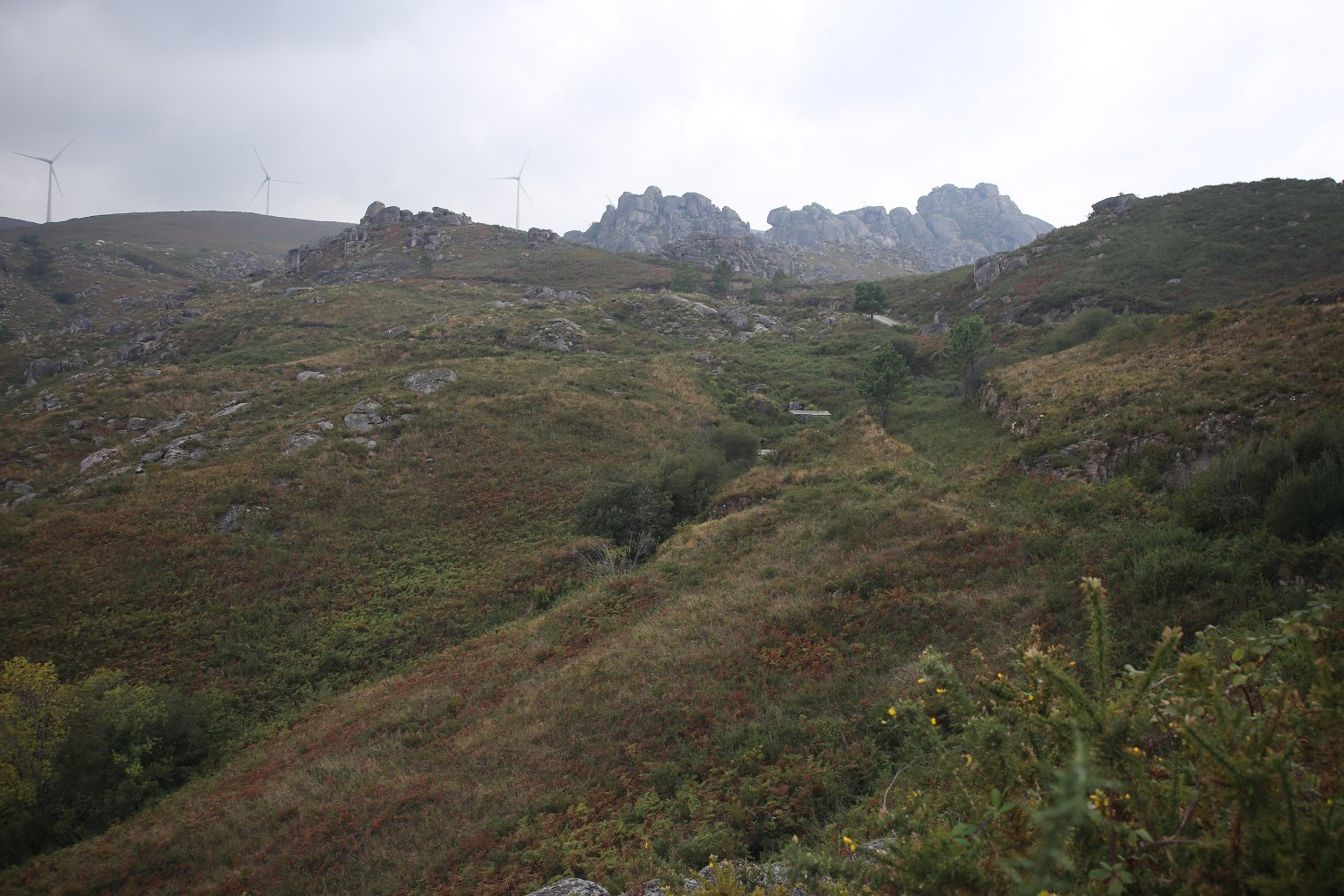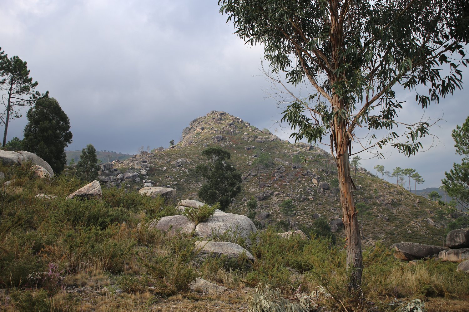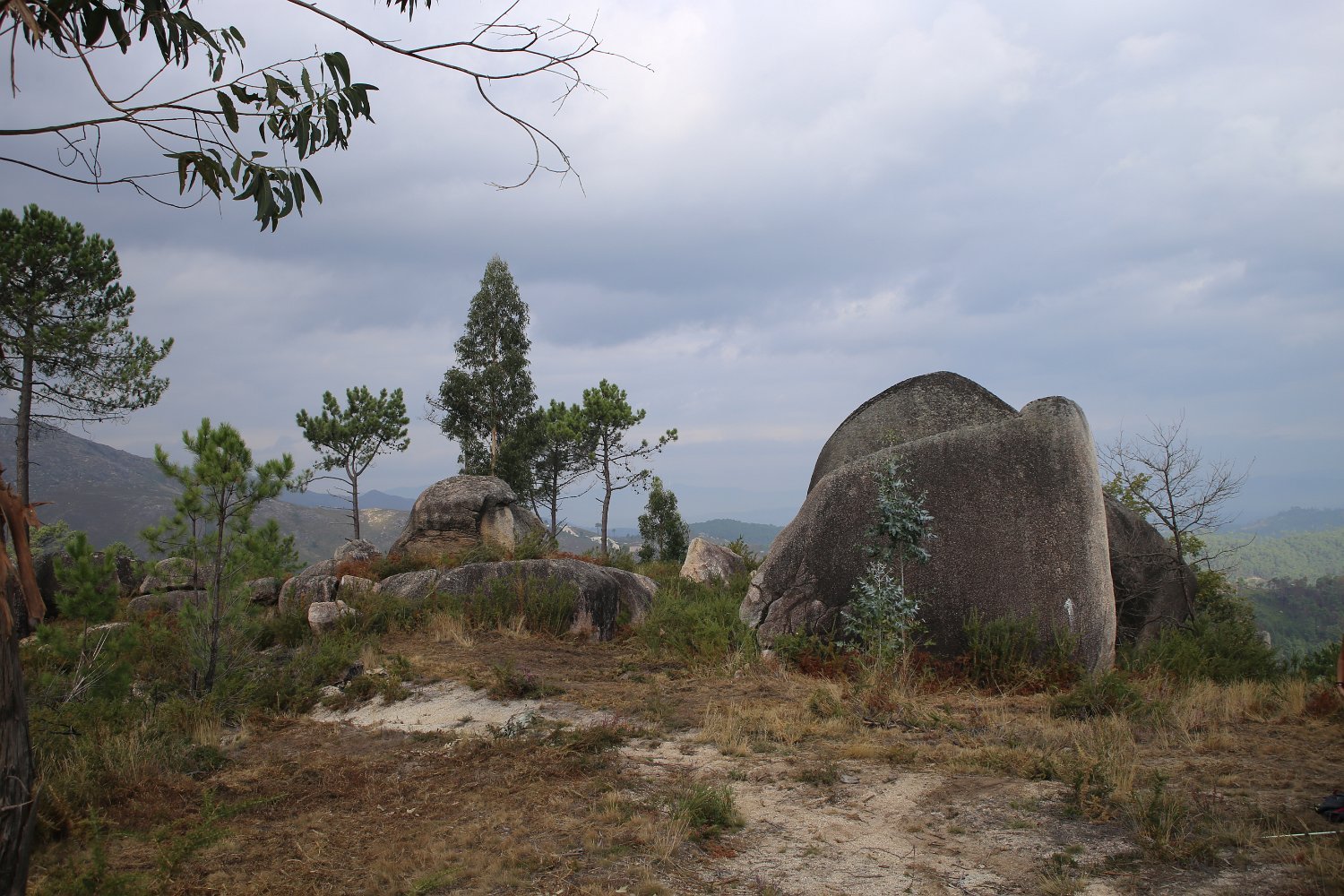 Cruzamos entretanto o “ribeiro dos Cortelhos” e após curta reorientação continuamos por terrenos varridos pelos fogos, agora arrasados pelas máquinas de rastos, para preparação de nova plantação florestal. À nossa volta, os enormes cabeços rochosos que emergem dispersos pela paisagem e as muitas explorações de granito ornamental que esventram os montes desfeando a paisagem.