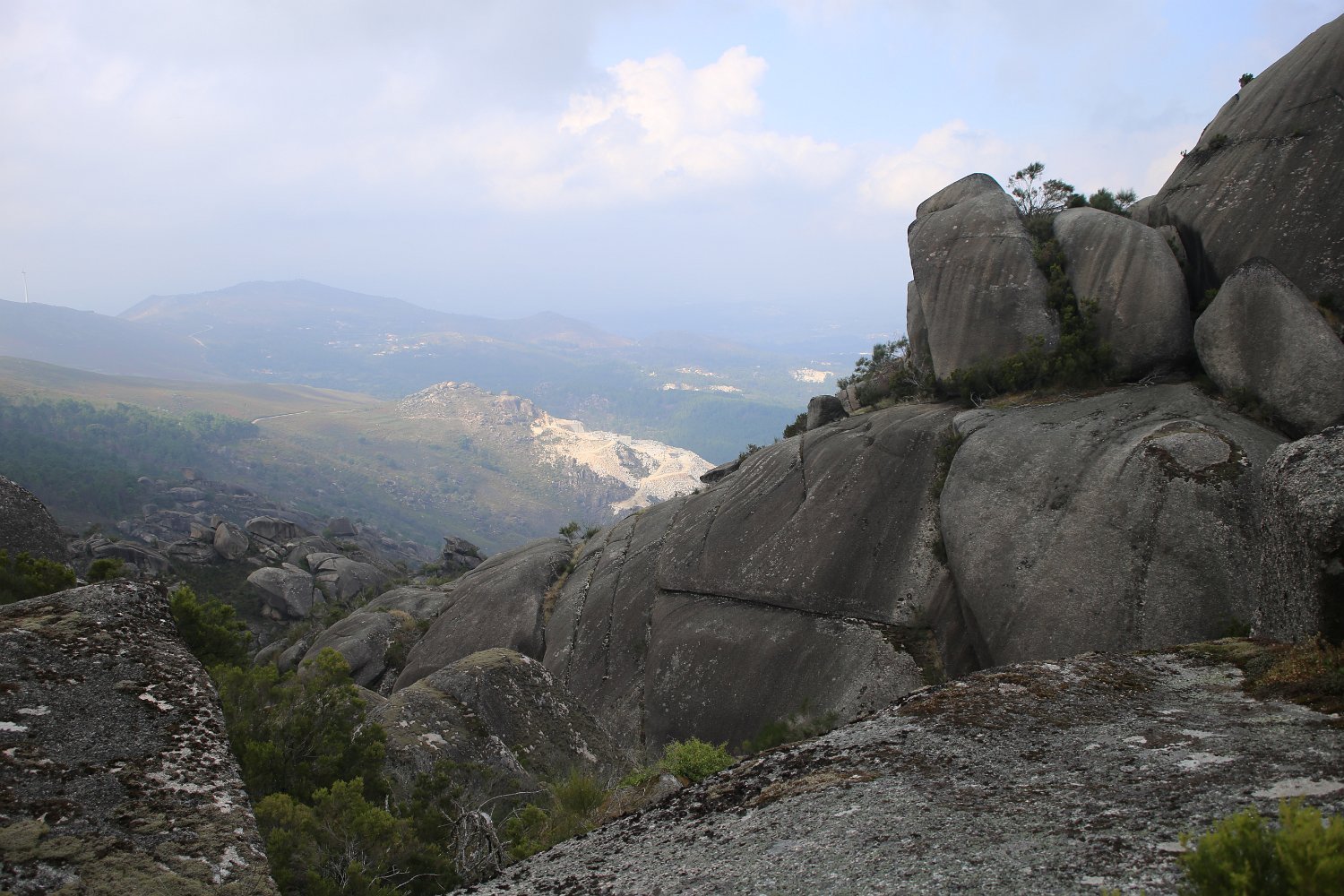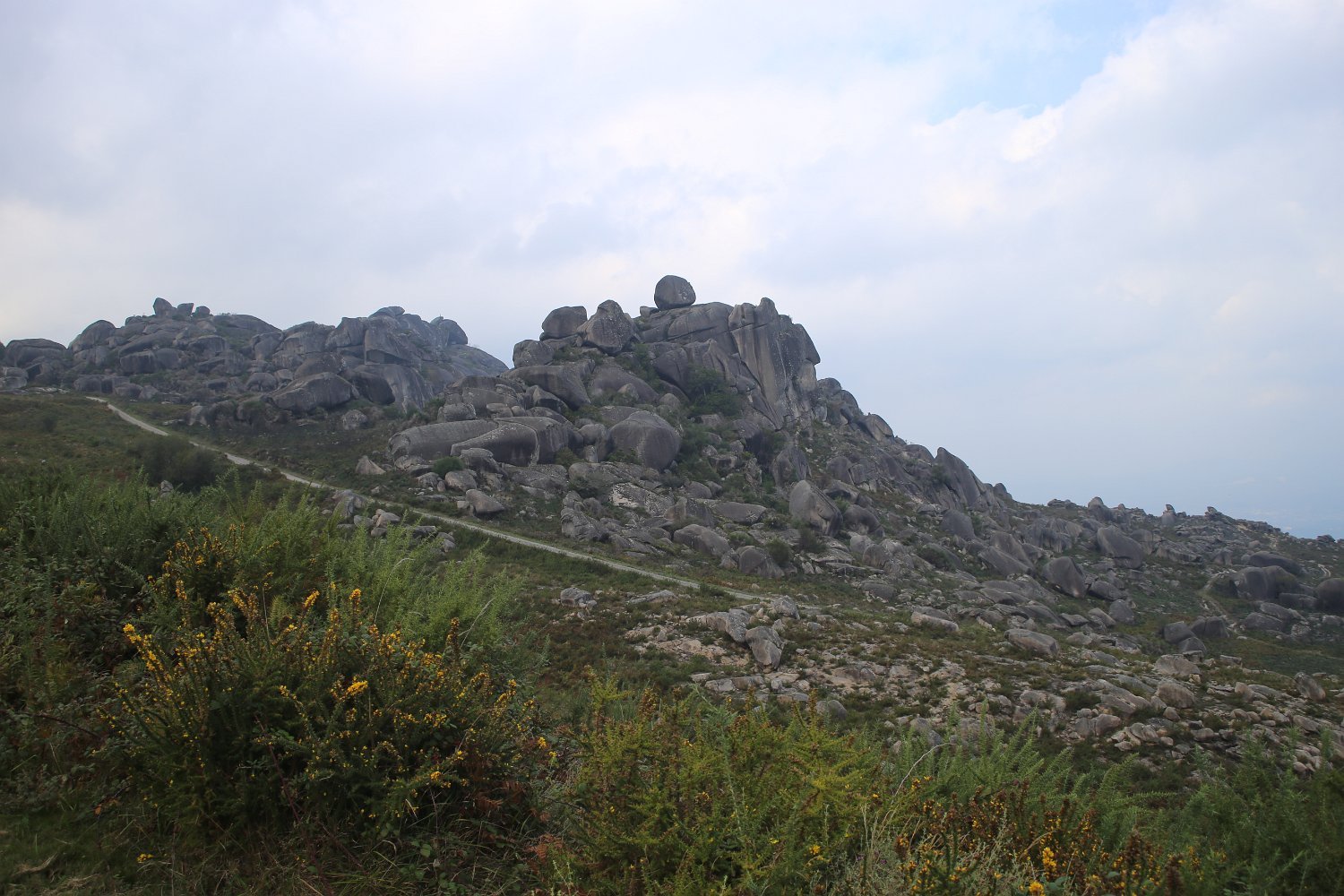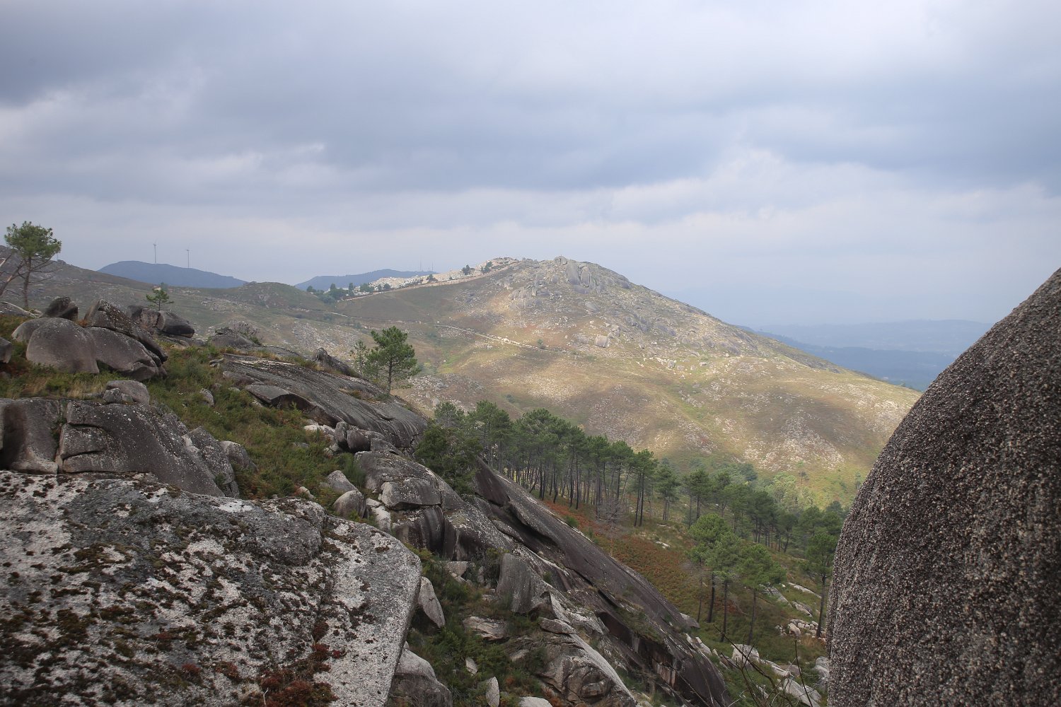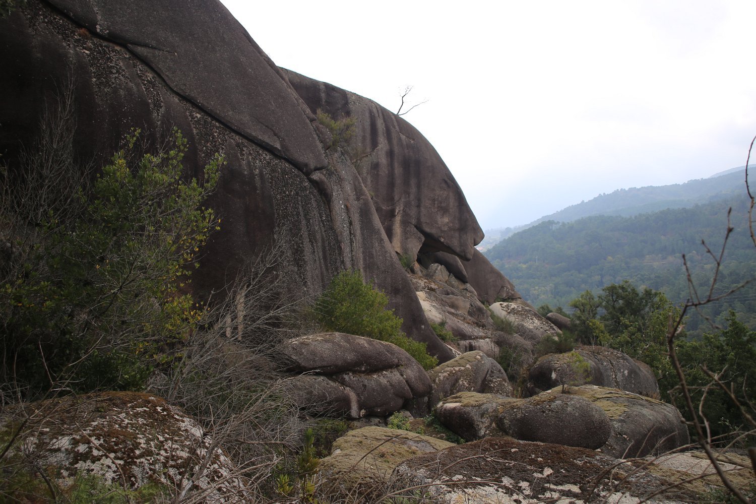 Cruzamos entretanto o “ribeiro dos Cortelhos” e após curta reorientação continuamos por terrenos varridos pelos fogos, agora arrasados pelas máquinas de rastos, para preparação de nova plantação florestal. À nossa volta, os enormes cabeços rochosos que emergem dispersos pela paisagem e as muitas explorações de granito ornamental que esventram os montes desfeando a paisagem.
