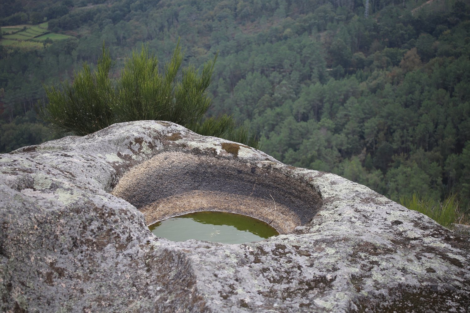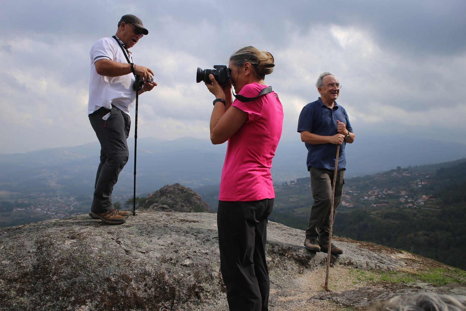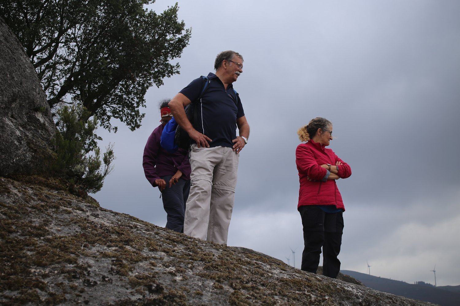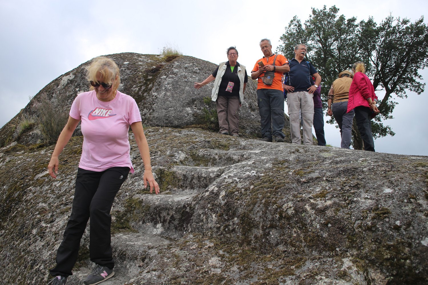 Mais um esforço para trepar as escadas cravadas na rocha e subimos até ao topo do afloramento rochoso para observar toda a paisagem circundante e também as “pias”, formações esculpidas no topo dos penedos, que teriam tido serventia na recolha da água das chuvas. O vento soprava forte e após curta observação e mais umas fotos regressamos à capela, onde nos esperavam os que se baldaram à derradeira subida.