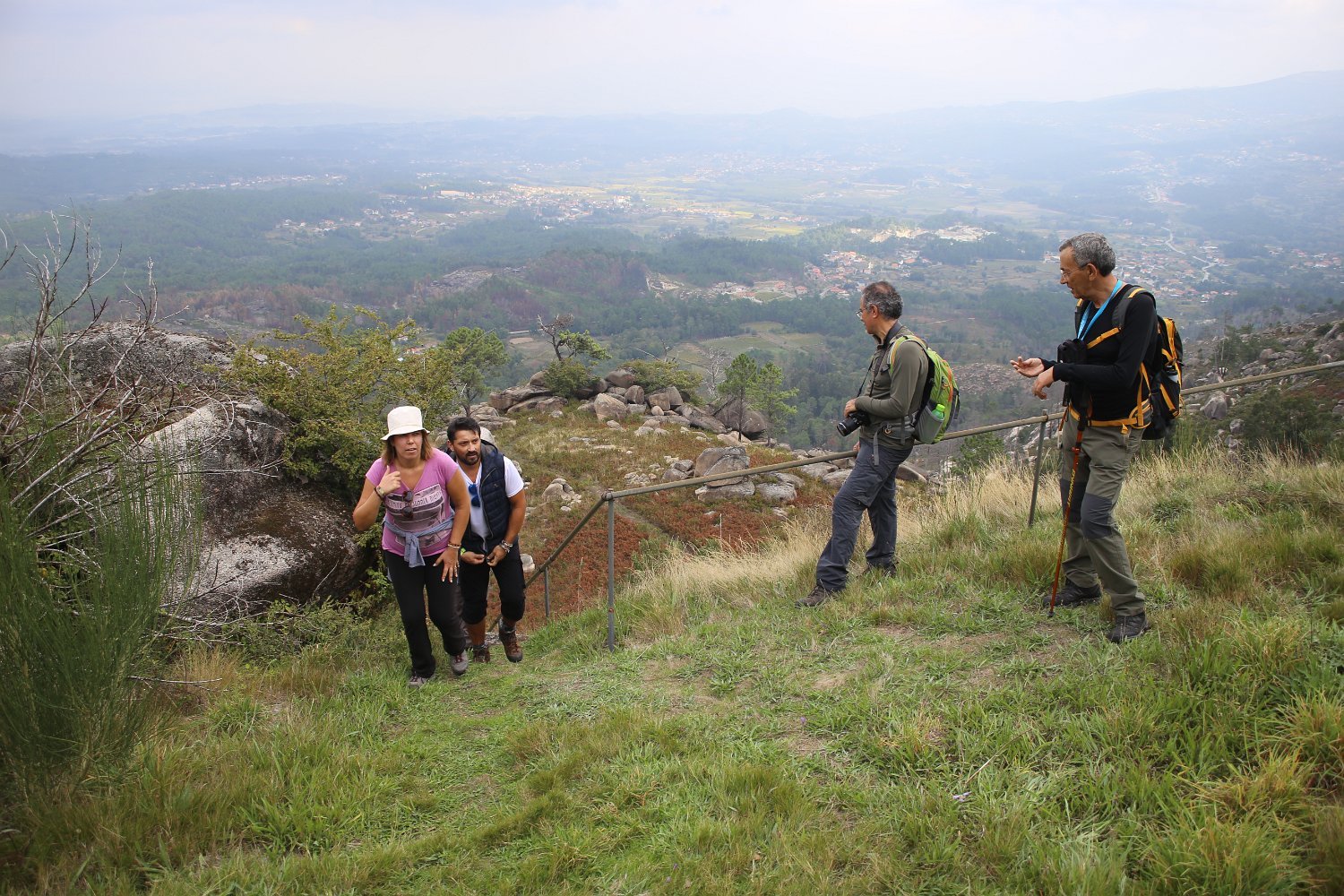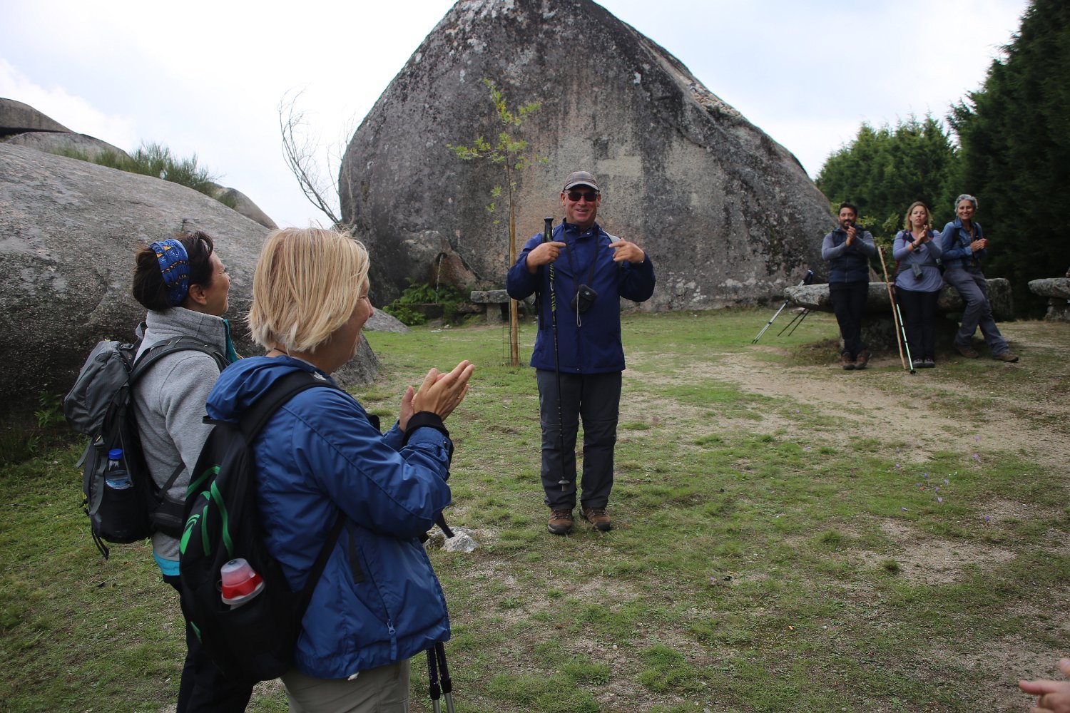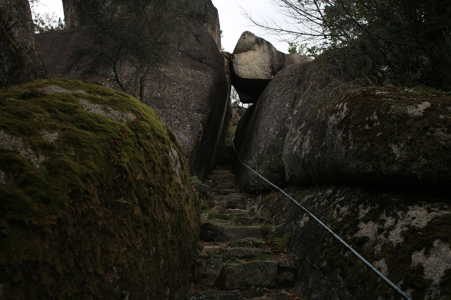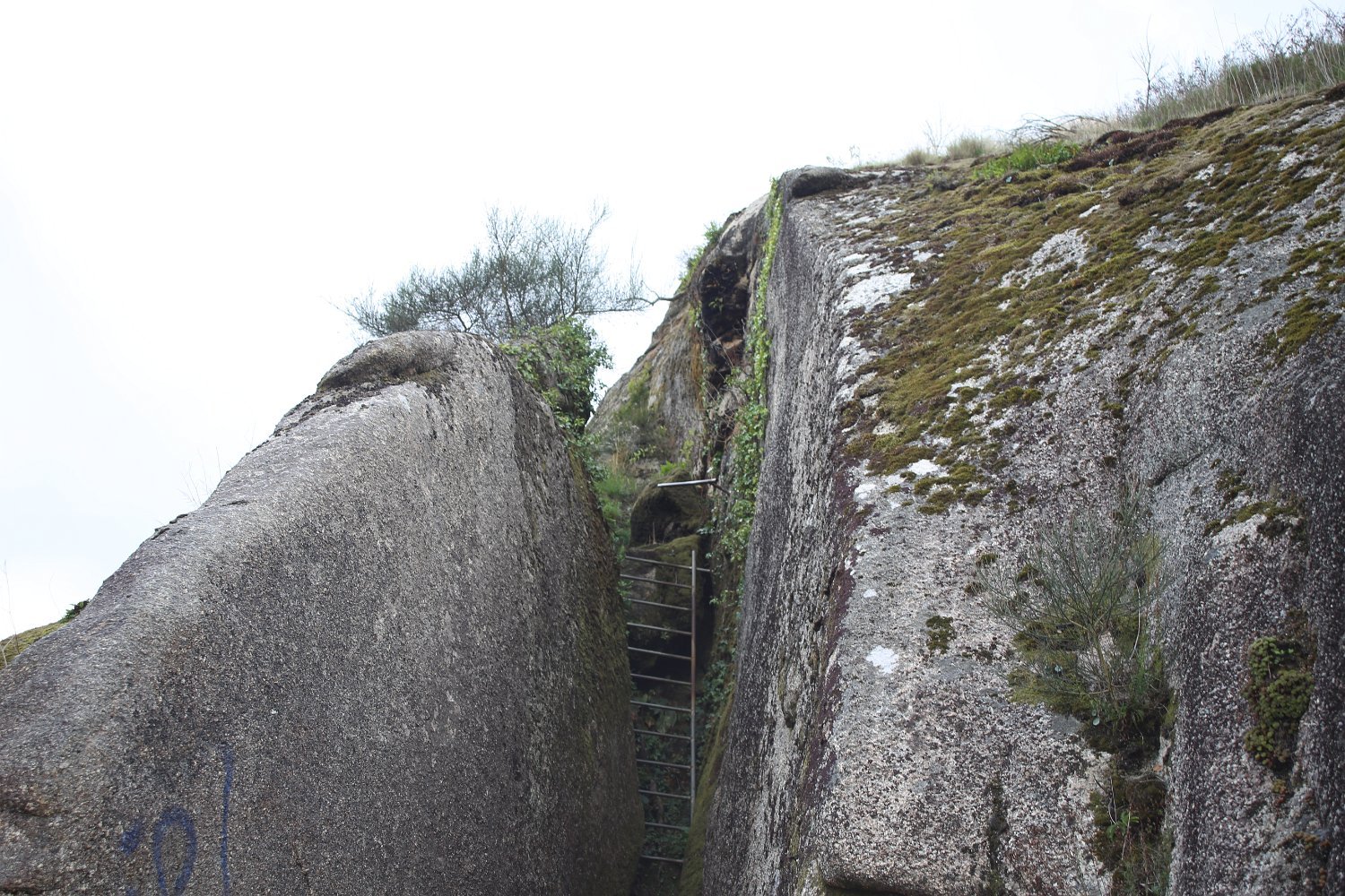 Mais um esforço para trepar as escadas cravadas na rocha e subimos até ao topo do afloramento rochoso para observar toda a paisagem circundante e também as “pias”, formações esculpidas no topo dos penedos, que teriam tido serventia na recolha da água das chuvas. O vento soprava forte e após curta observação e mais umas fotos regressamos à capela, onde nos esperavam os que se baldaram à derradeira subida.
